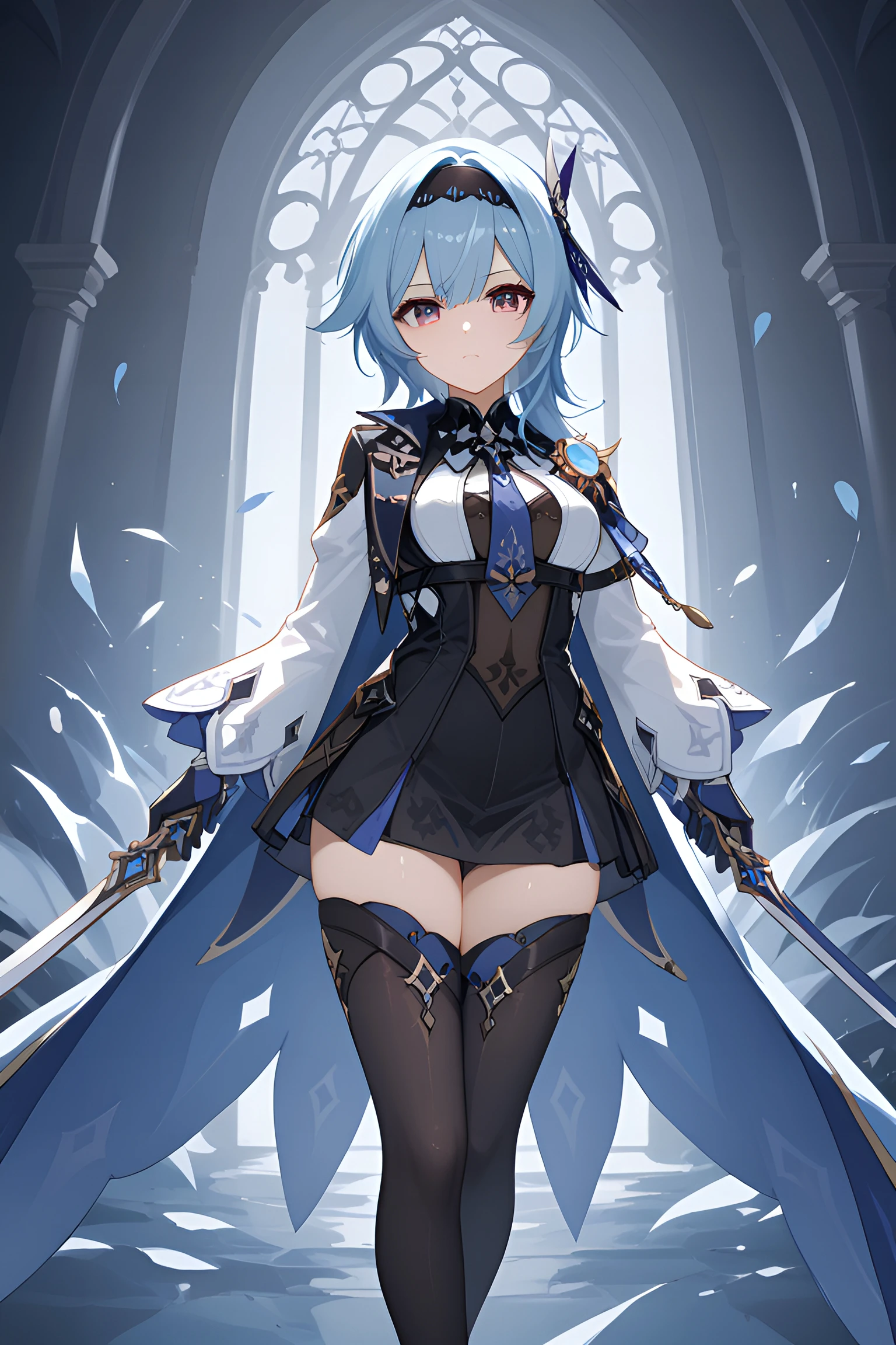 1girl, solo, blue hair, hairband, yellow eyes, vision (genshin impact), black hairband, hair ornament, medium hair, sidelocks, bangs, hair between eyes,