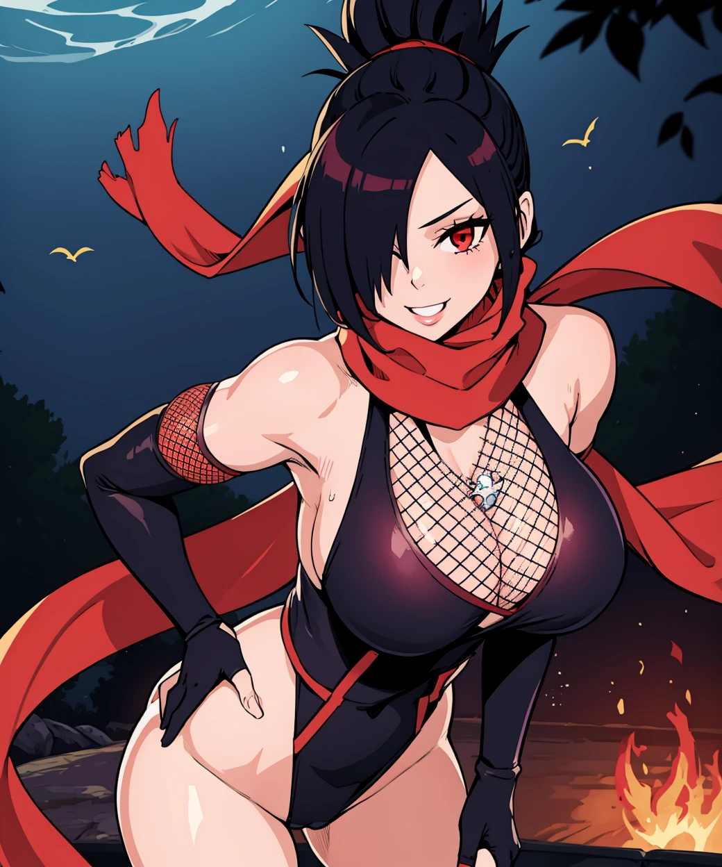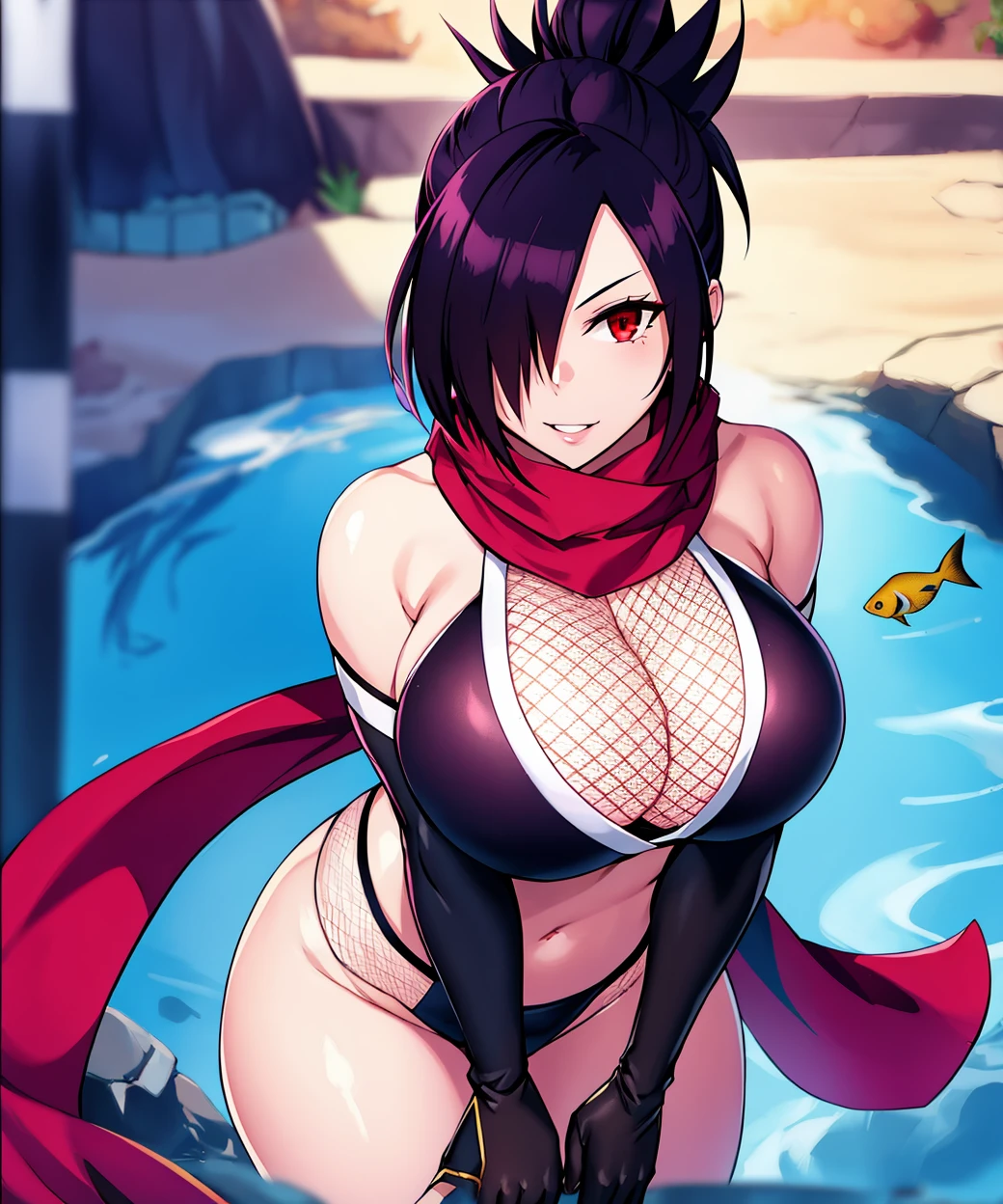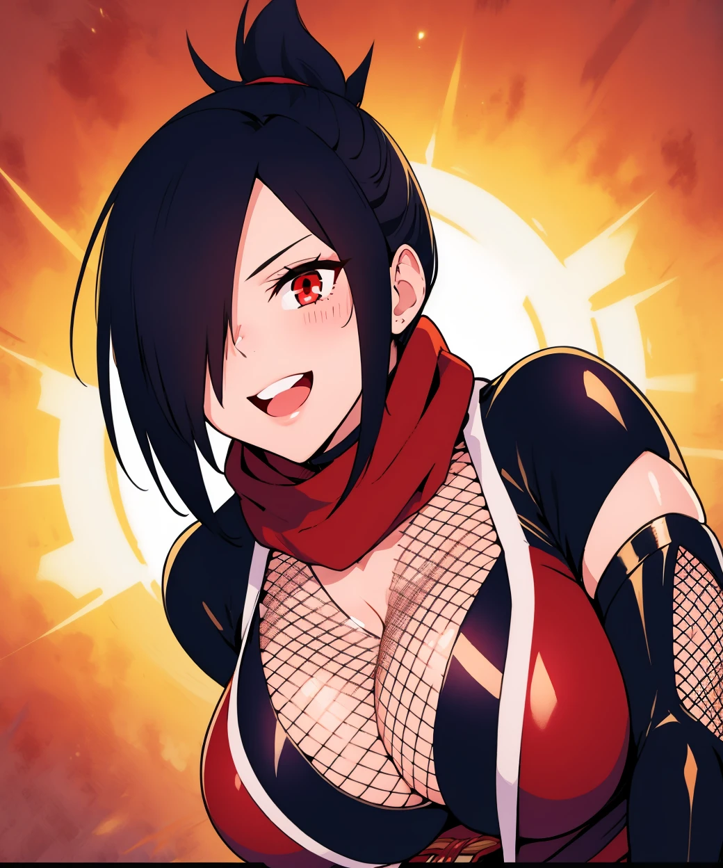 matoininja, hair over one eye, folded ponytail, black hair, red eyes, ninja, fishnet, ninja suit, scarf, elbow gloves