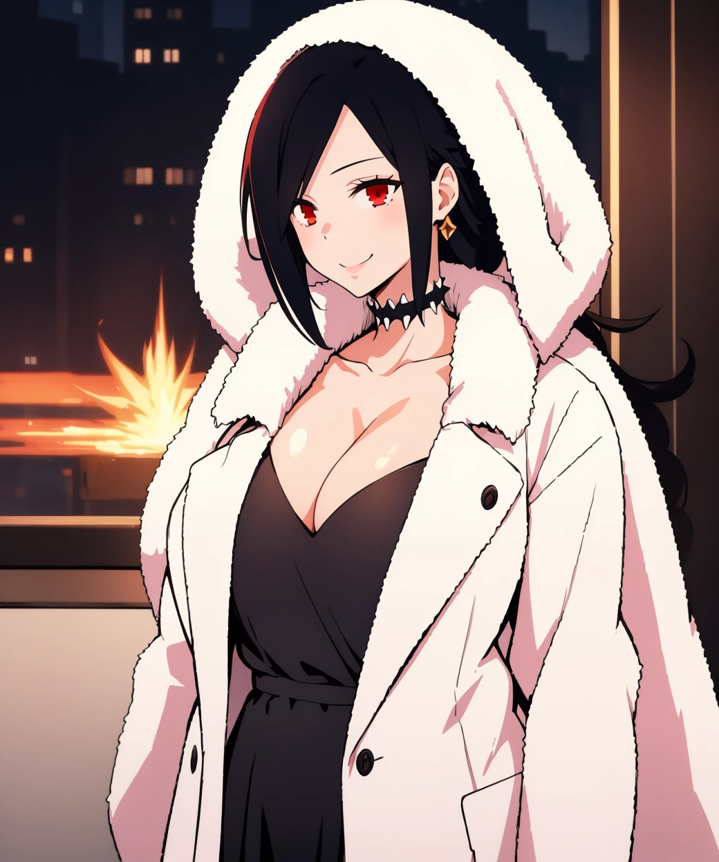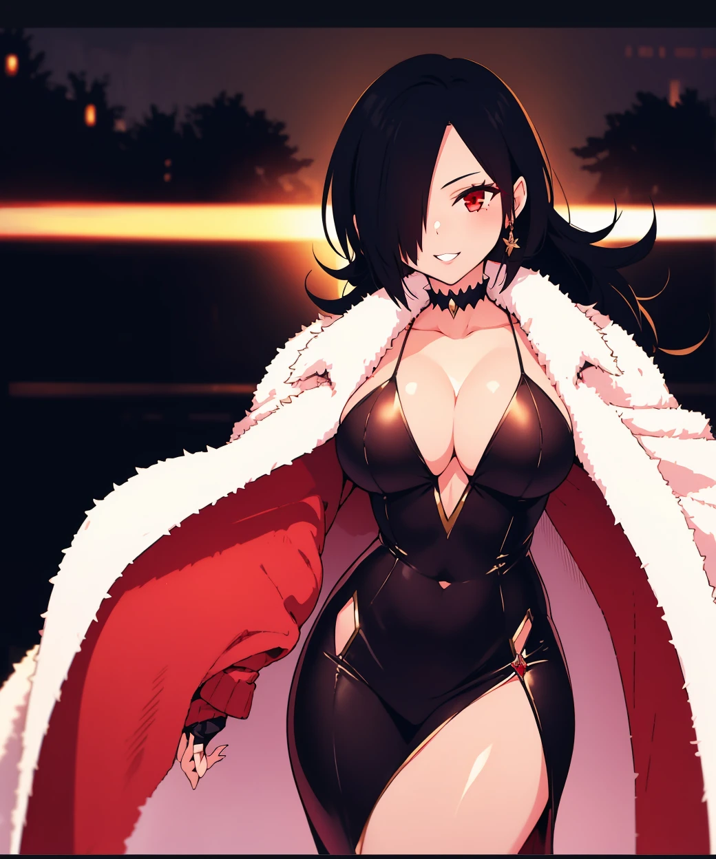 matoiboss, black hair, spiky hair, long hair, {hair over one eye | _},red eyes, black dress, fur trimmed coat, earrings