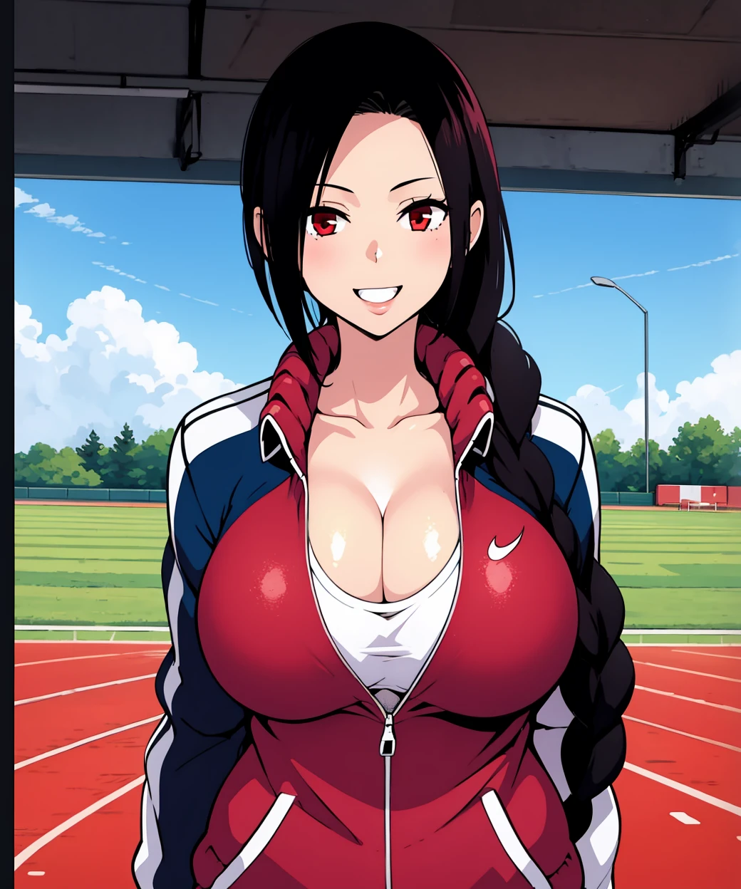 matoiteacher, very long braid, black hair, red eyes, track jacket, sports leggings, cleavage, wistle