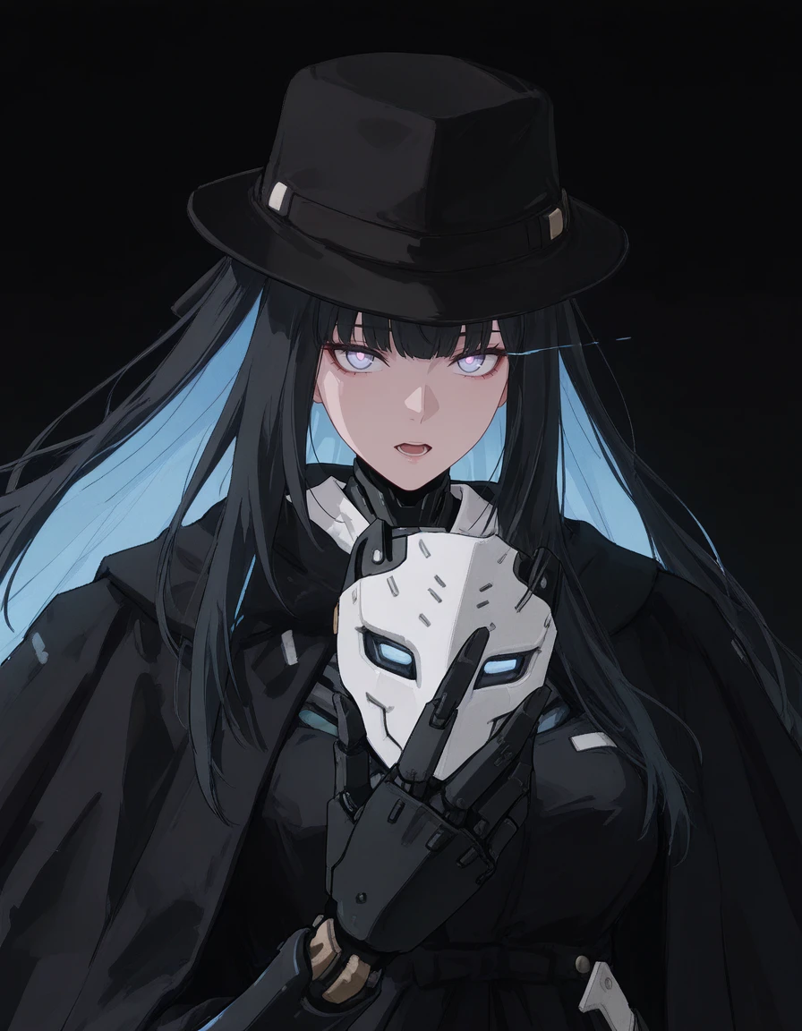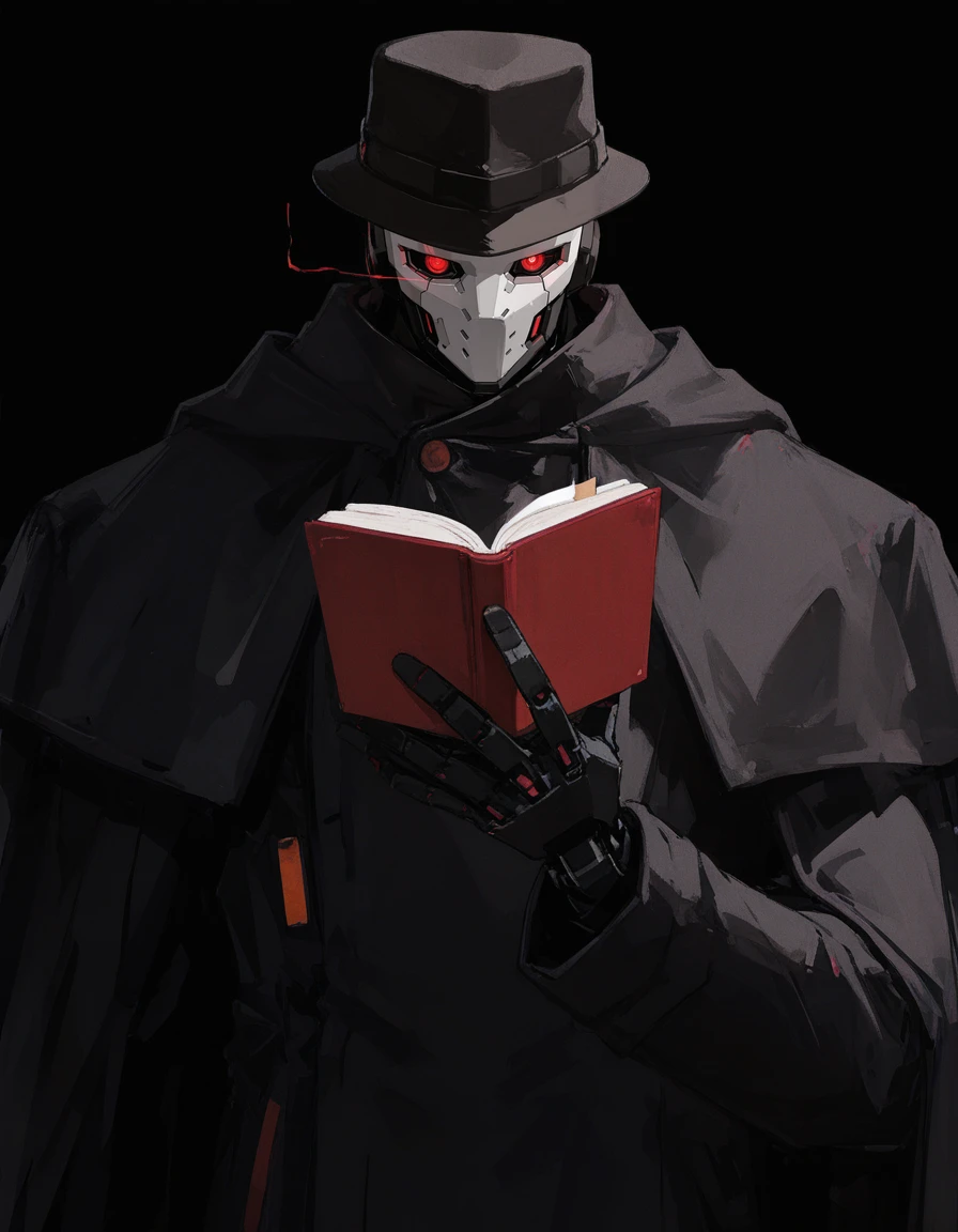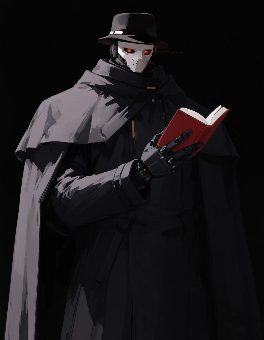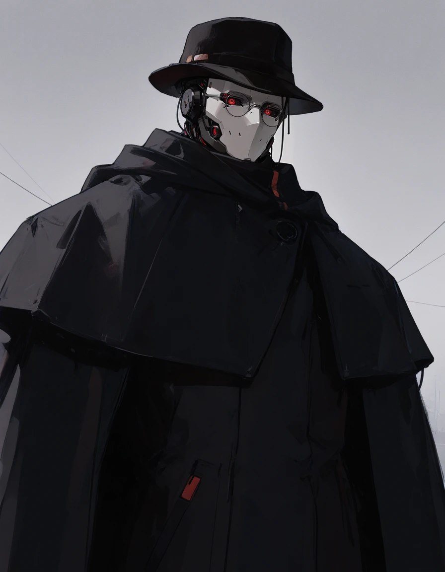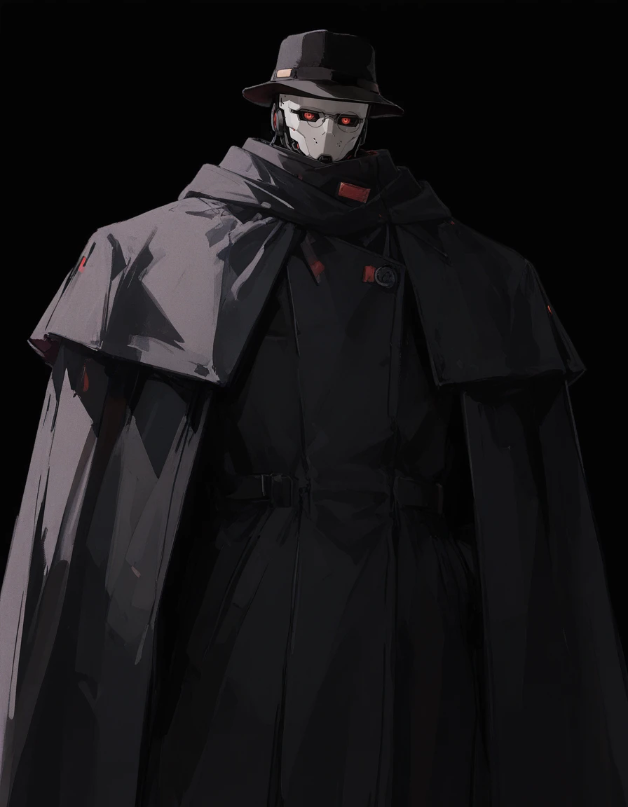 mai_pgr_gabriel,humanoid_robot,black_headwear,fedora,trench_coat,black_coat,black_cape,single_mechanical_arm,claws