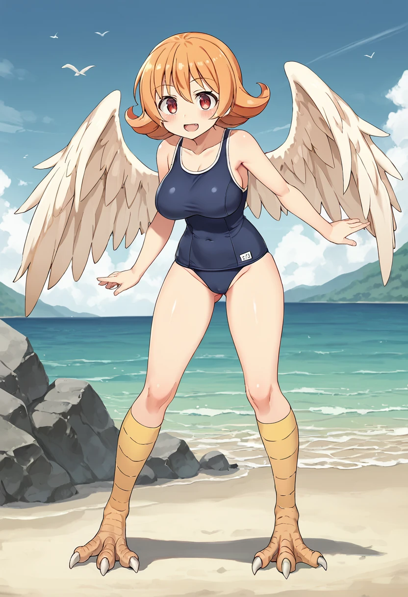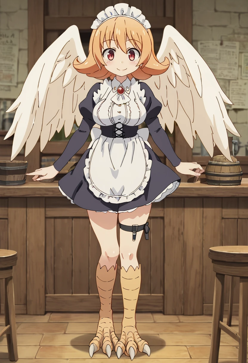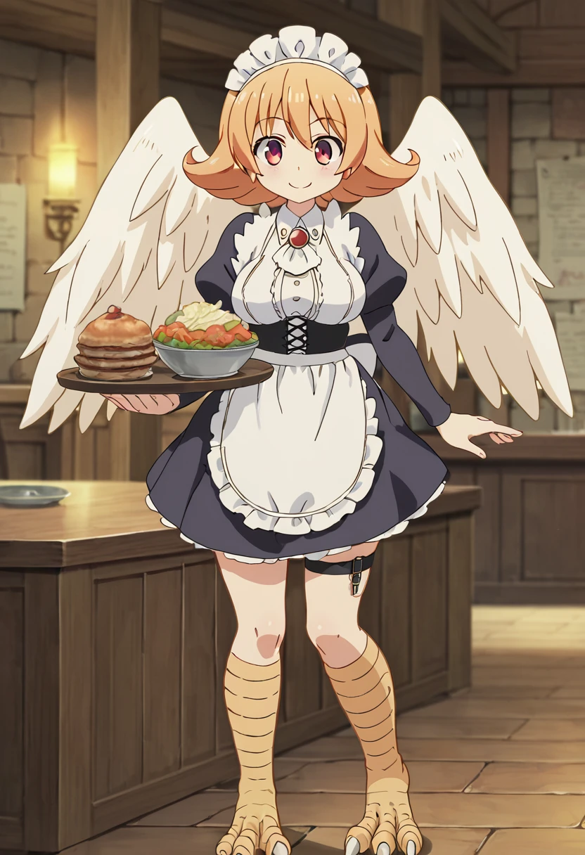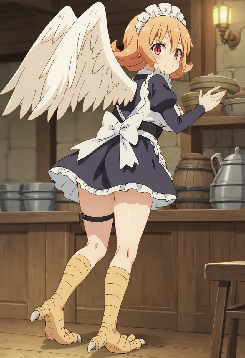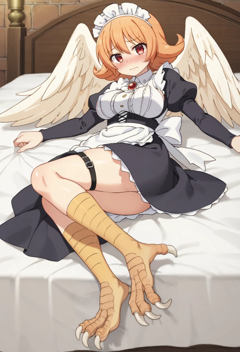 meidri \(interspecies reviewers\),monster girl,avian humanoid,red eyes,orange hair,headdress,(feathered wings:1.2),maid dress,juliet sleeves,white apron,thigh strap,yellow socks,(bird legs,monster toes:1.1)