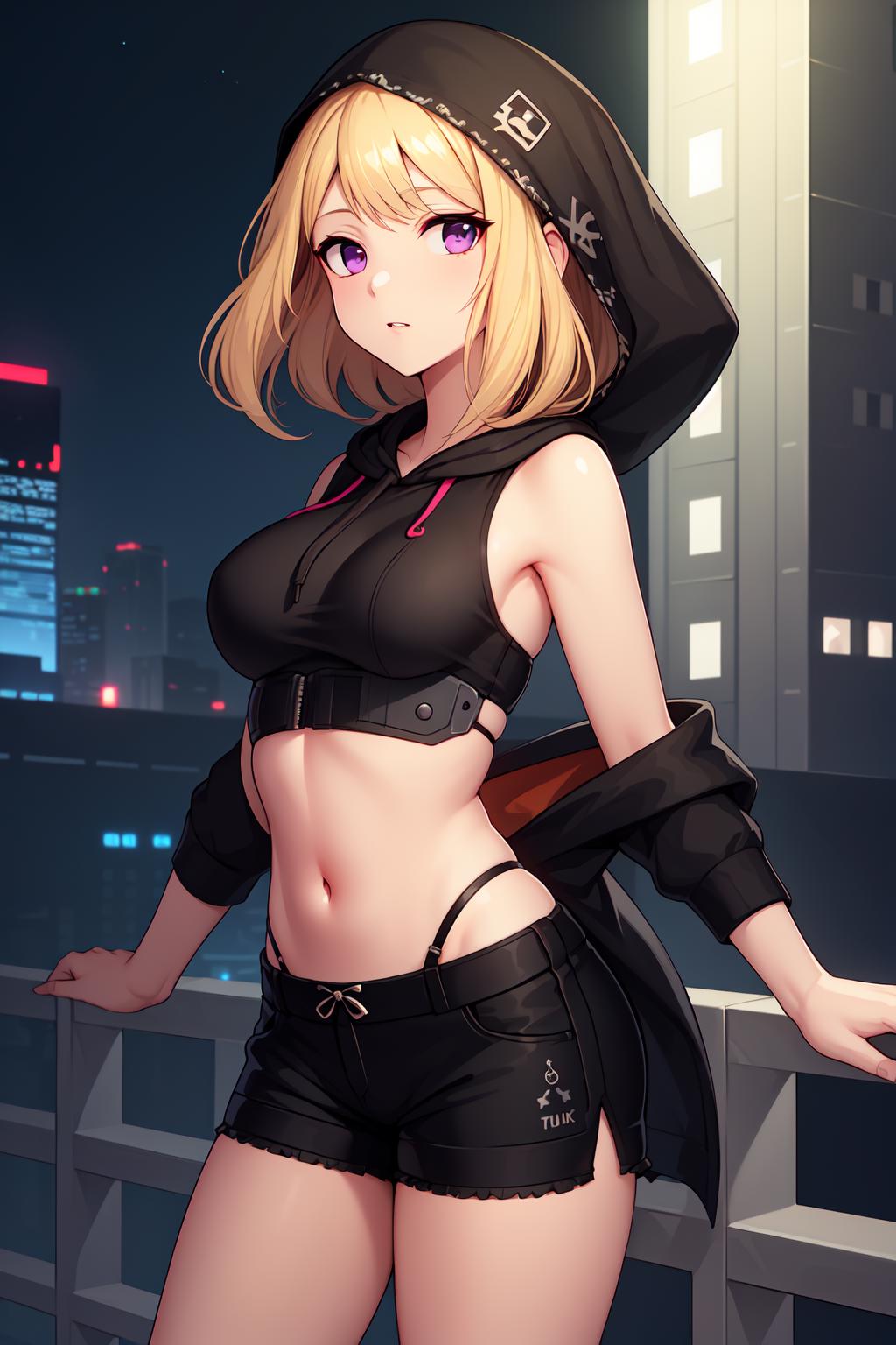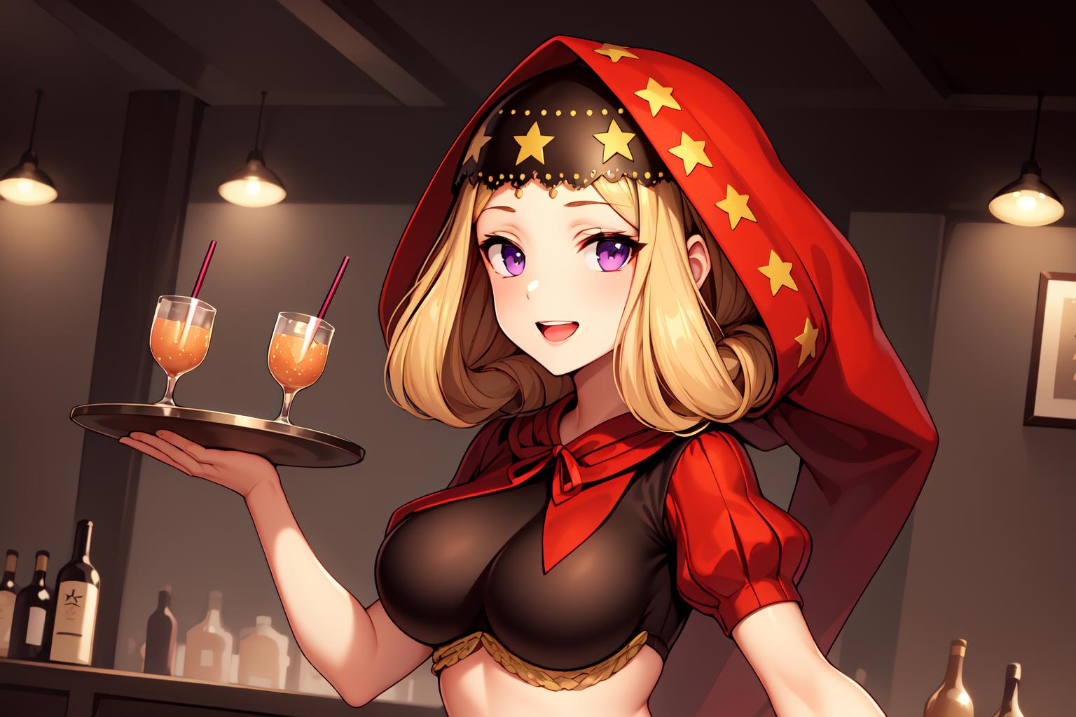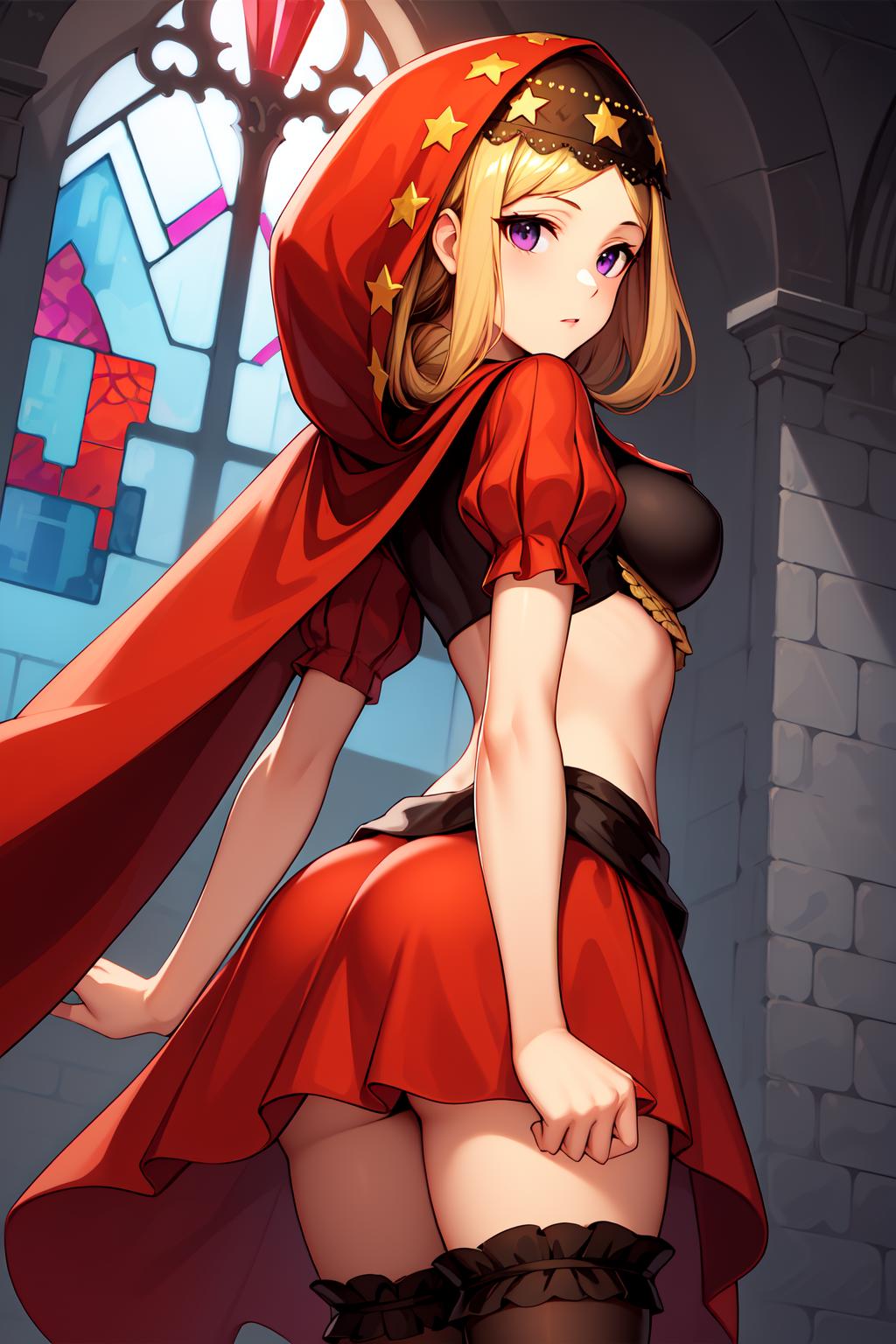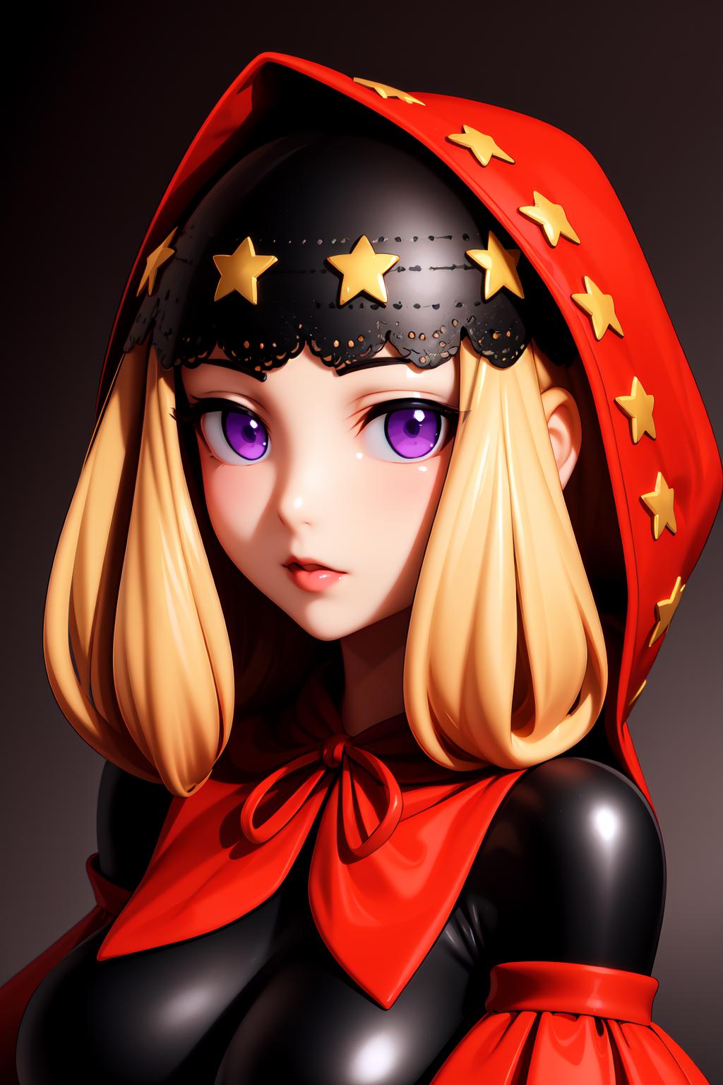 To prompt this character, enter "<lora:Velvetv3:strength>velvetos, red hood, black crop top with red puffy sleeves, star headdress, waist cape, vertical-striped stockings, high heels,"