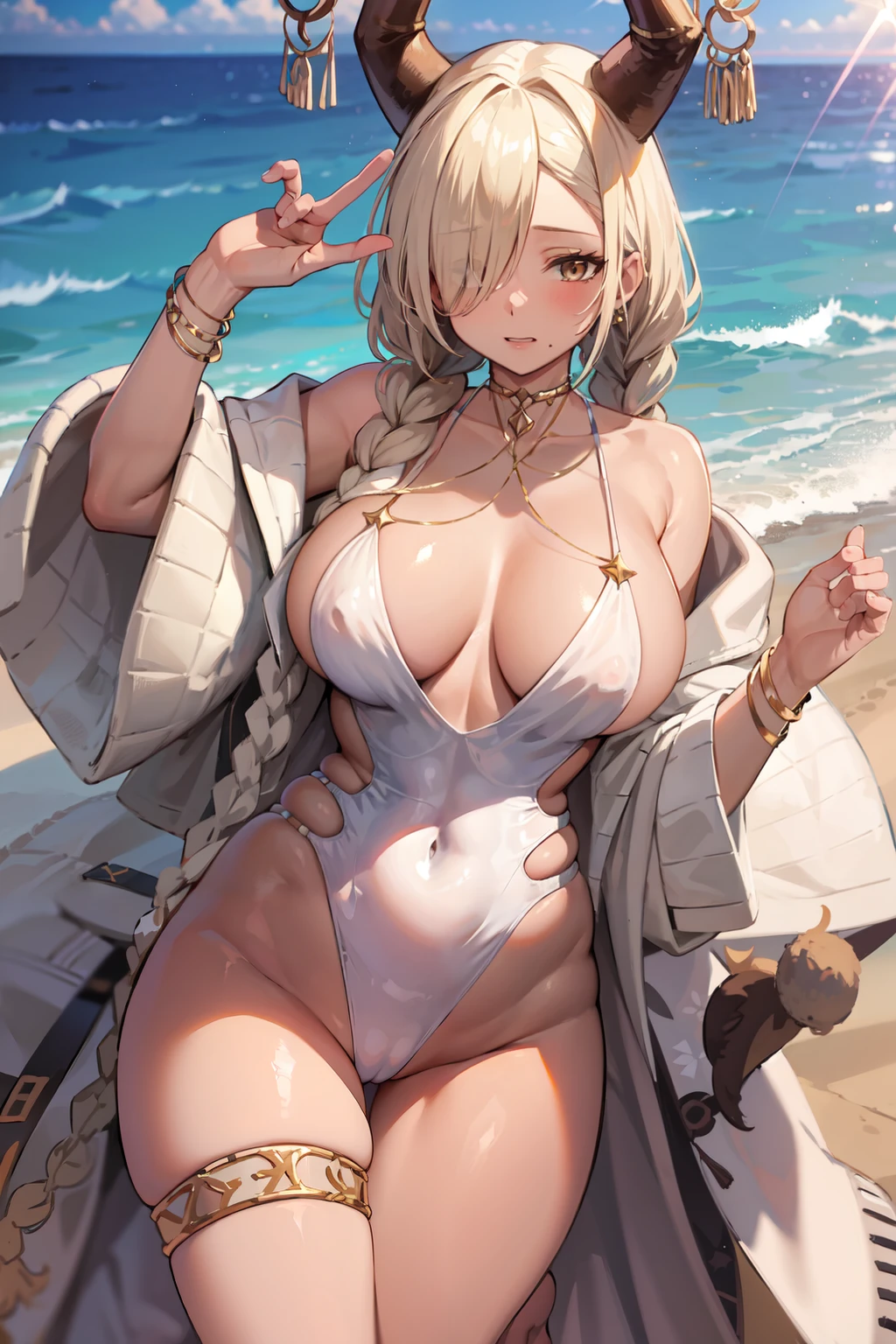 necklace, o-ring, halterneck, coat, off shoulder, wide sleeves, long sleeves, swimsuit cover-up, white one-piece swimsuit, highleg, thighlet, anklet, barefoot, bracelet,