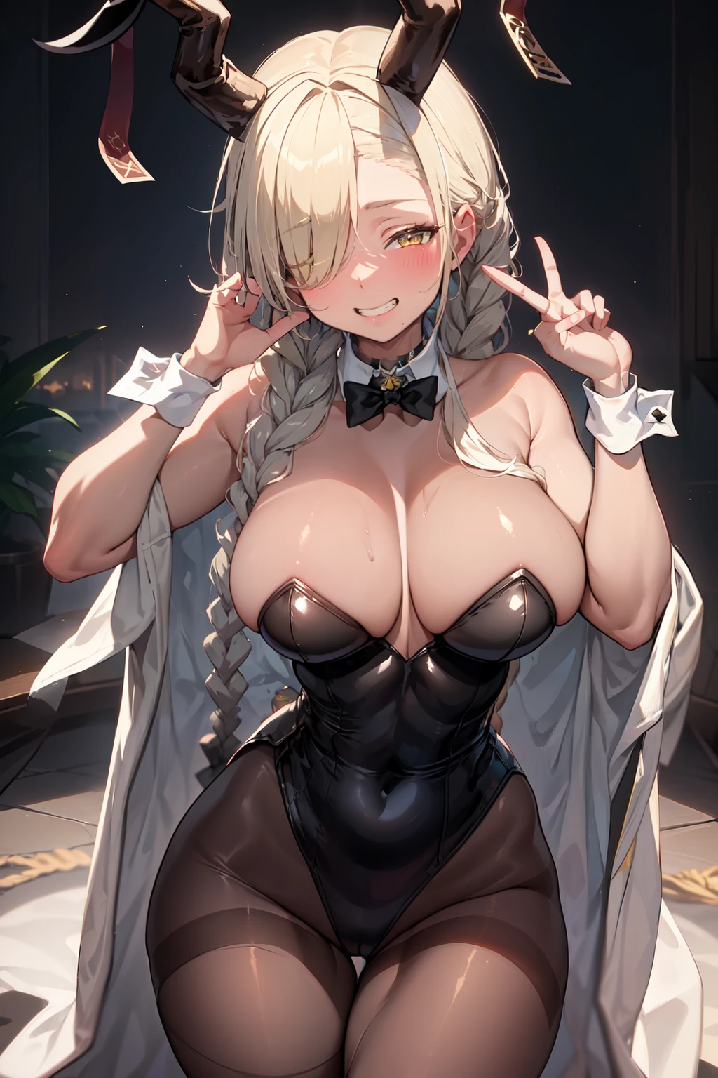 oowari, long hair, horns, hair over one eye, (dark skin:1.3), yellow eyes, twin braids, mole under mouth, horn ornament,