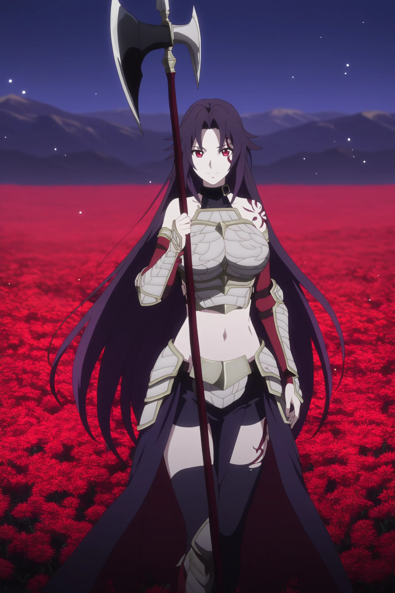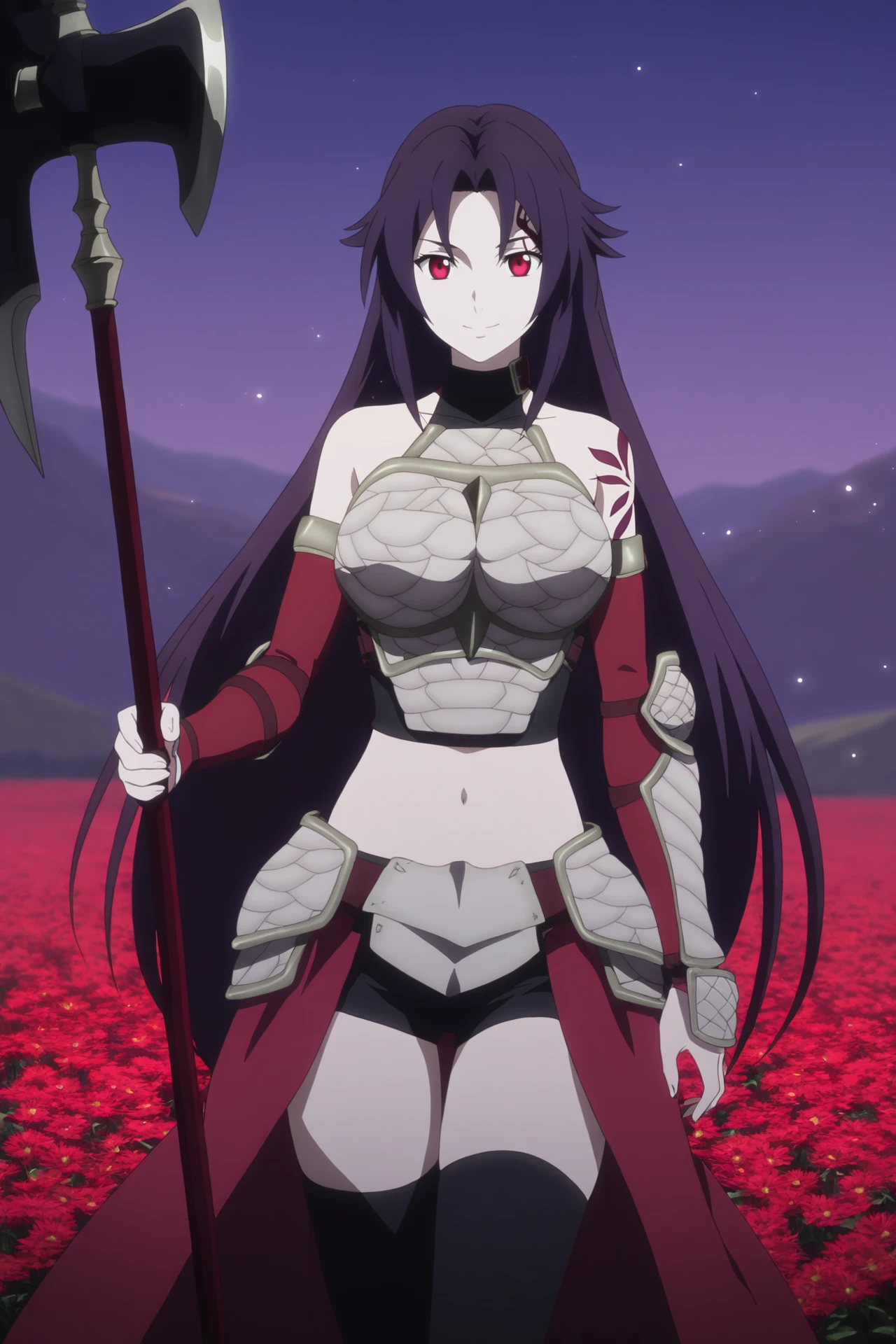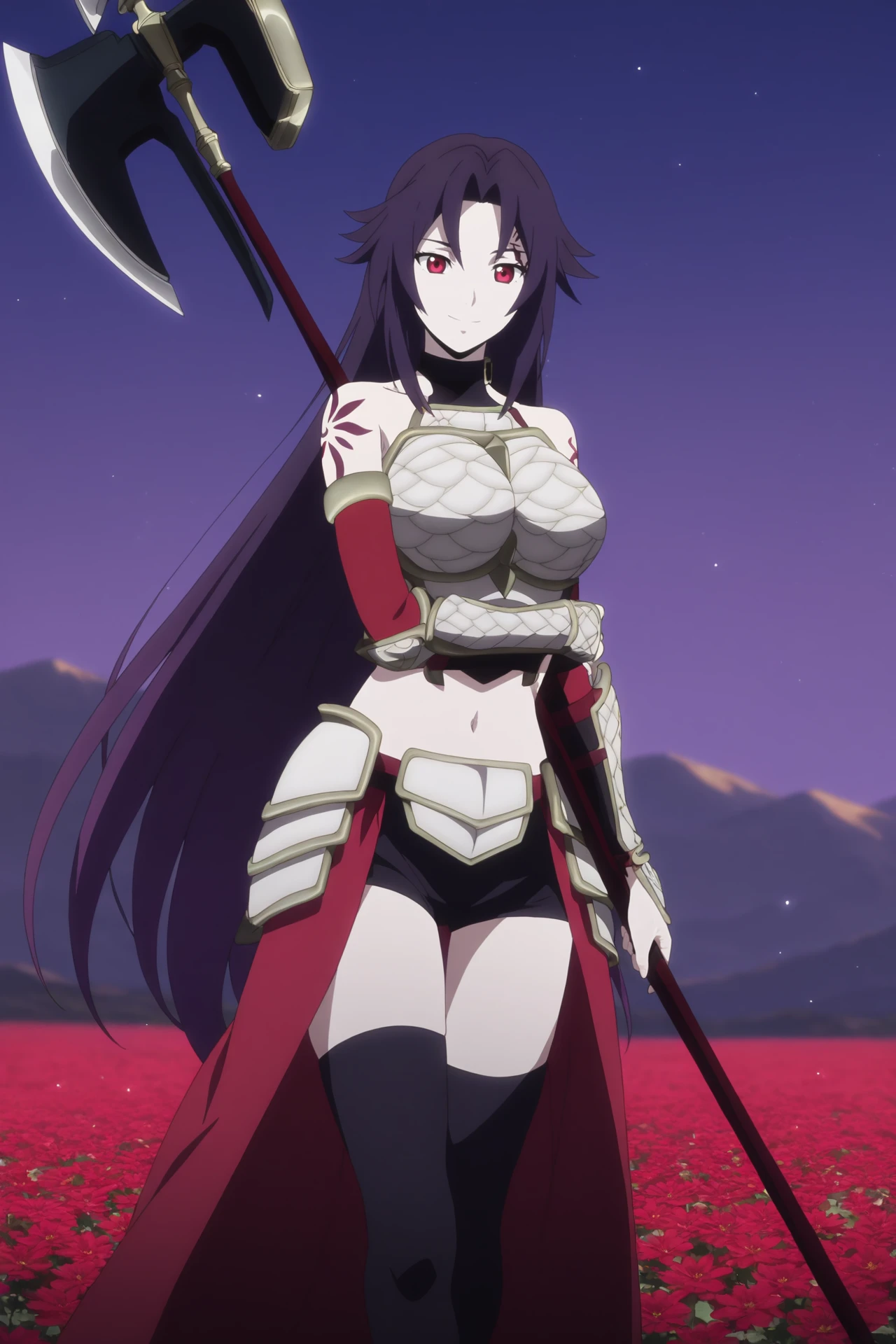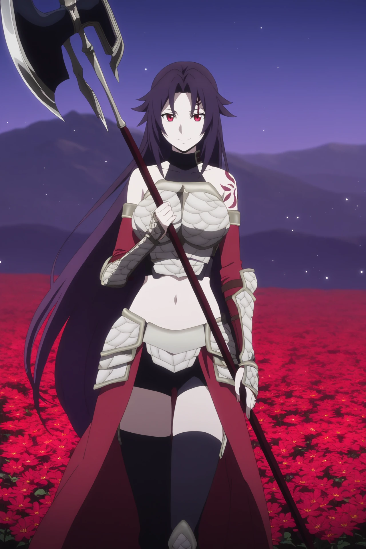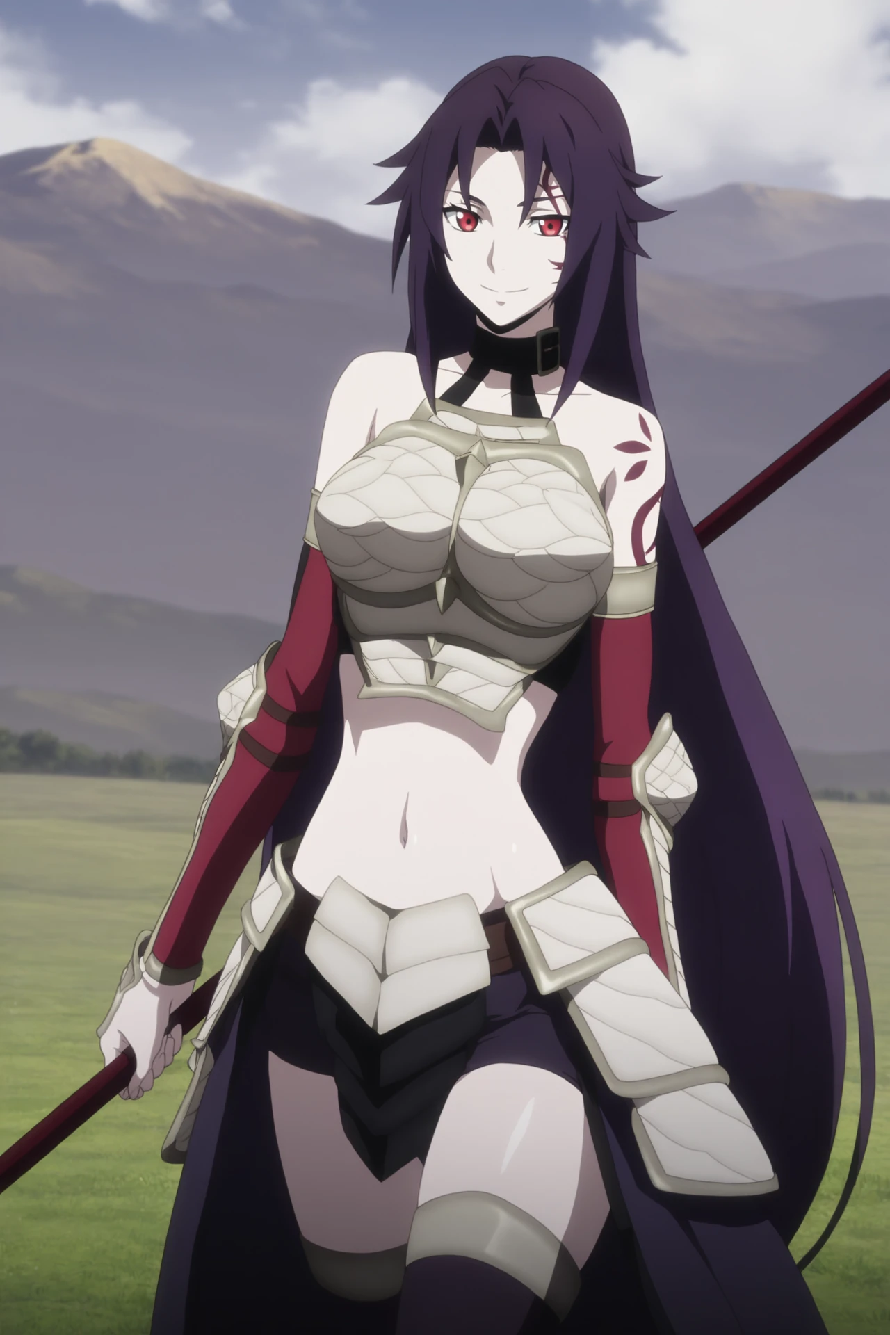 navel, bare shoulders, weapon, detached sleeves, midriff, holding weapon, armor, tattoo, polearm, breastplate, Faulds, boobplate, thighhighs