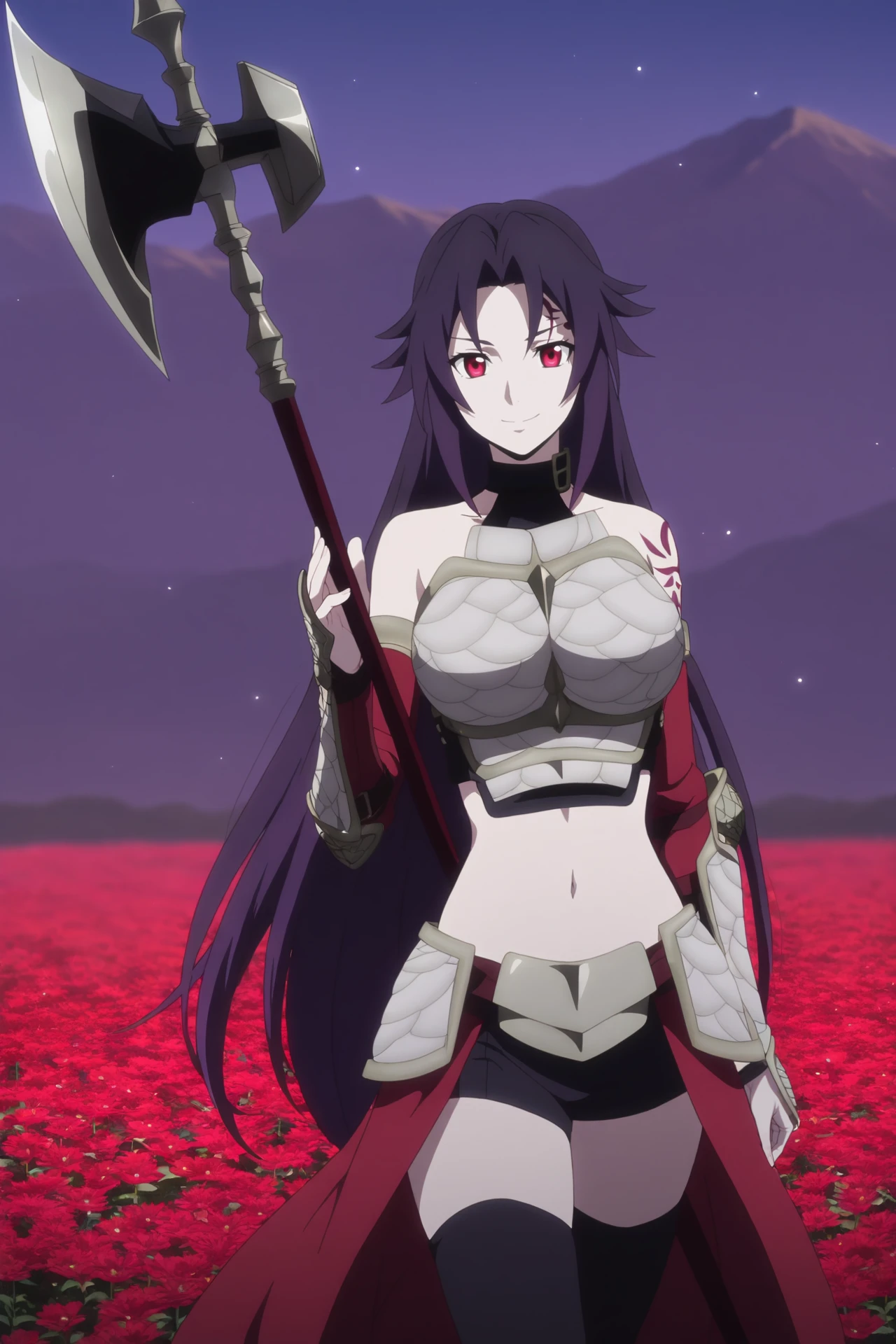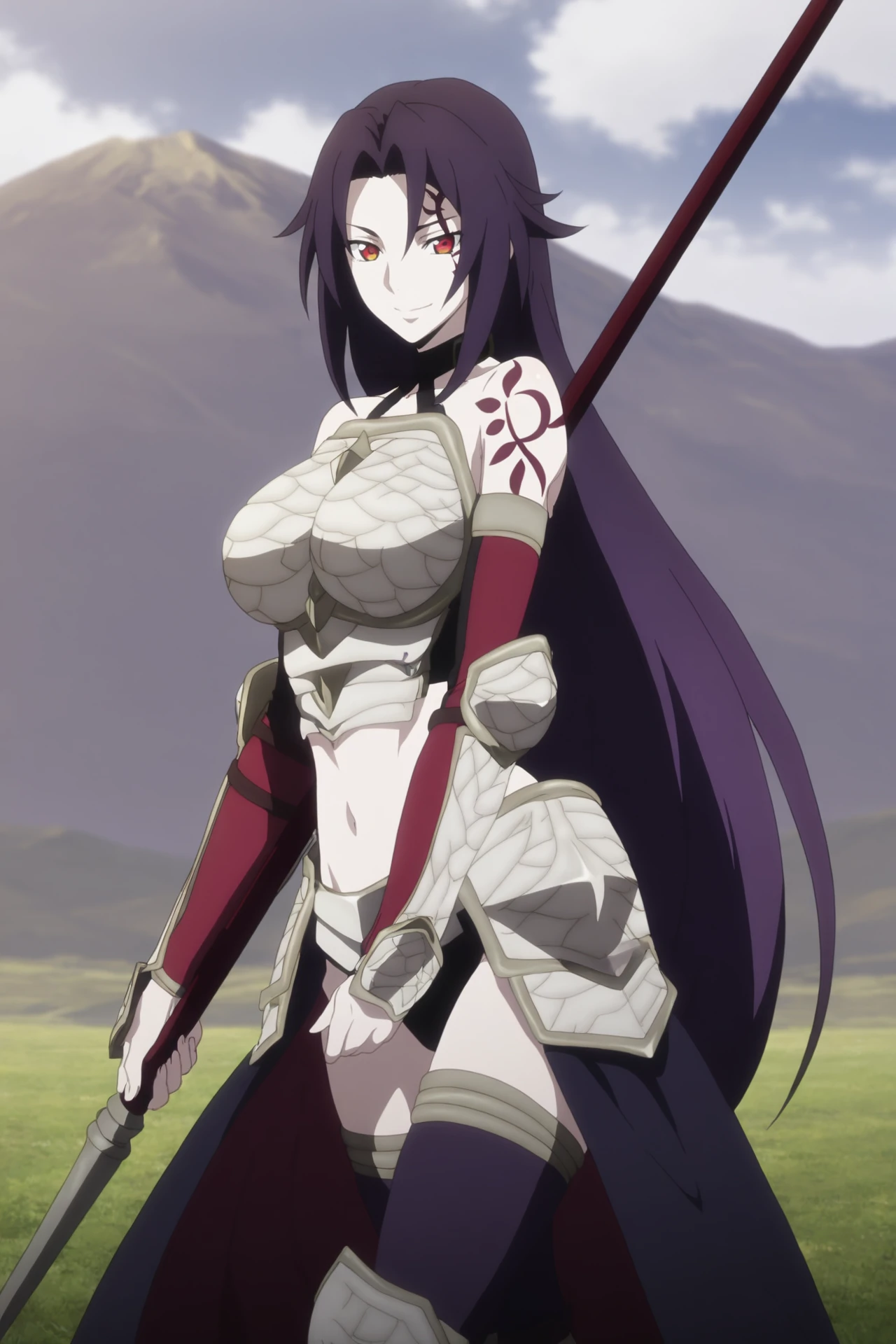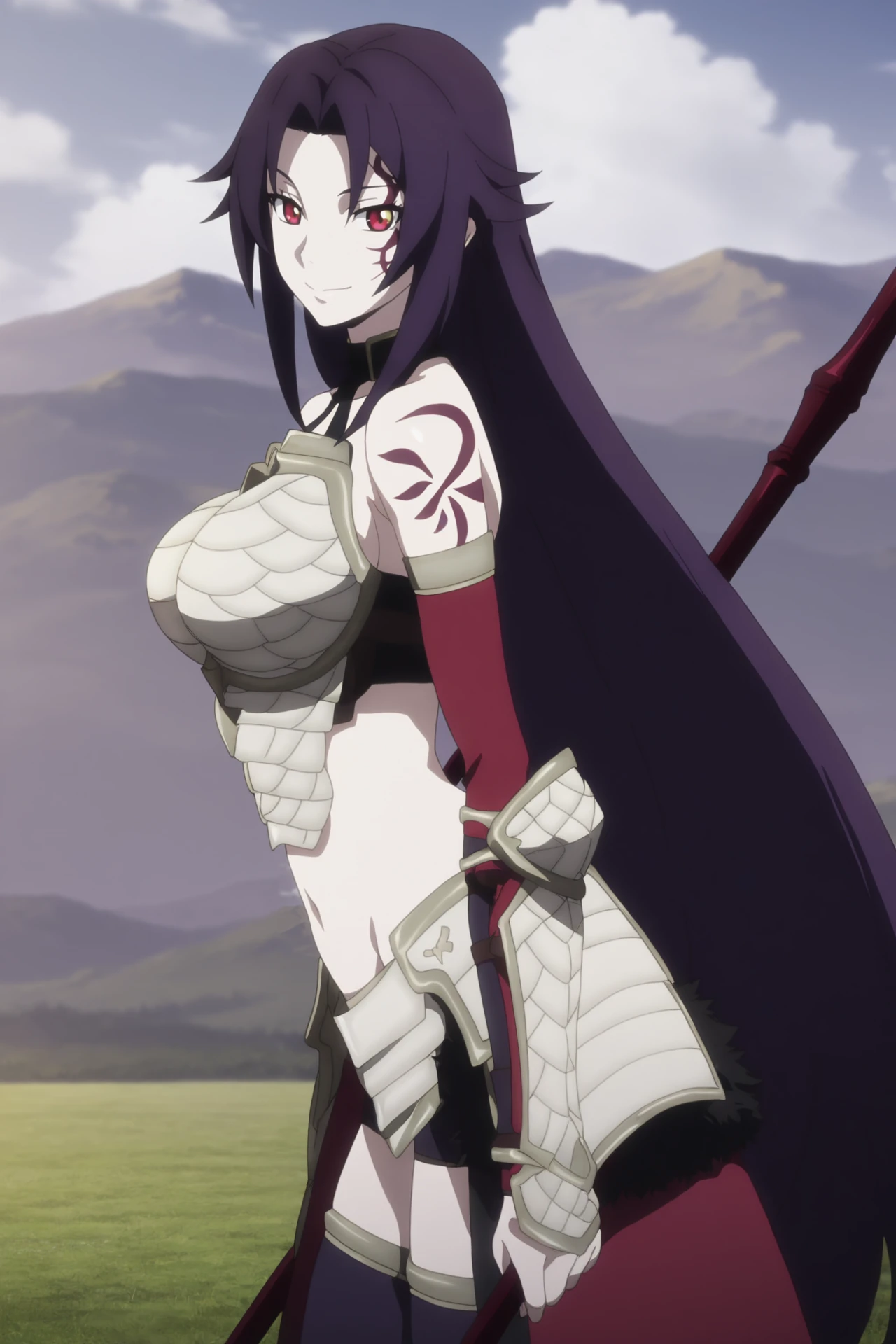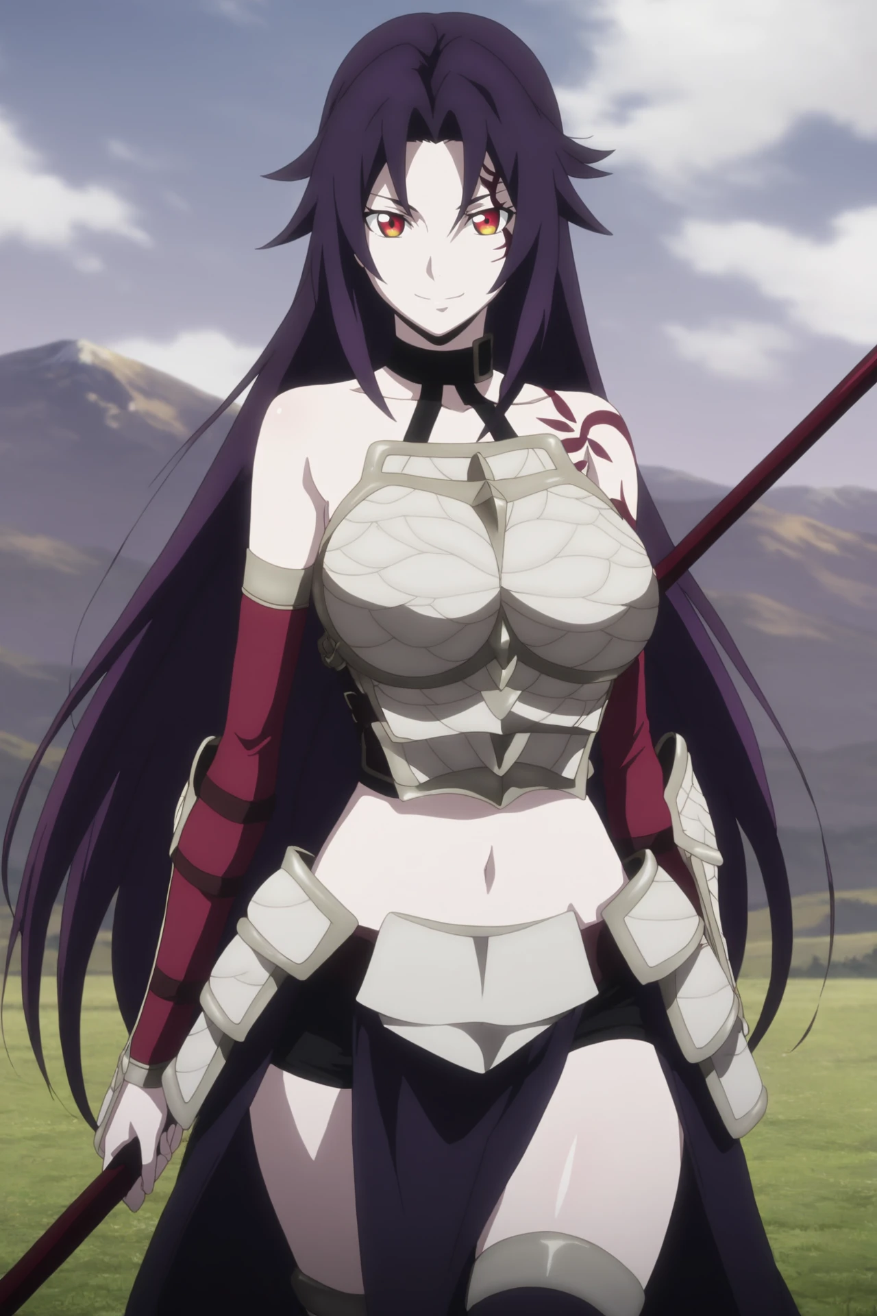 Aishela, long hair, large breasts, black hair, red eyes, very long hair, yellow eyes, purple hair, tattoo,