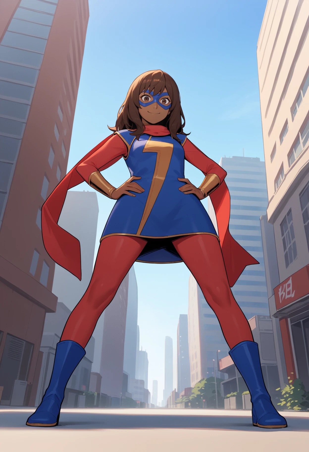 Outfit prompts: red scarf, blue short dress, red pantyhose, bracers, blue boots