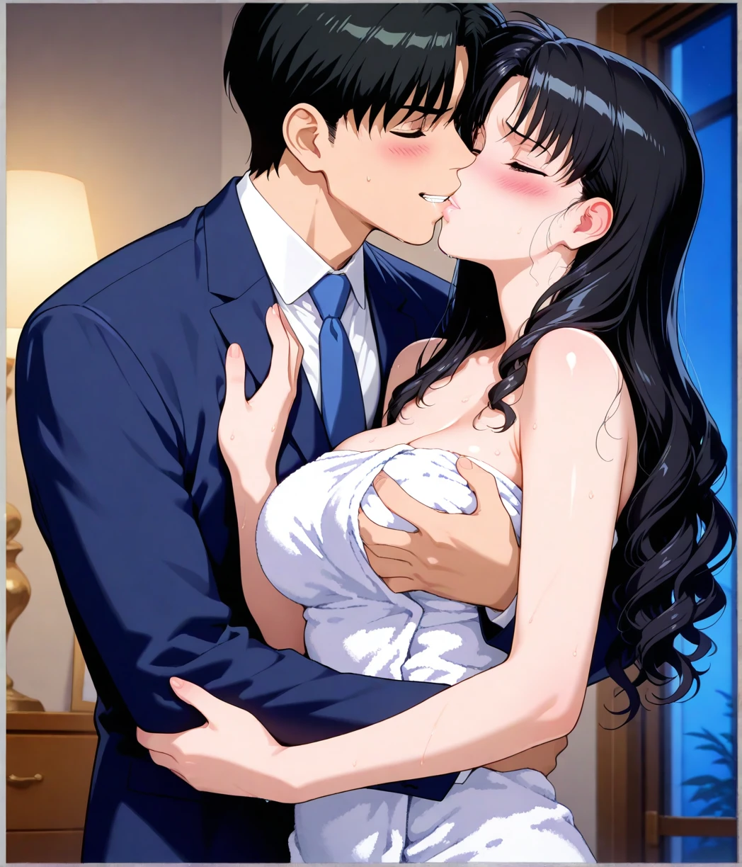 Shintei(Yu-no), ayumi_arima,Arima_Ayumi(YU-NO), long hair, large breasts, hair ornament, circlet, jewelry, japanese clothes, , cleavage, , long sleeves, wide sleeves, black belt, white panties, hair ornament, facial mark, dress, long sleeves, white_clothes,(see-through clothes:0.6,)