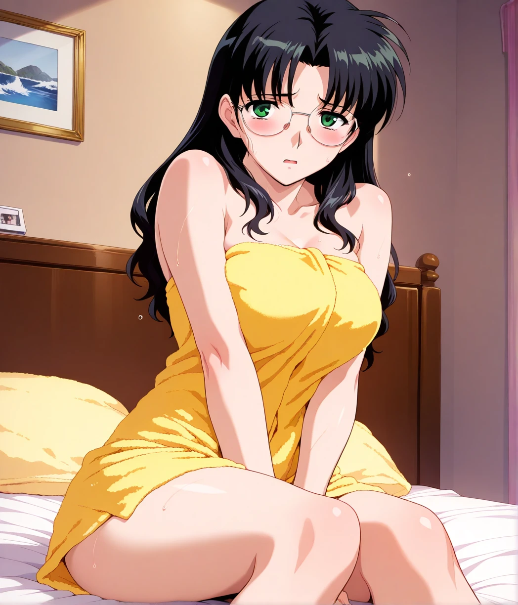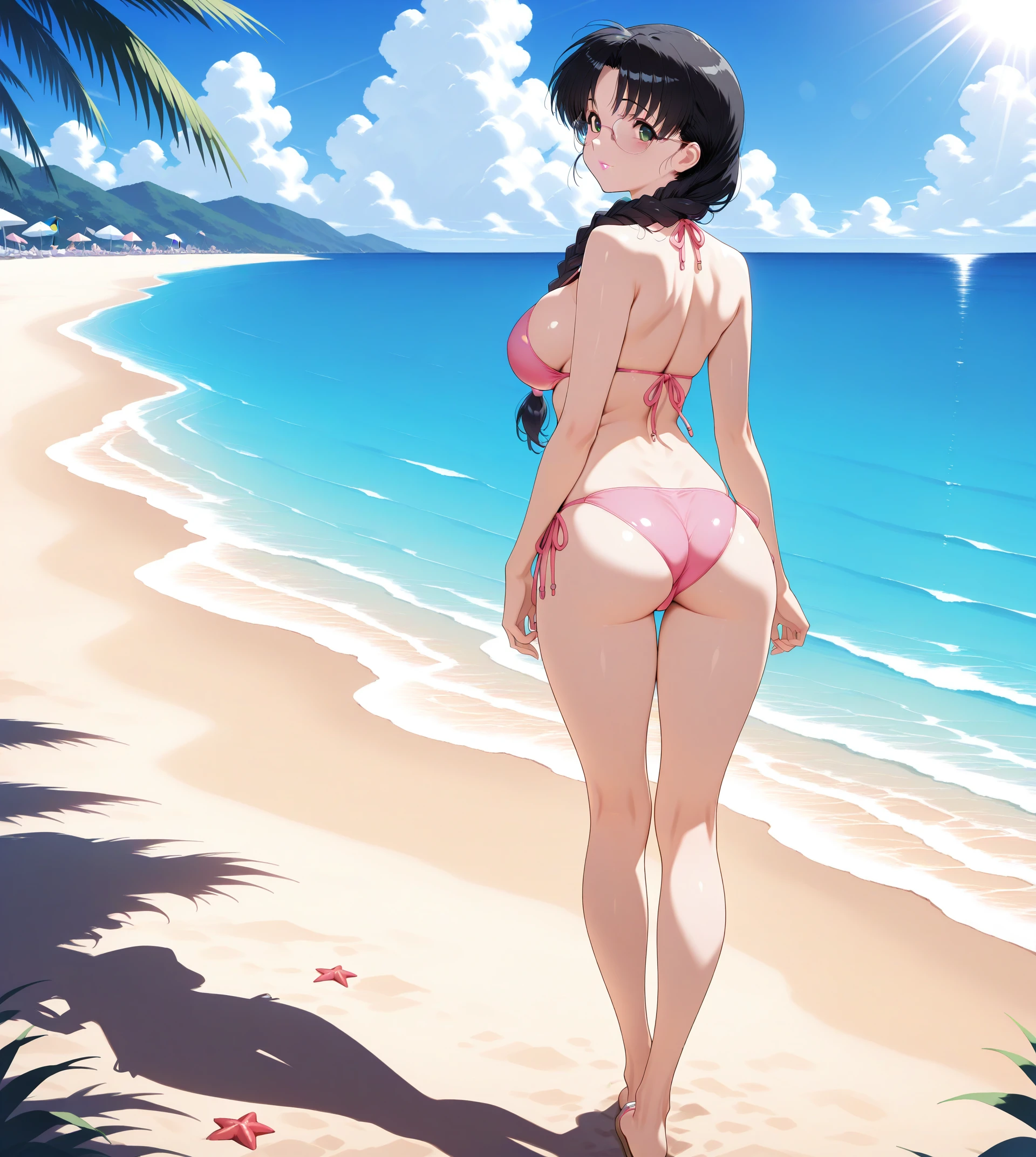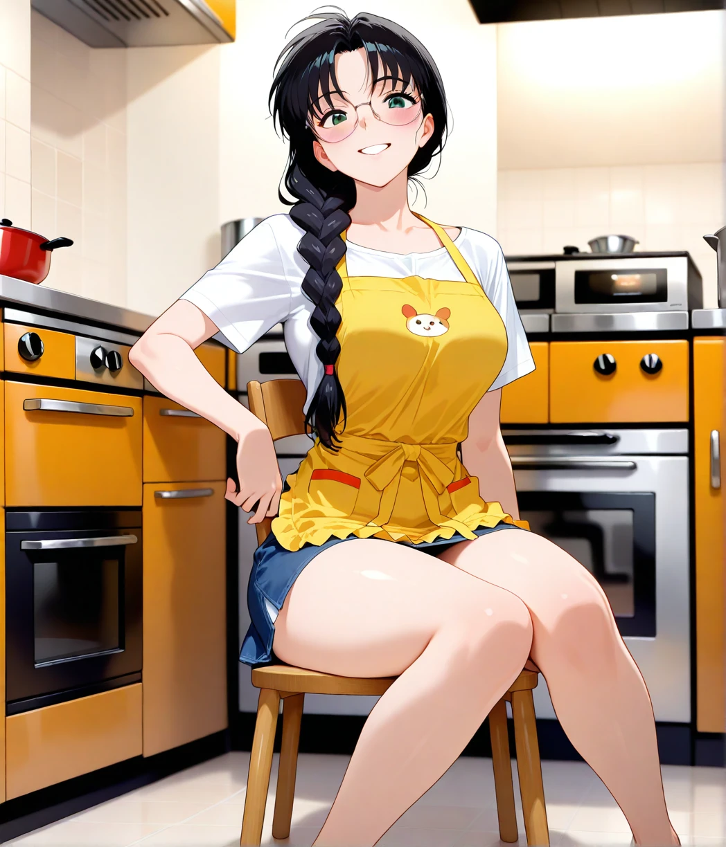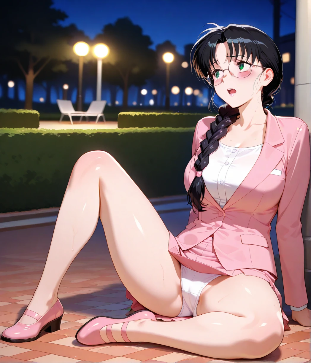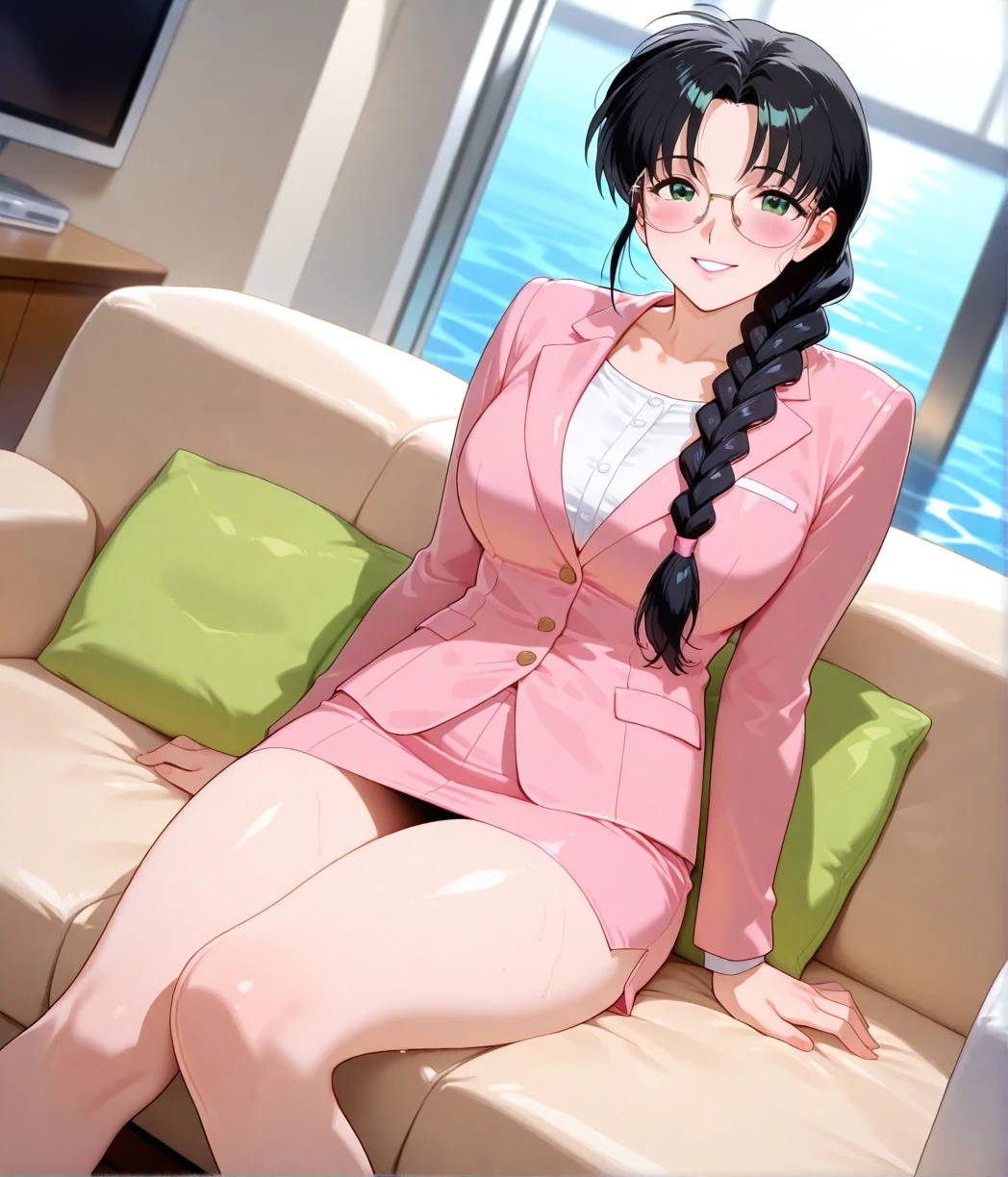 arima_ayumi, long_hair,black_hair,green eyes,25_year_old woman, mature female,large_, one pigtail,pink lip, glasses,pink suit,one braid,short skirt,hair over shoulder, single braid,braided ponytail,