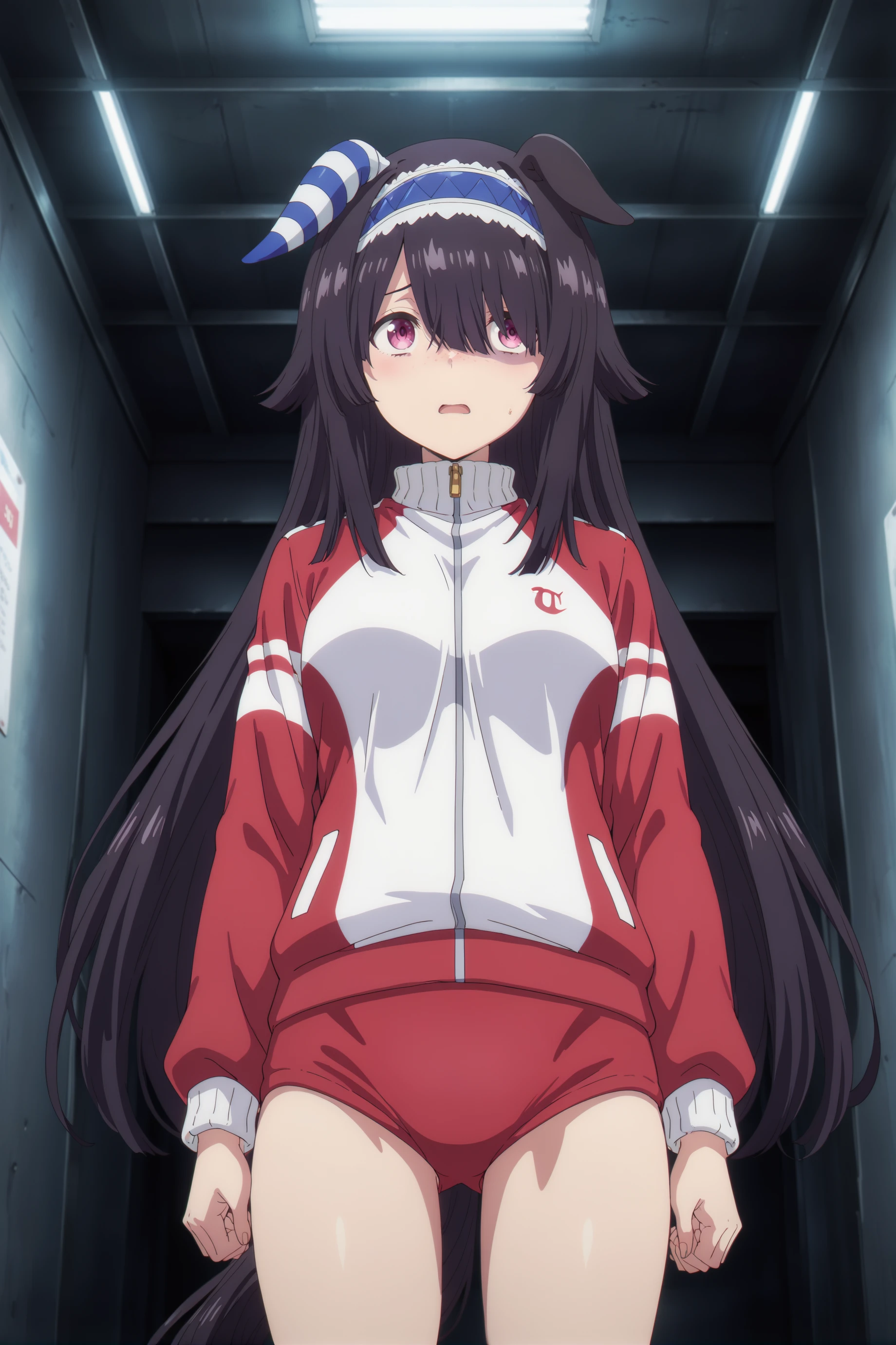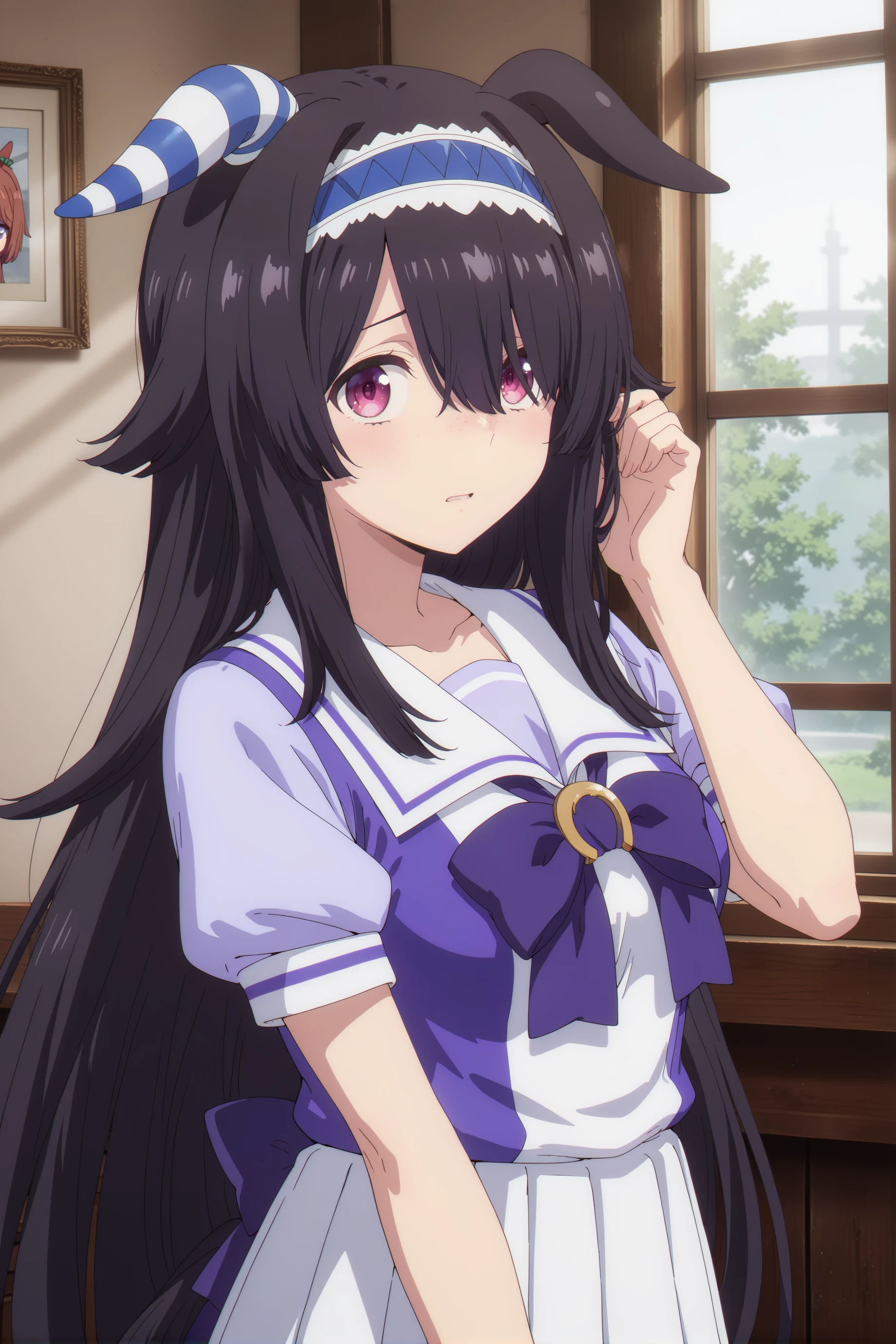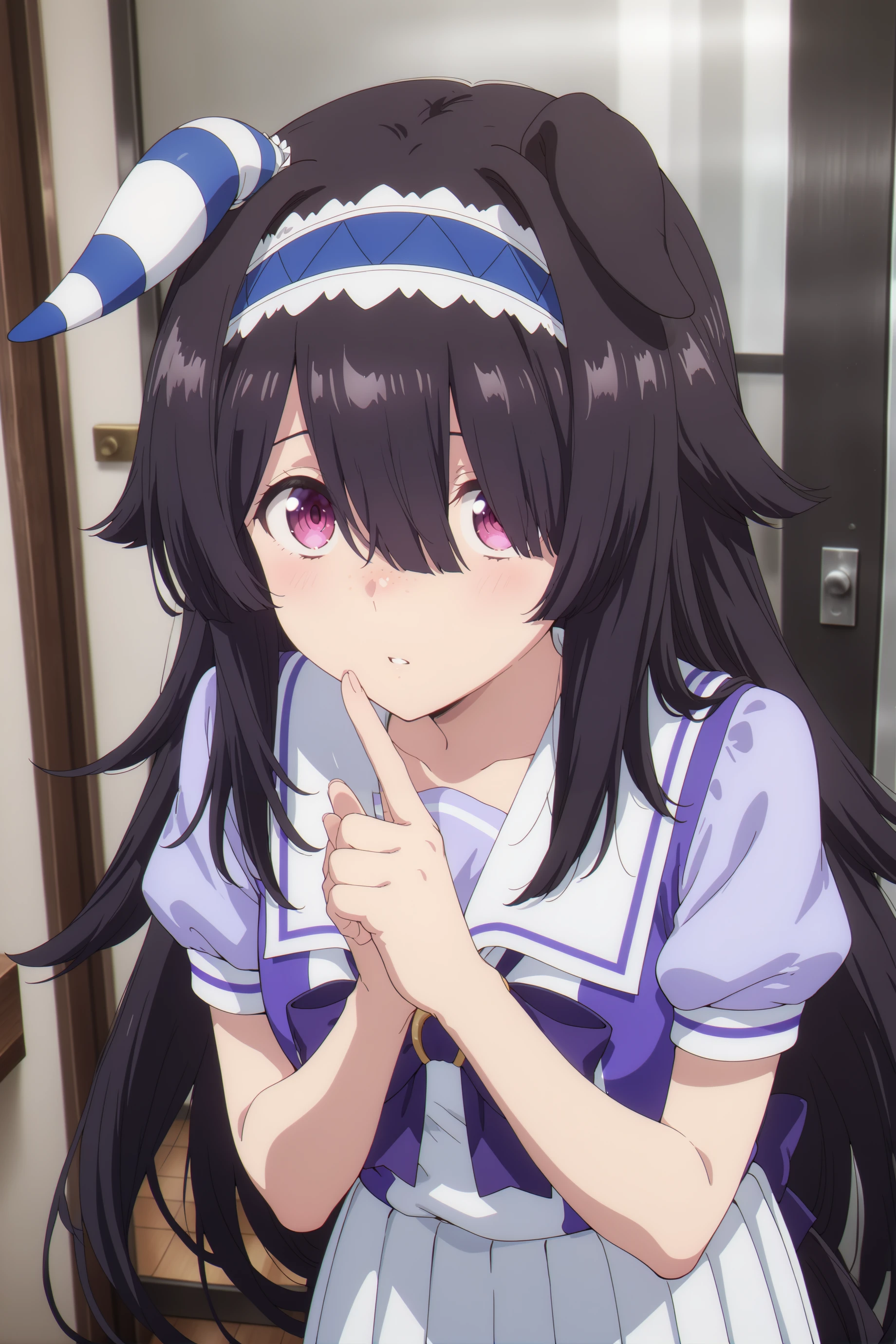 For now, just for good luck ... umamusume, animal ears,horse ears, horse girl,very long hair,black hair, pink eyes, ears down, blue hairband, freckles, single ear cover,long bangs single ear cover,long bangs,asymmetrical bangs,hair over one eye,and the size of the chest can be customized as you like.