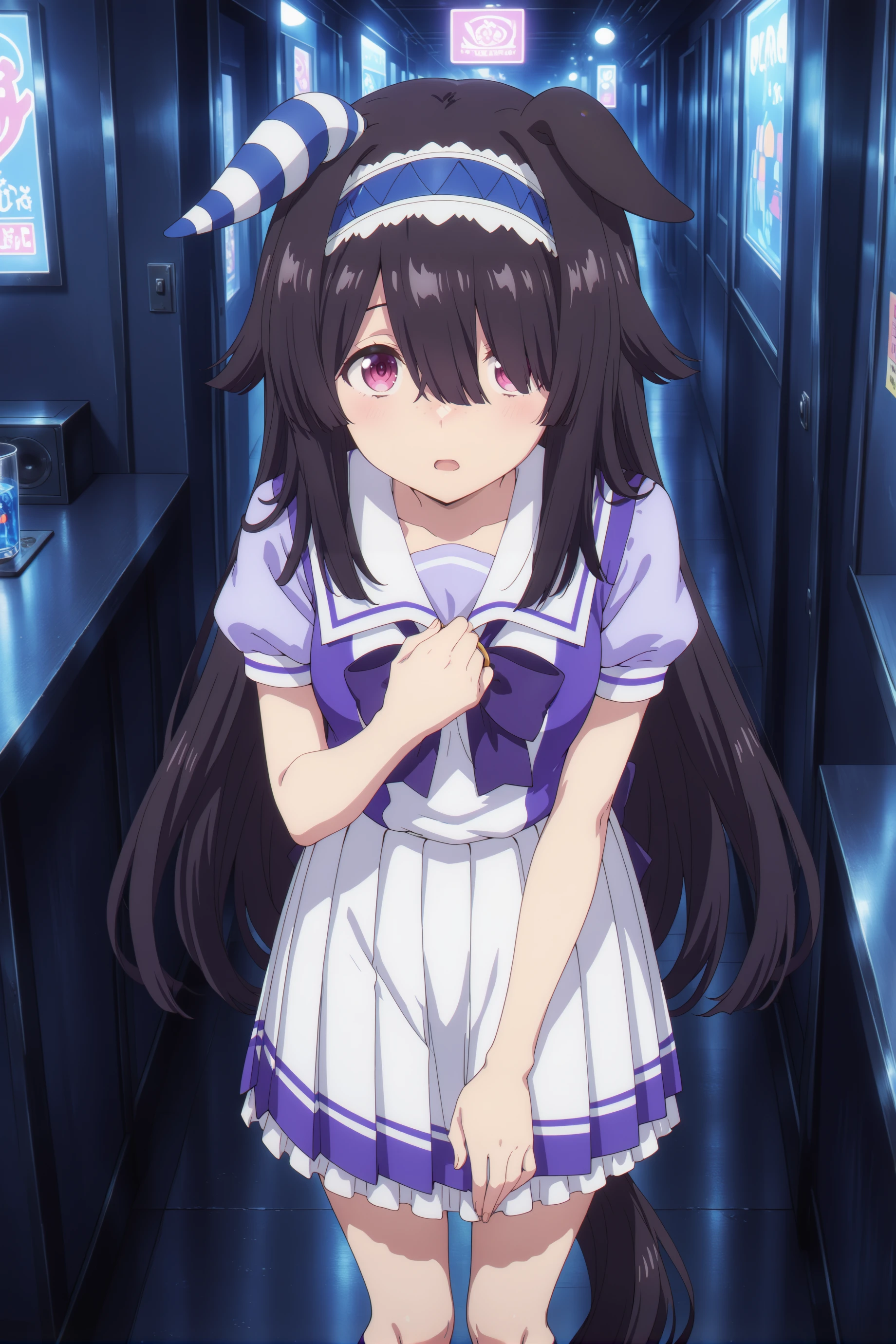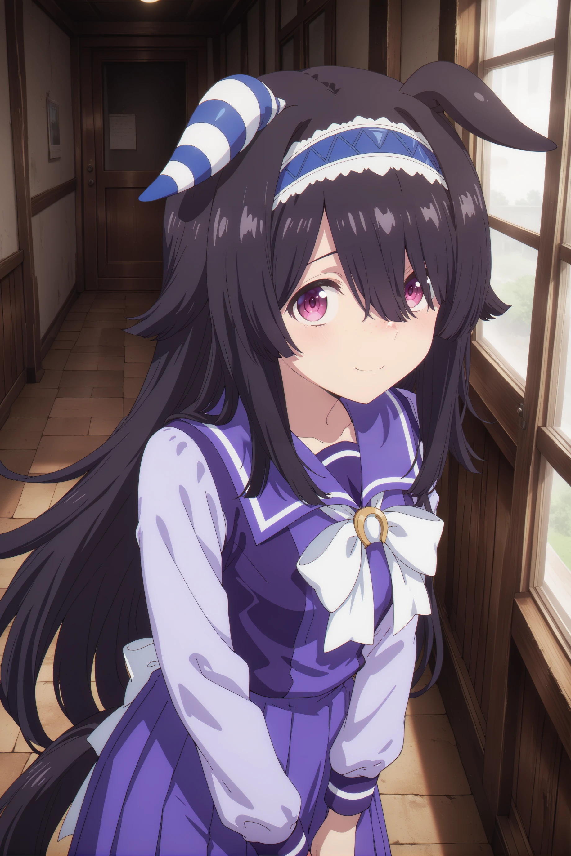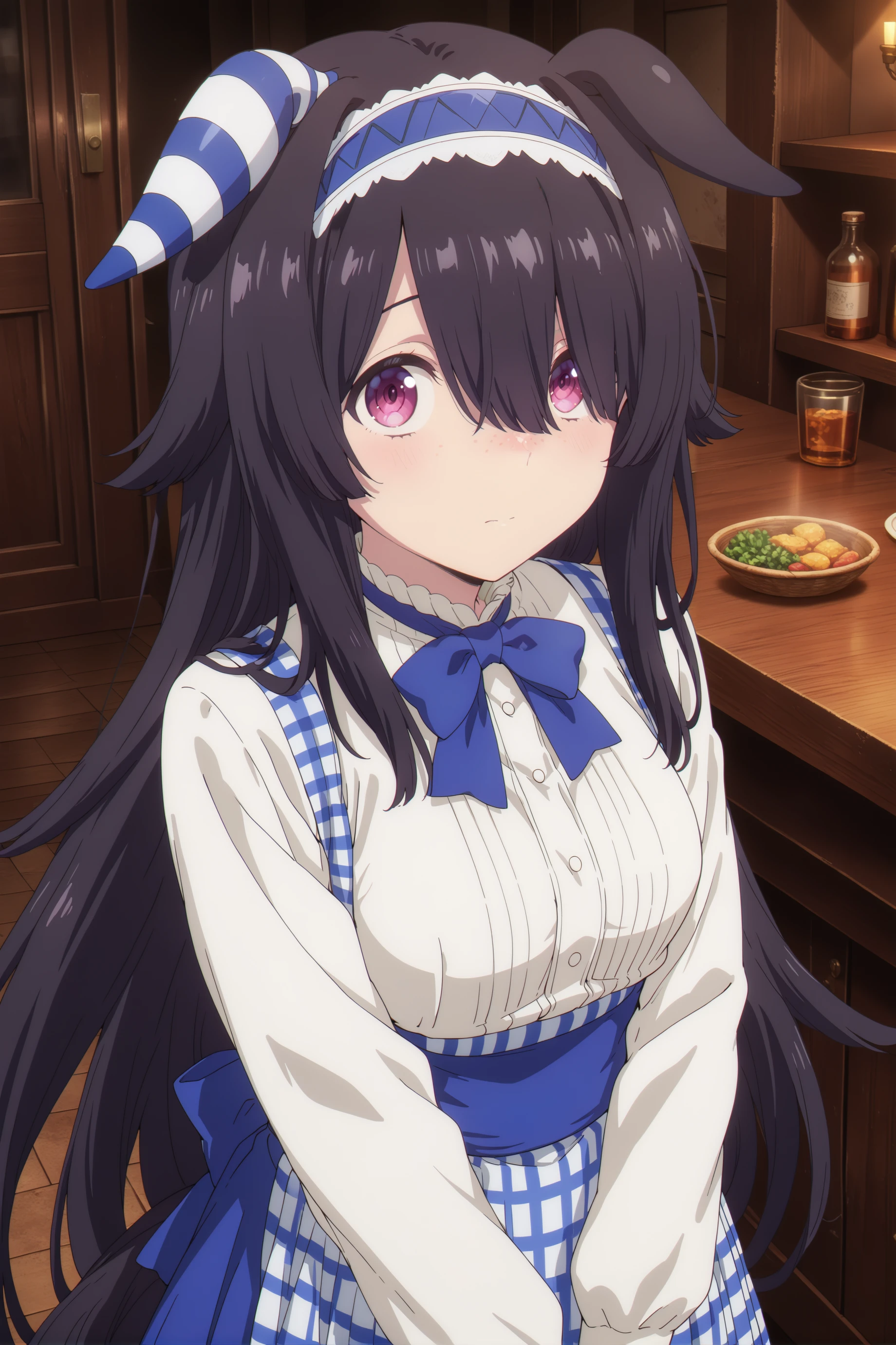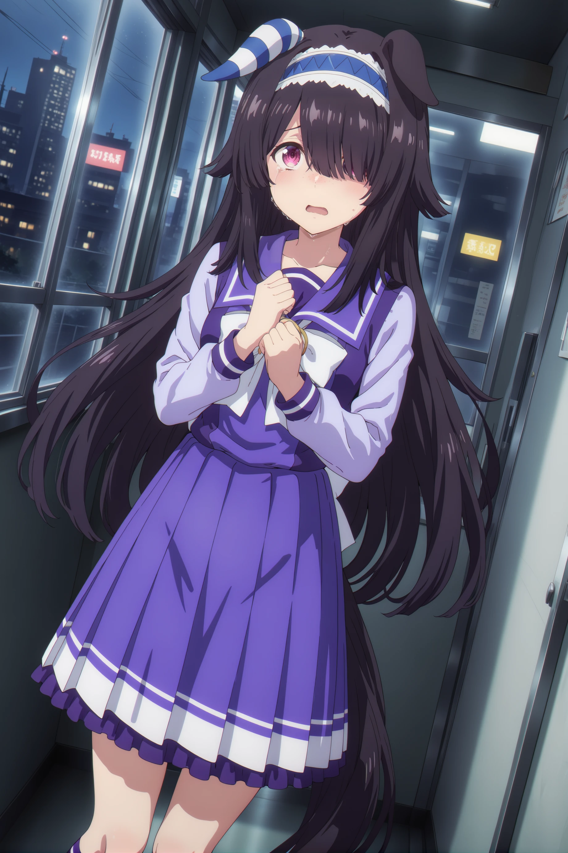 For now, just for good luck ... umamusume, animal ears,horse ears, horse girl,very long hair,black hair, pink eyes, ears down, blue hairband, freckles, single ear cover,long bangs single ear cover,long bangs,asymmetrical bangs,hair over one eye,and the size of the chest can be customized as you like.