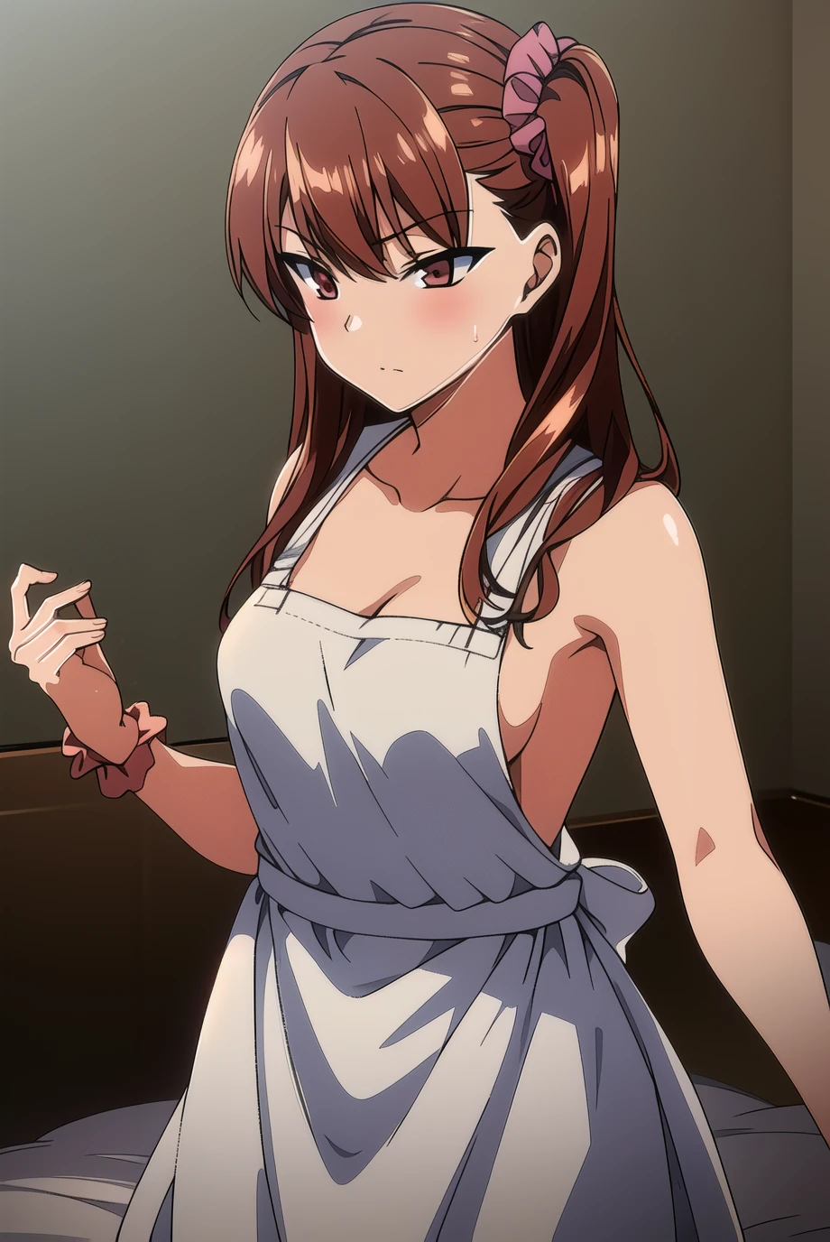 Basic Prompt: isumi waifu, 1girl, solo, bangs,red hair, hair ornament,red eyes,breasts,school uniform,collarbone,pink scrunchie, (hair scrunchie).