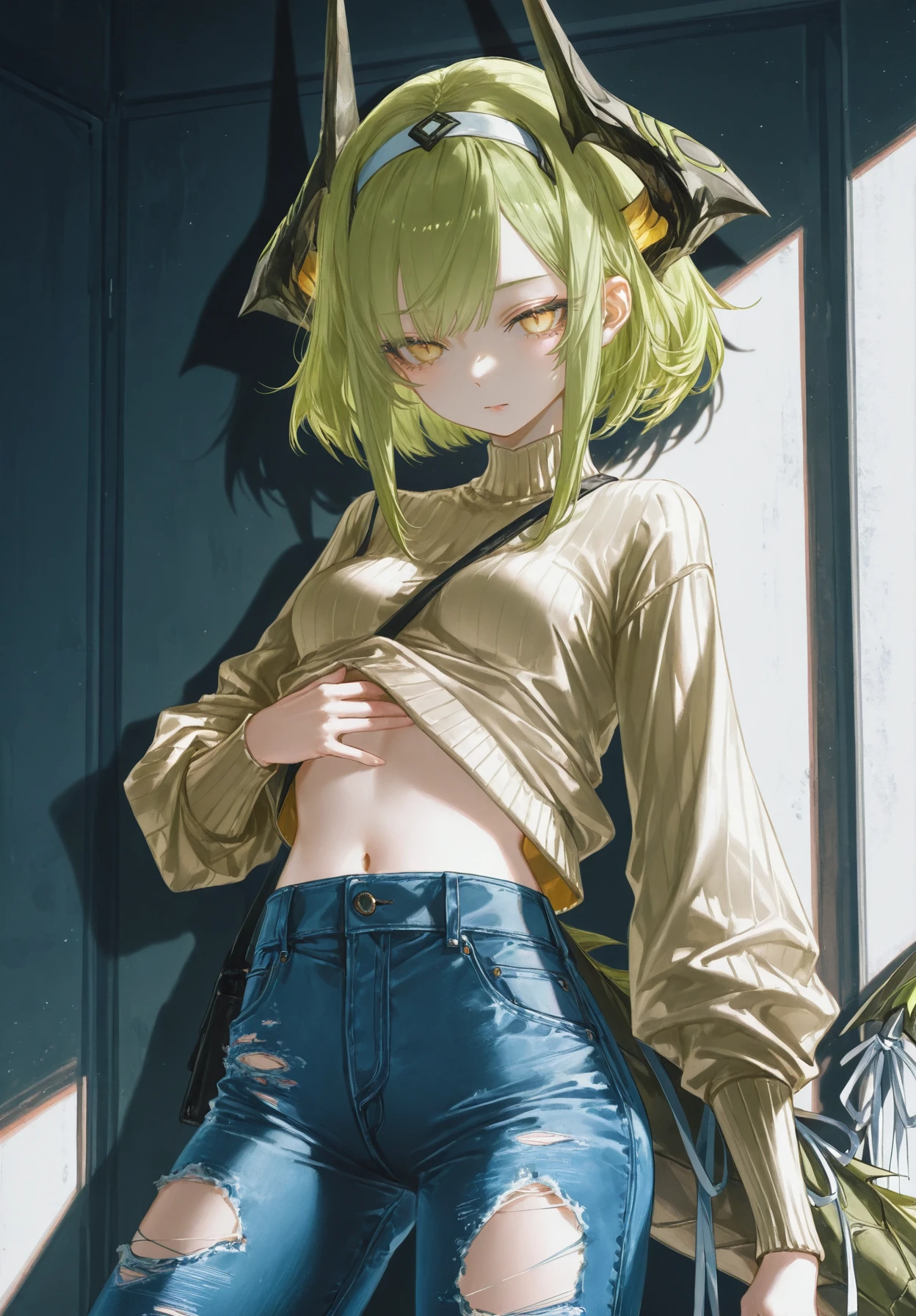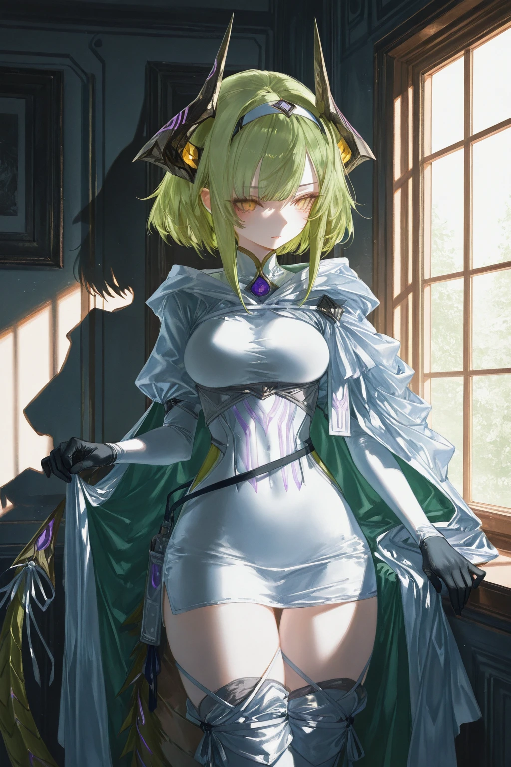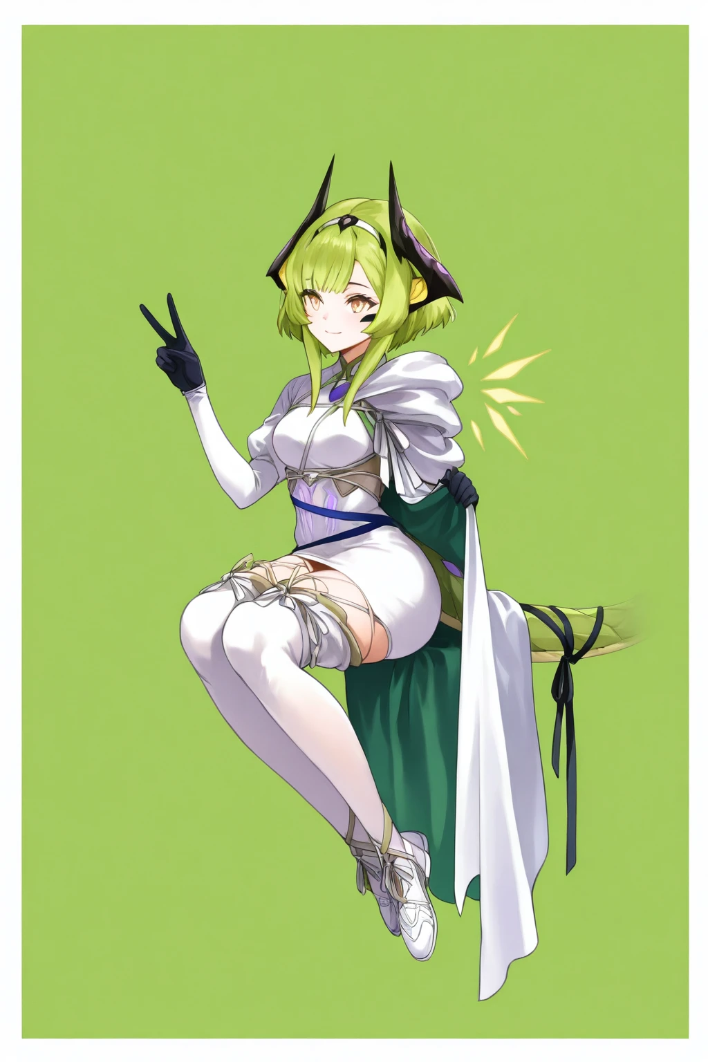 schmeier,1girl,green hair,short hair,sidelocks,yellow eyes,hairband,dragon horns,dragon tail,tail ribbon,white microdress,white cape,black gloves,waist ribbon,white thighhighs,white shoes,