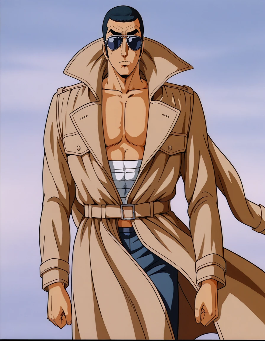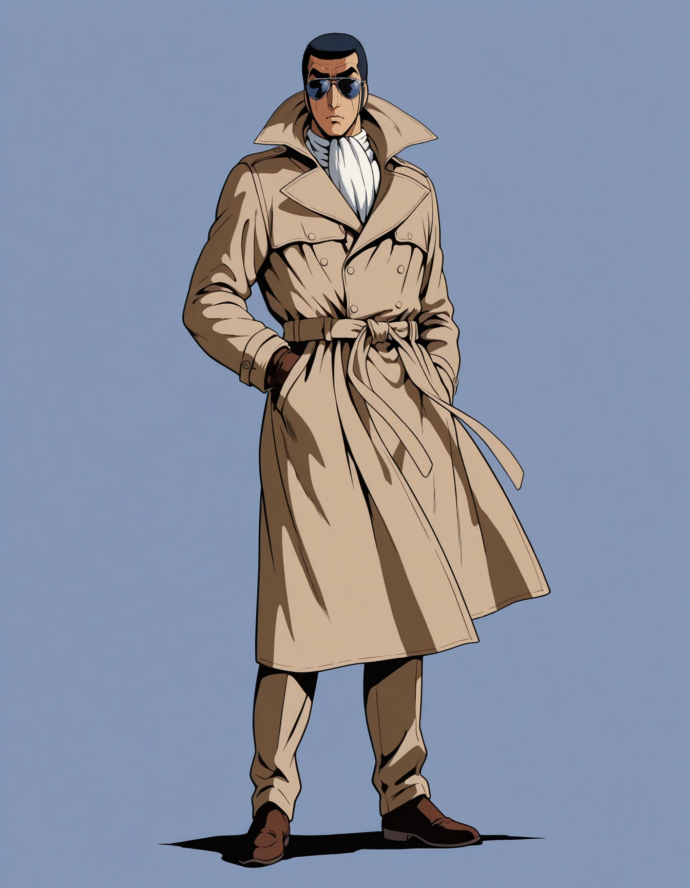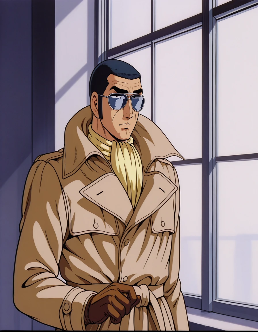 golgo_13,very_short_hair,black_hair,sideburns,retro_artstyle,1980s_(style),sunglasses,brown_coat,trench_coat,ascot,brown_gloves,high_collar
