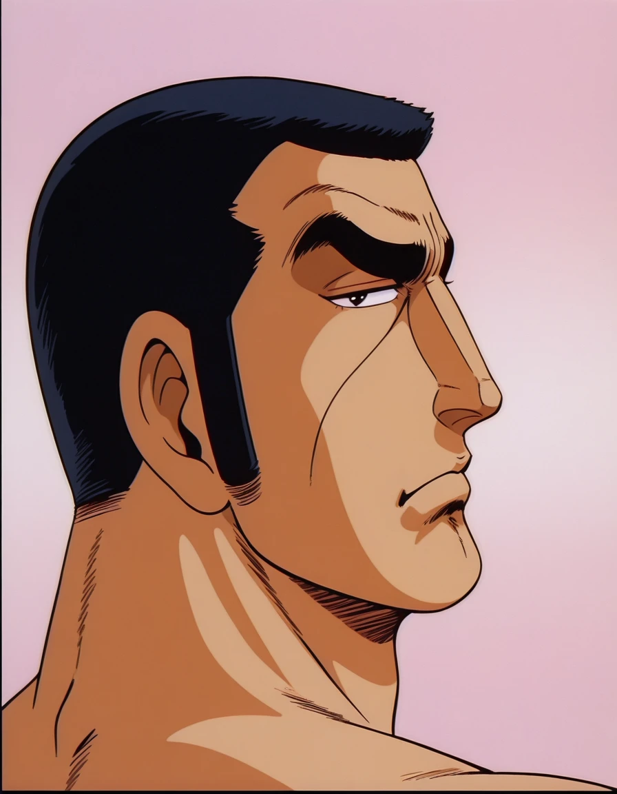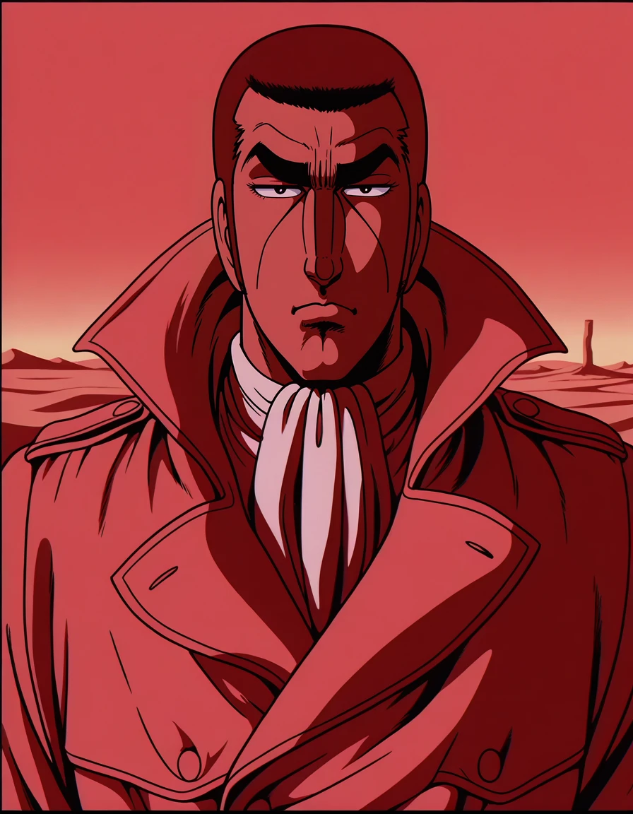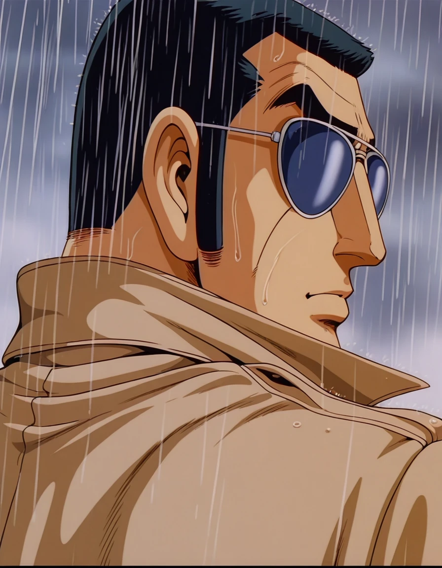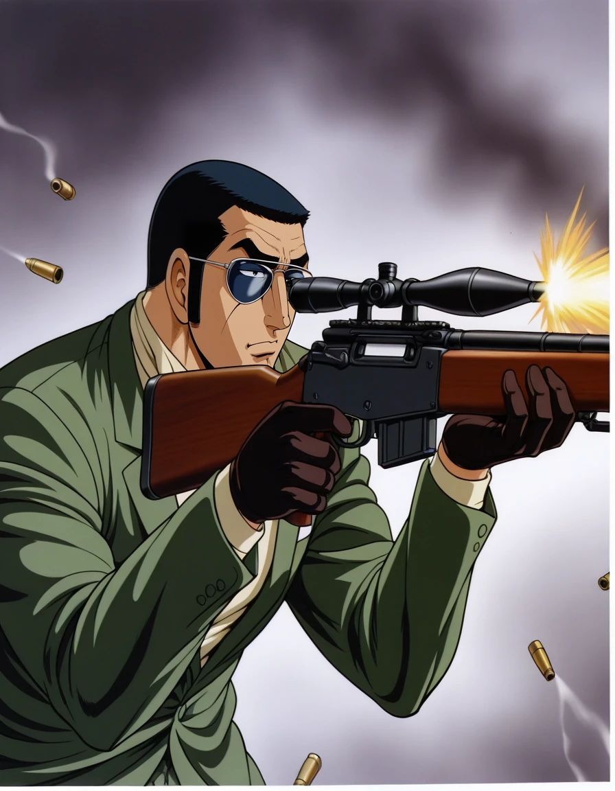golgo_13,very_short_hair,black_hair,sideburns,retro_artstyle,1980s_(style),sunglasses,brown_coat,trench_coat,ascot,brown_gloves,high_collar