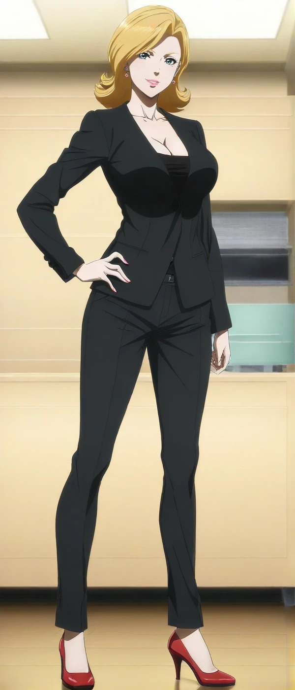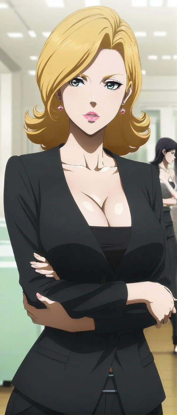 cleavage,black suit,black shirt,pant suit, anime coloring