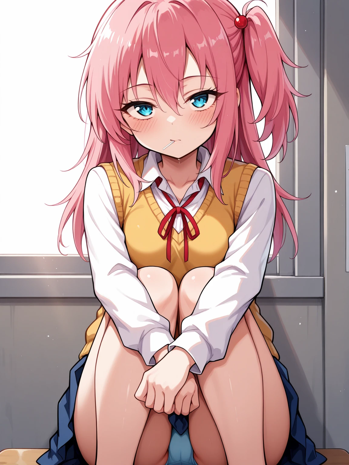 School: school uniform, white shirt, long sleeves, sweater vest, yellow vest, red neck ribbon, blue skirt, bare legs