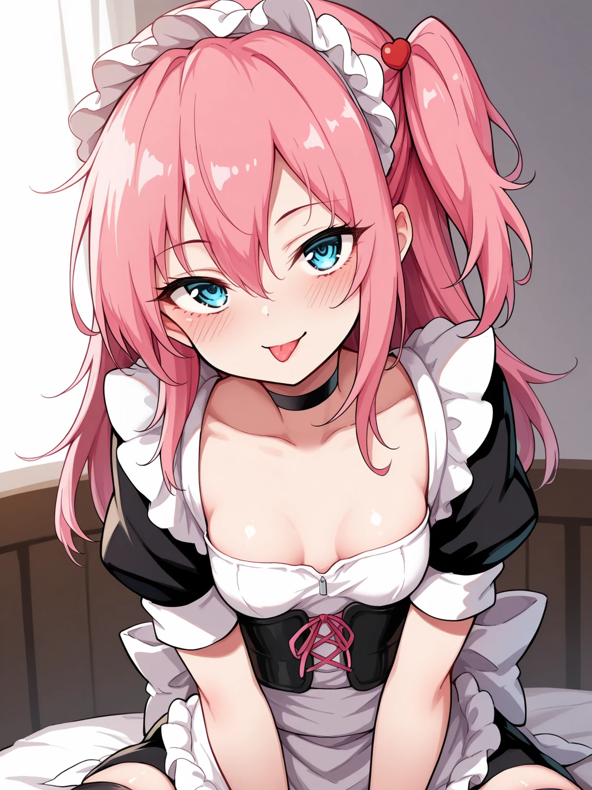 Maid: maid uniform, maid apron, maid headdress, black corset, short sleeves, black thighhighs, black choker