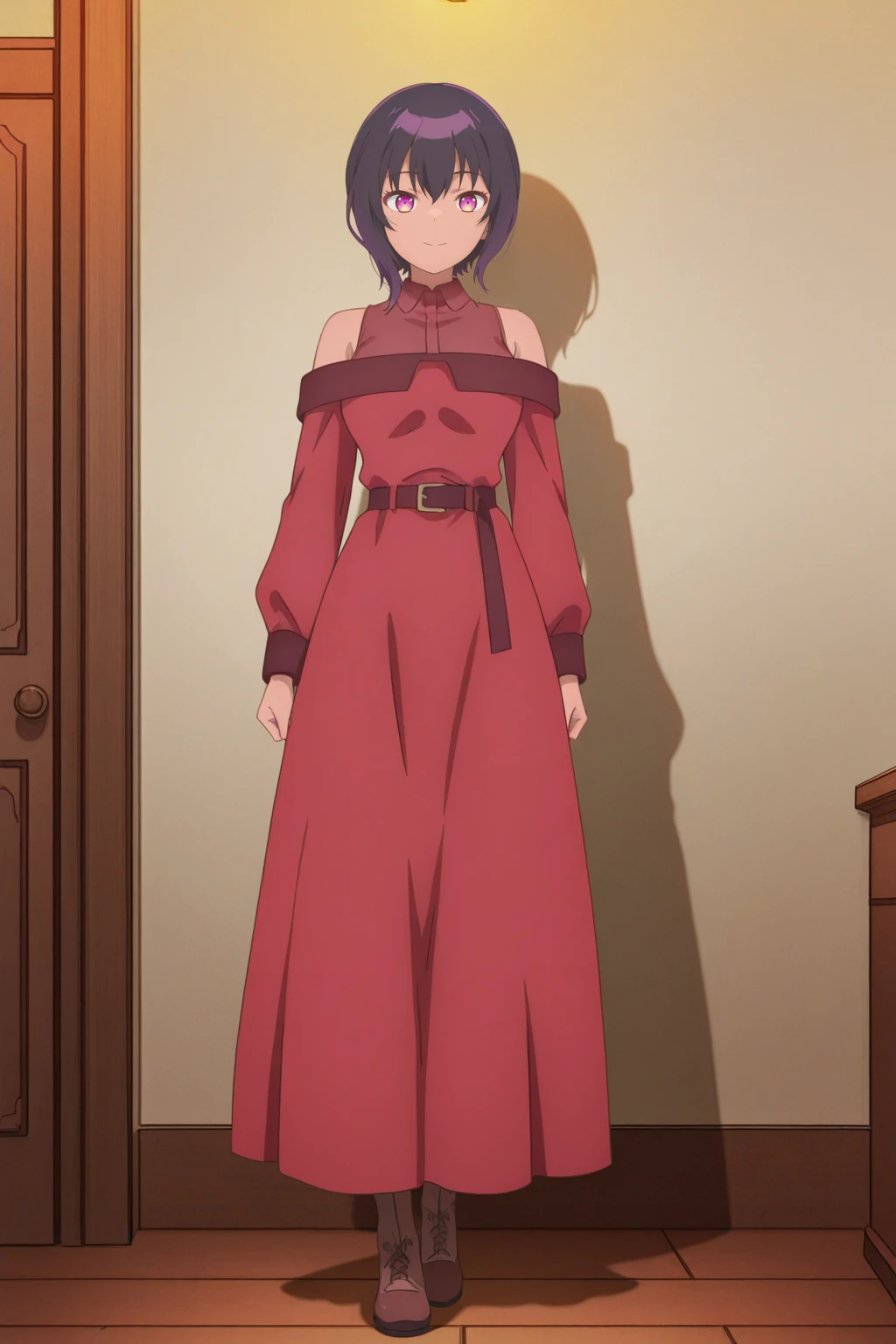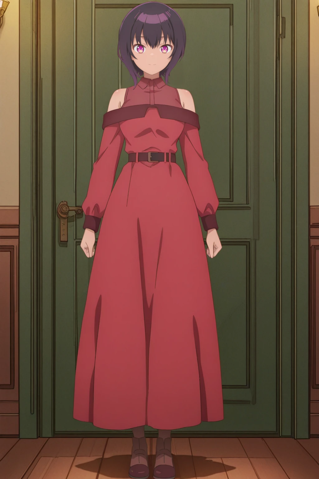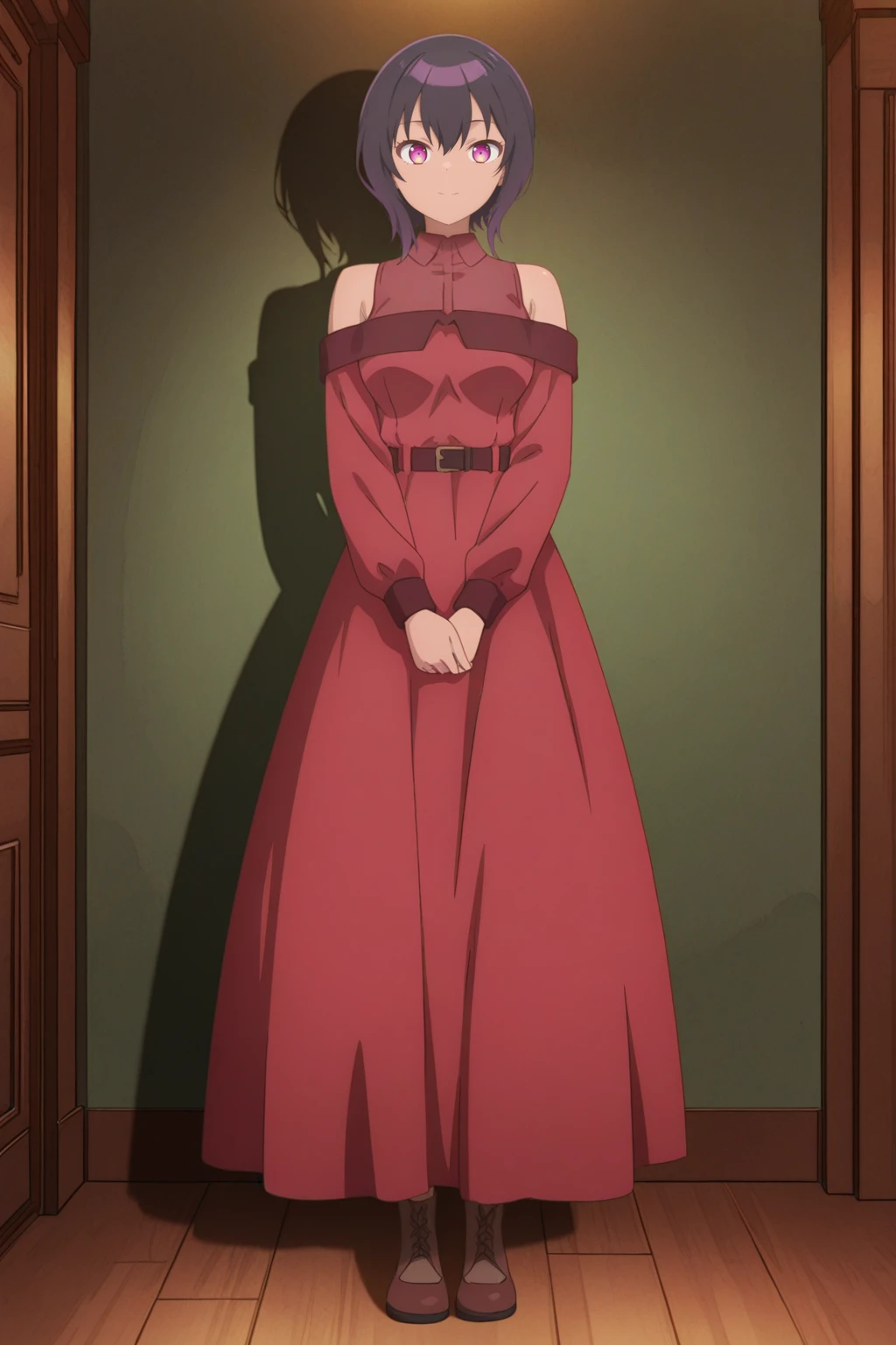 red-dressoutfit, dress, red dress, sidelocks, bare shoulders, brown shoes, long sleeves, belt,