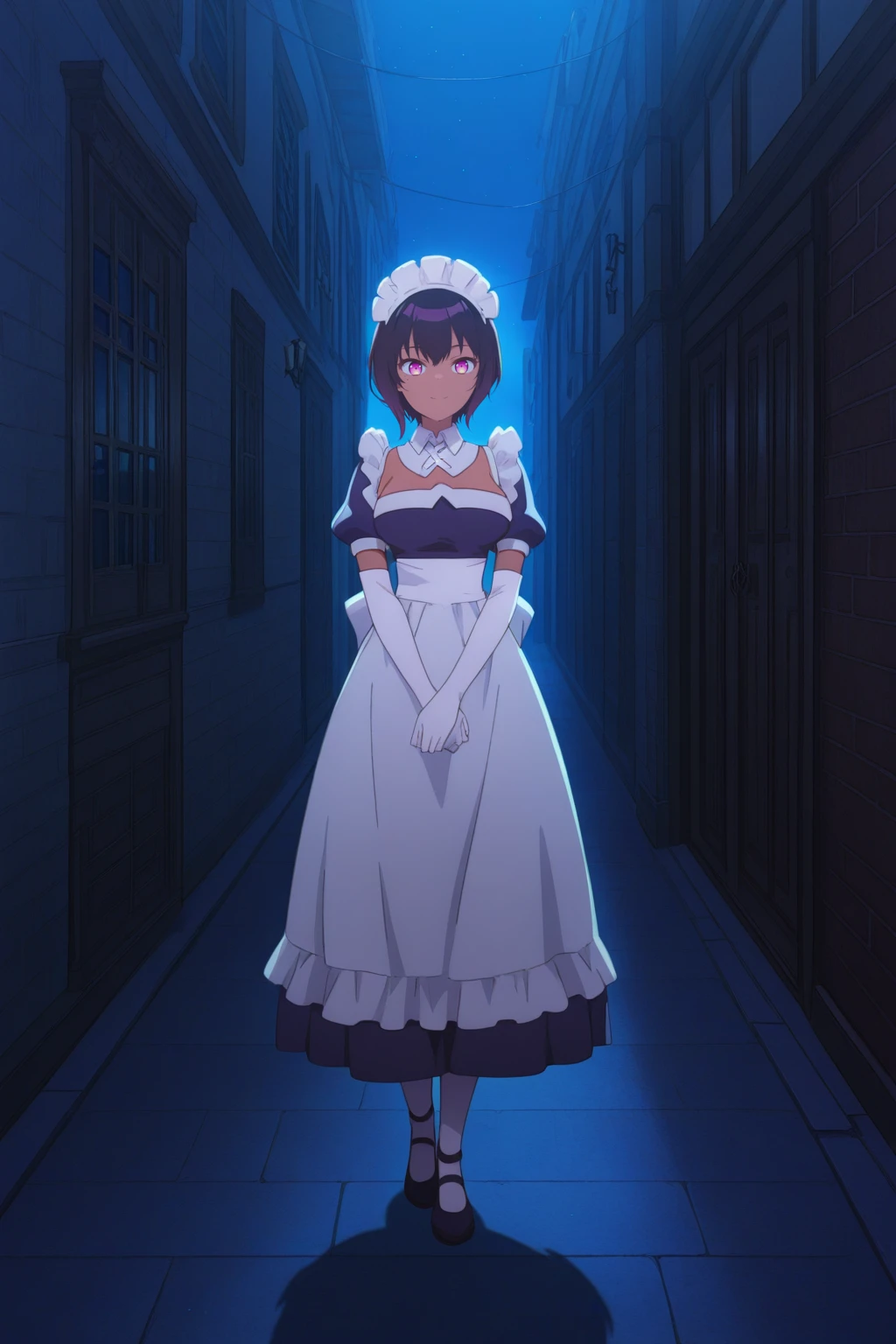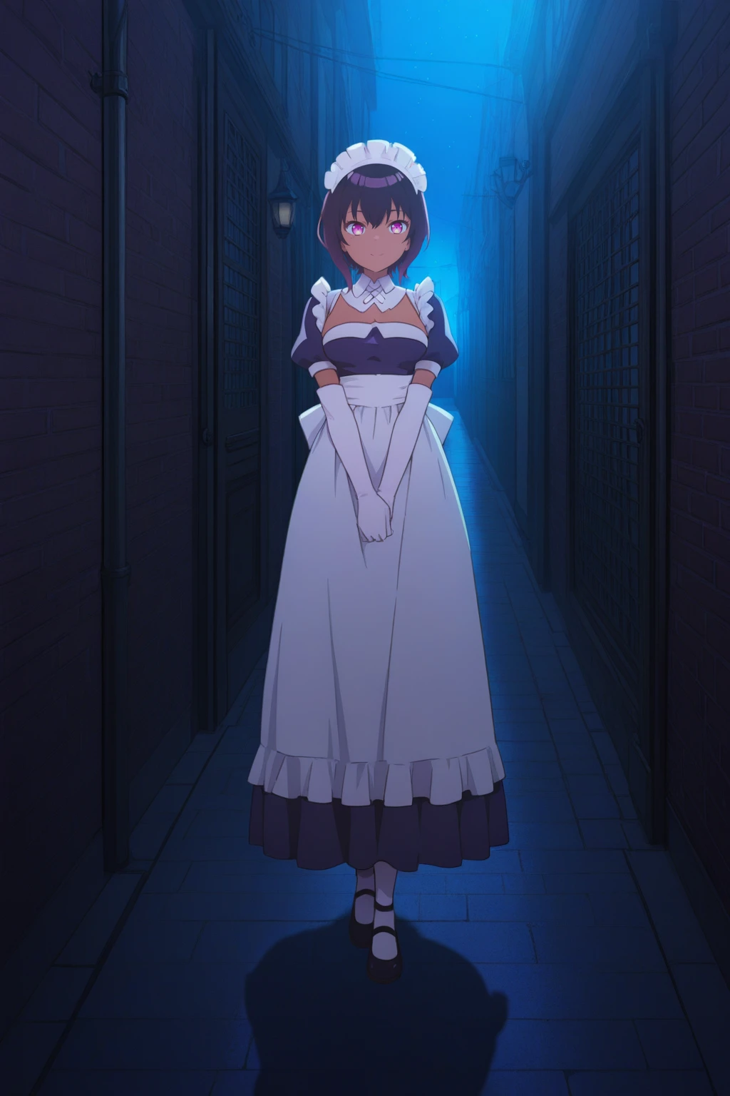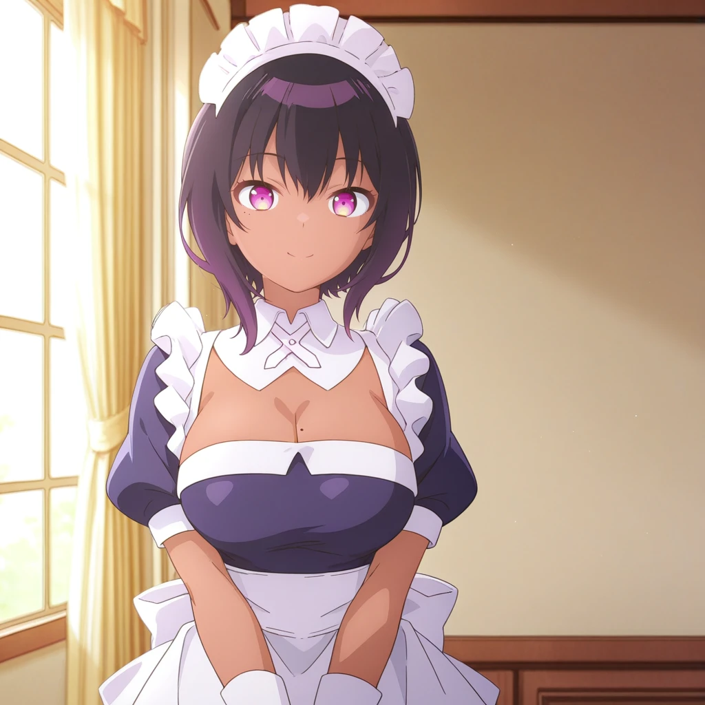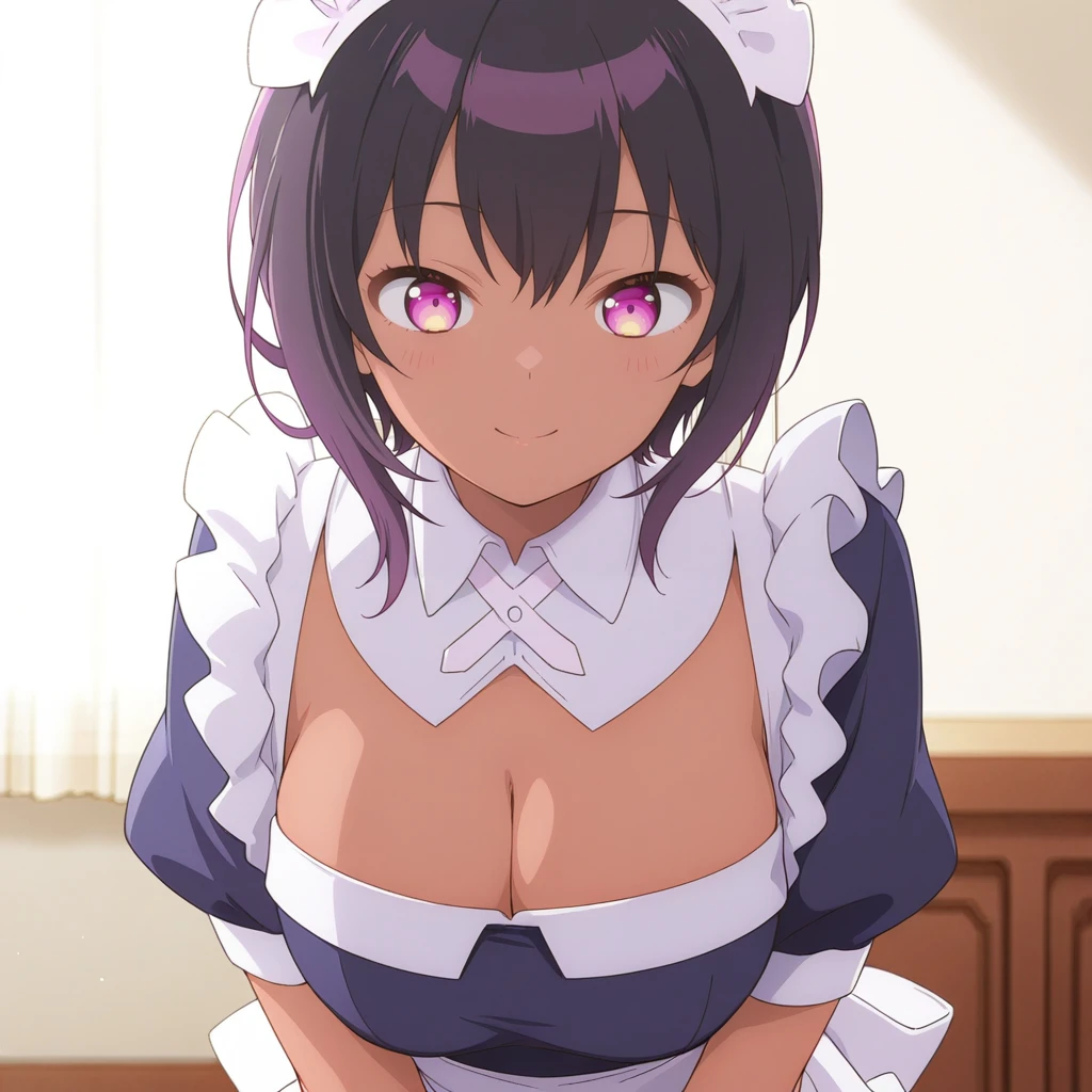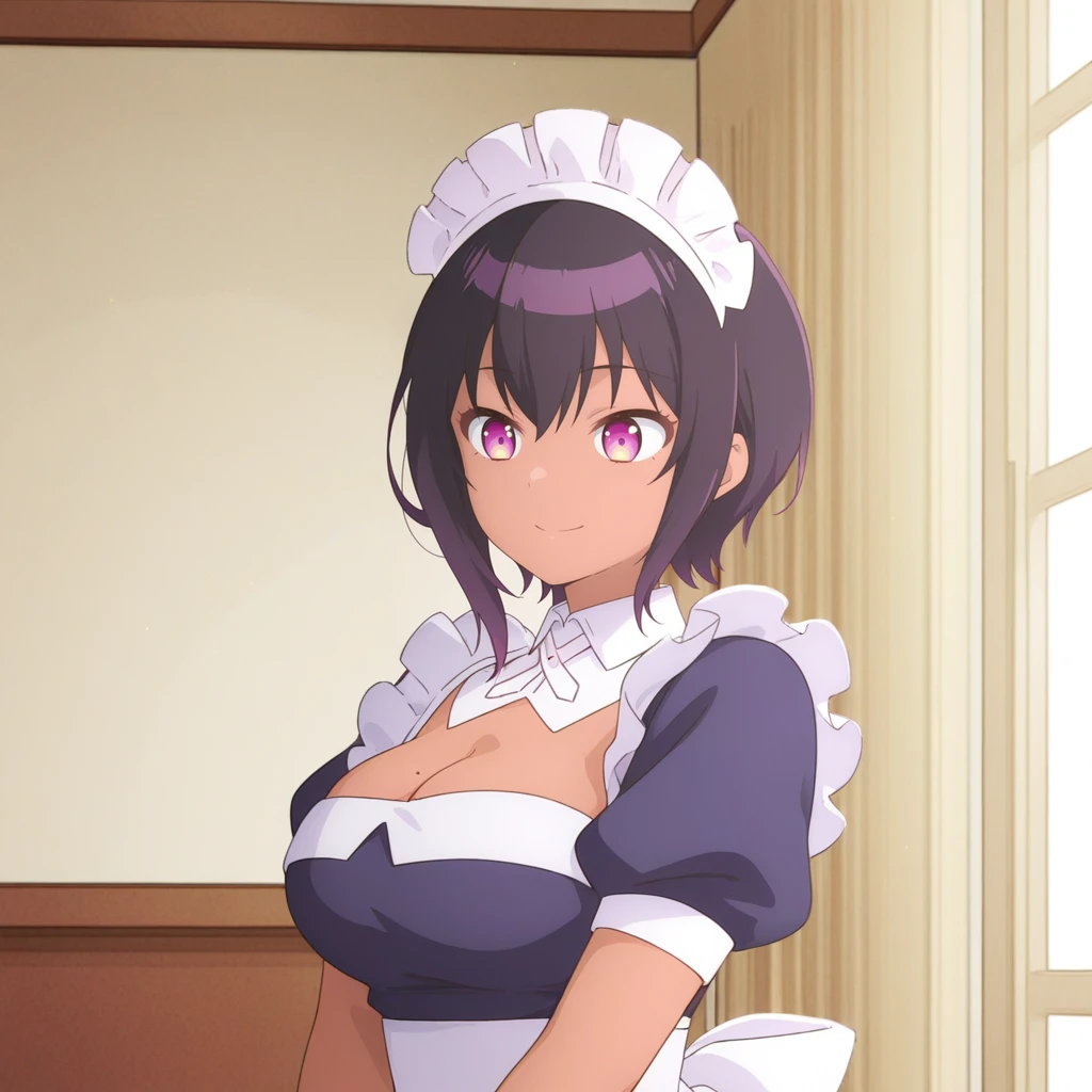 lilith_saikinmaid, 1girl, violet eyes, dark-skinned female, short hair, black hair