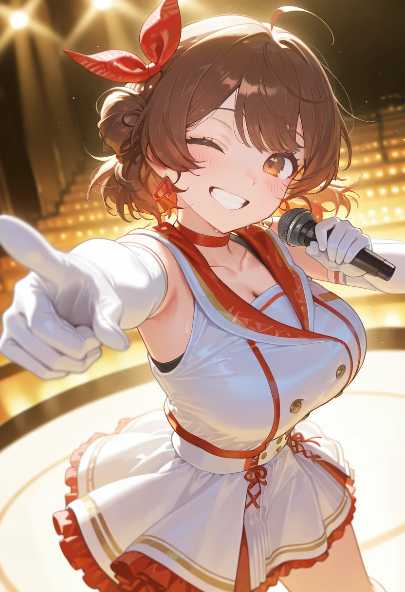 Tags for her look: 1girl, solo, blush, short hair, large breasts, brown hair, brown eyes, ahoge, hair bun,