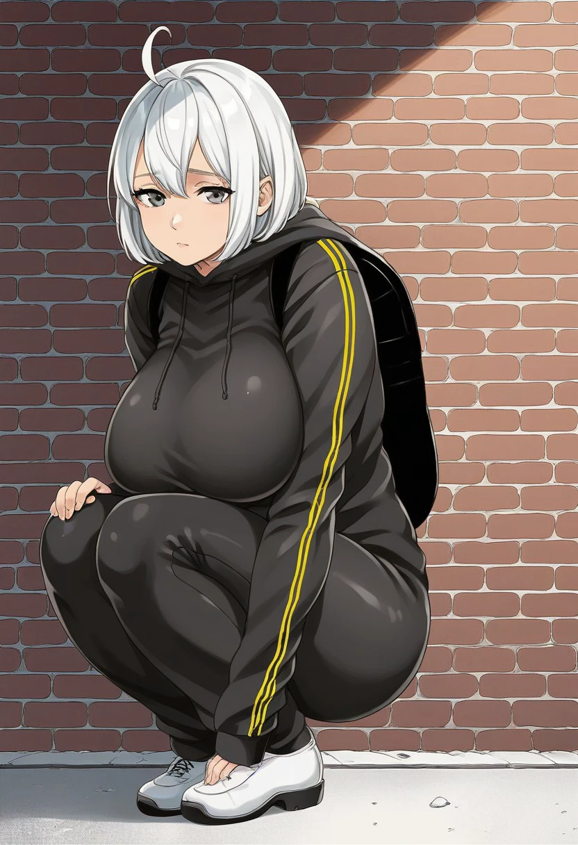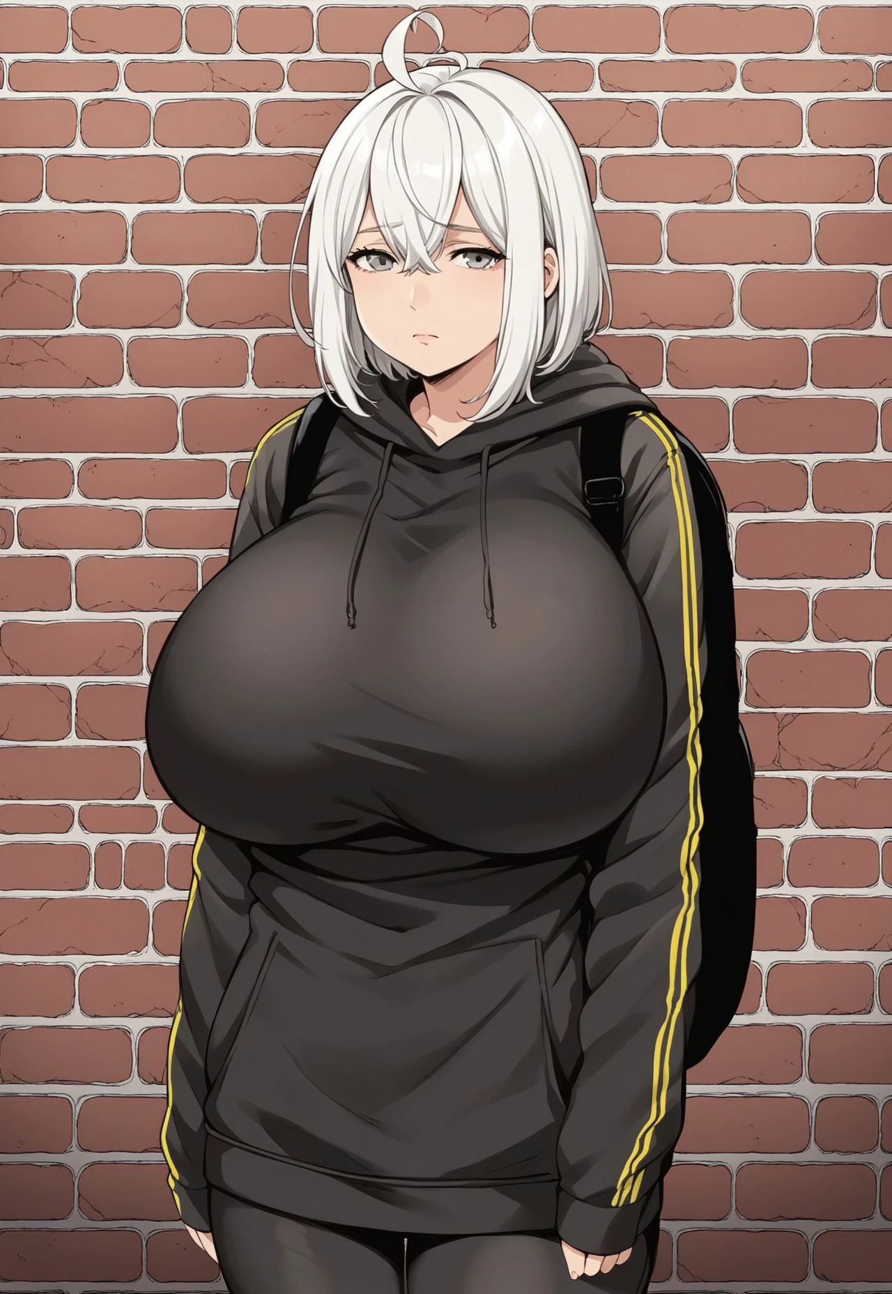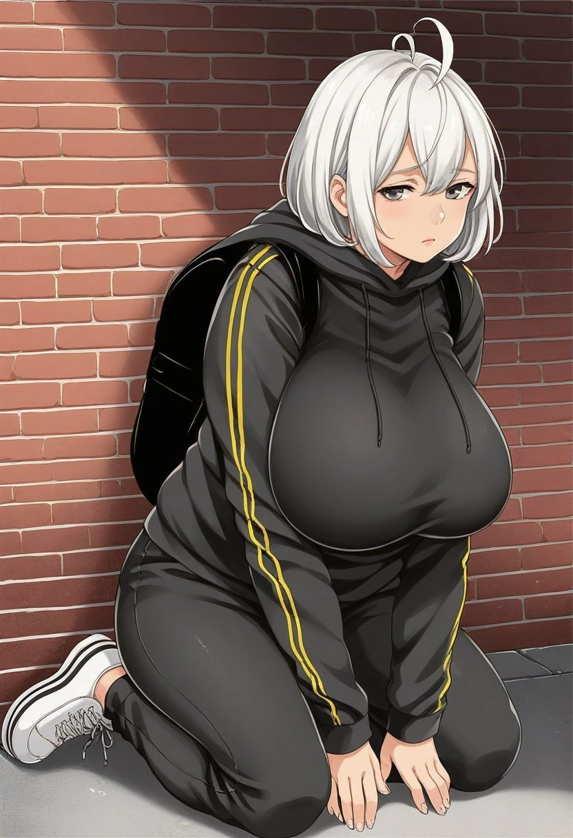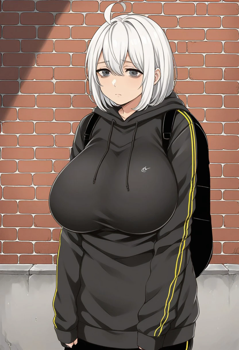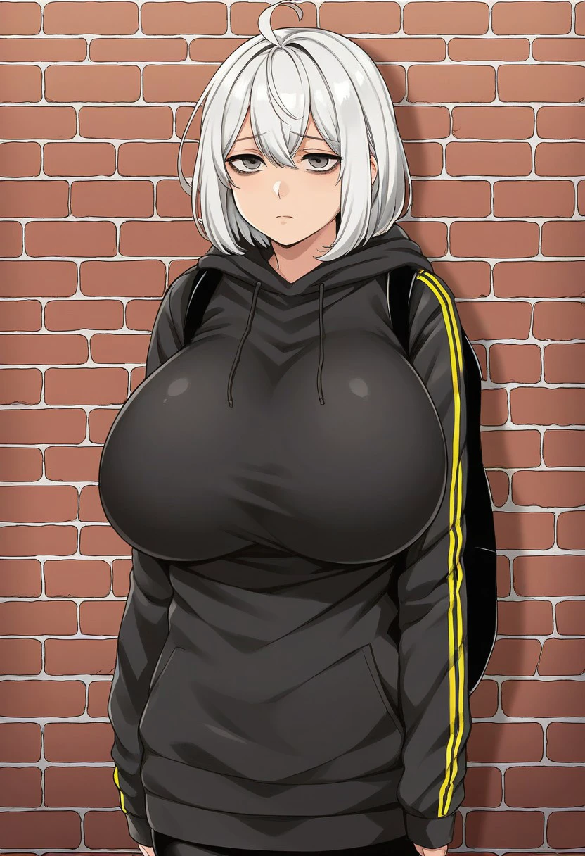 Tags: Nemuko Ochiai, white hair, medium-length hair, hair straight with bangs, ahoge, tired, sad, downcast expression, grey eyes, exhausted eye bags, huge breasts