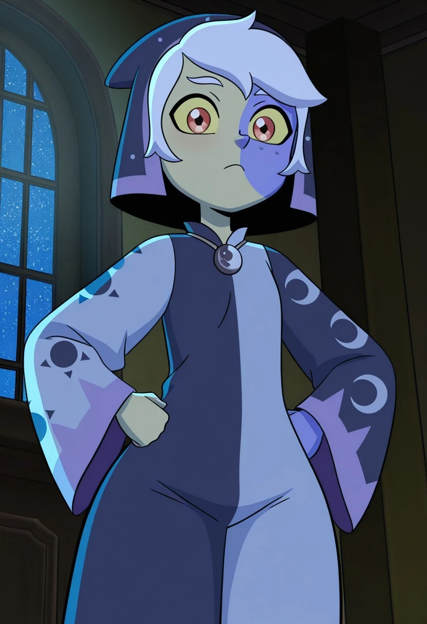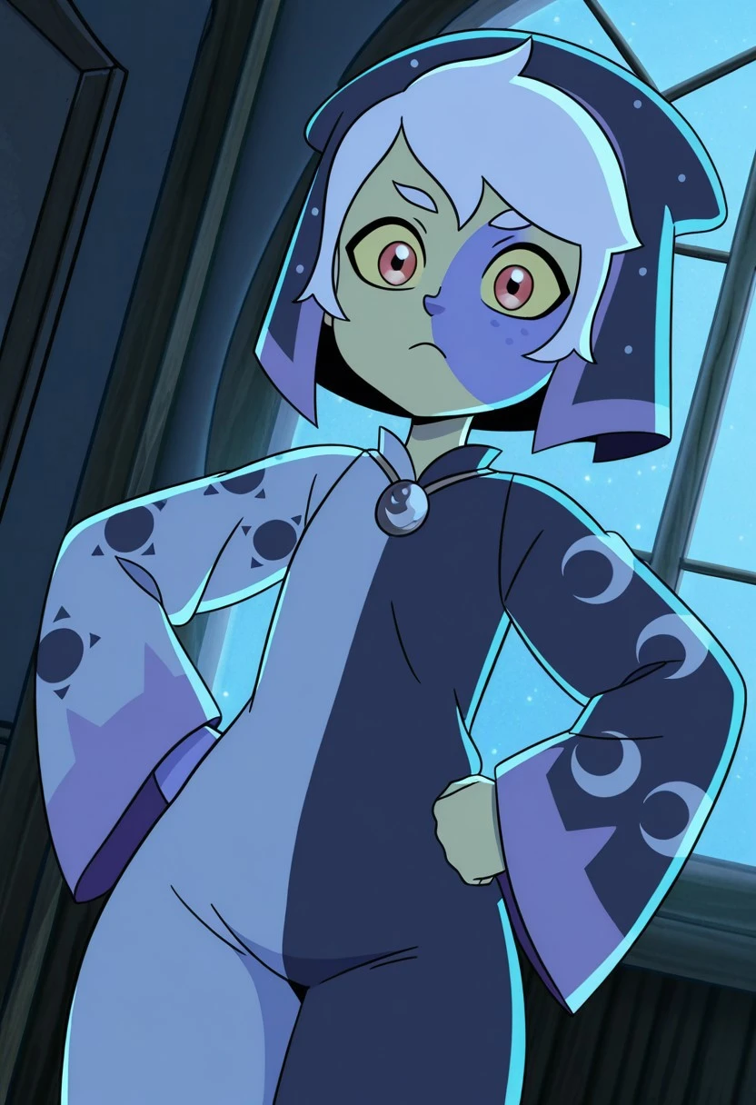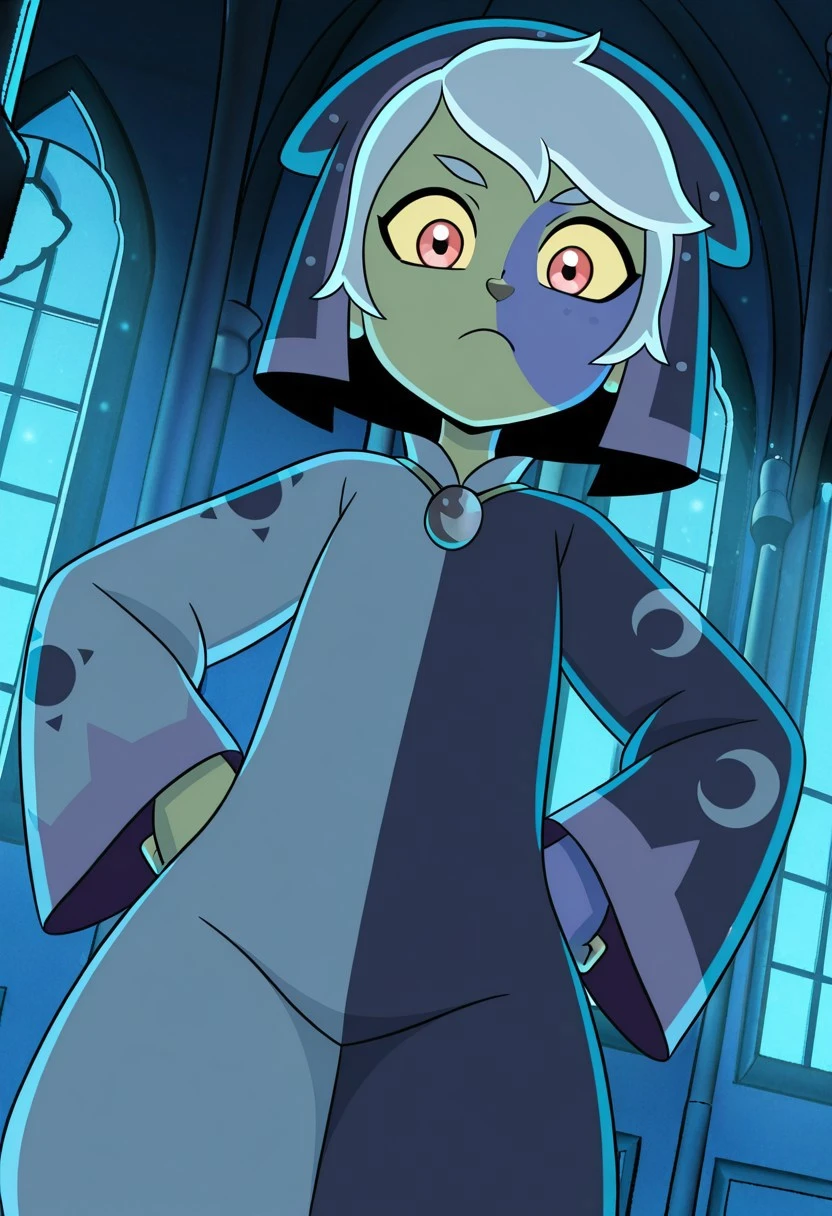Base Prompt: The Collector, white hair, multicolor pajamas, shoes, headwear, cap, pendant, yellow sclera, red eyes, two-tone skin,