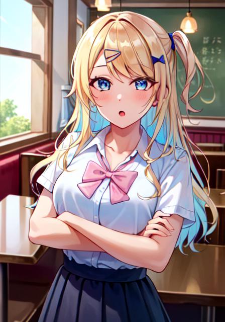 shirakawa runa, 1girl, solo, long_hair, blush, bangs, blue_eyes, blonde_hair, white_school_uniform, hair_ornament, bow, cleavage, blue_hair, collarbone, (white_shirt:1.5), hair_bow, multicolored_hair, hairclip, collared_shirt, clothes_around_waist, skirt, (pink_bowtie:1.5), streaked_hair, (one_side_up:1.4), gyaru, kogal,i guess that is all, thanks you....