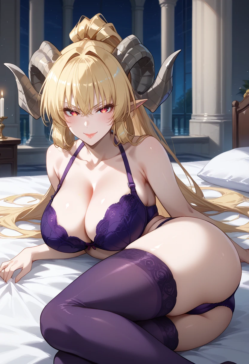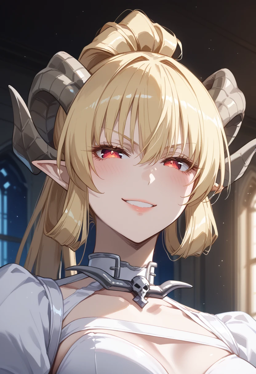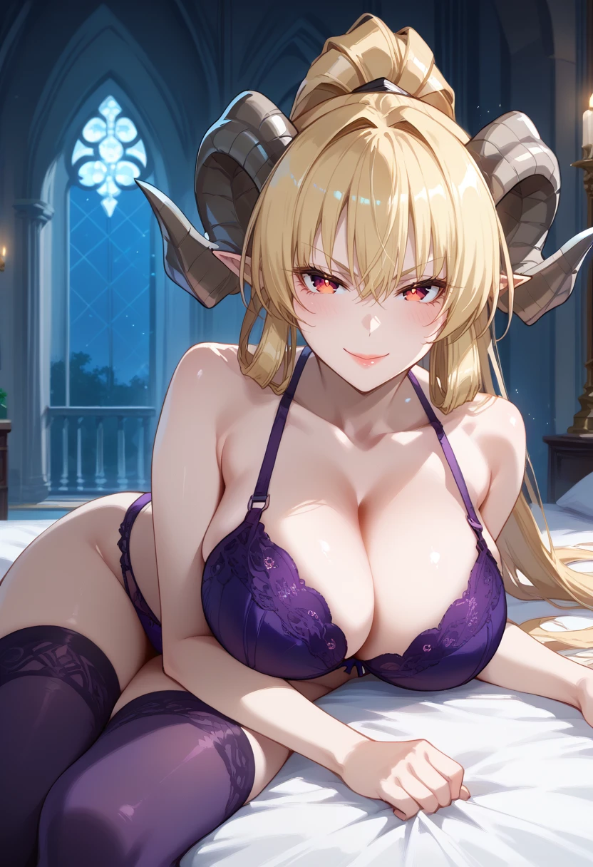 lucifer \(the seven deadly sins\), 1girl, demon girl, pointy ears, long hair, red eyes, blonde hair, curled horns, bangs, high ponytail,