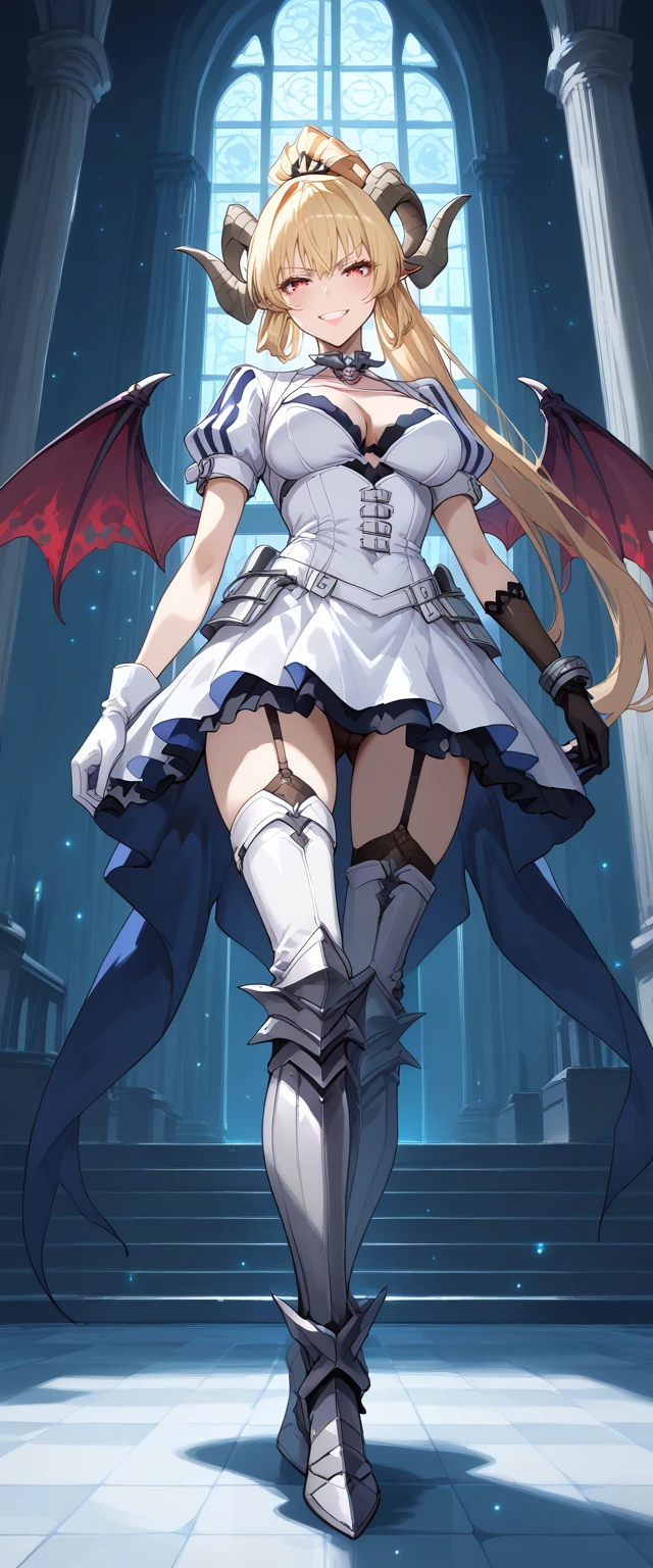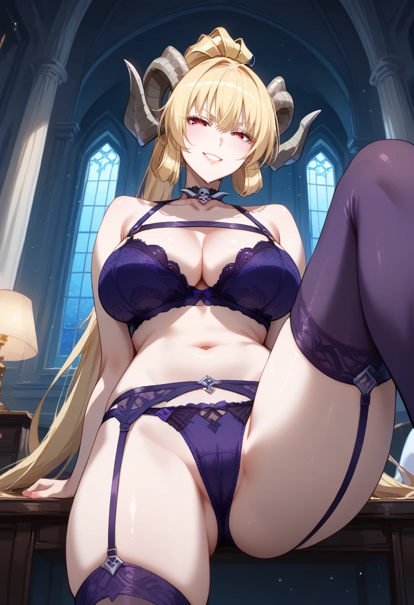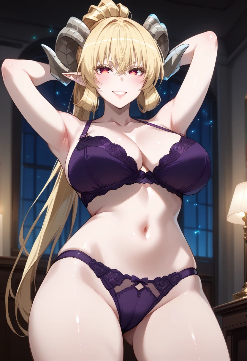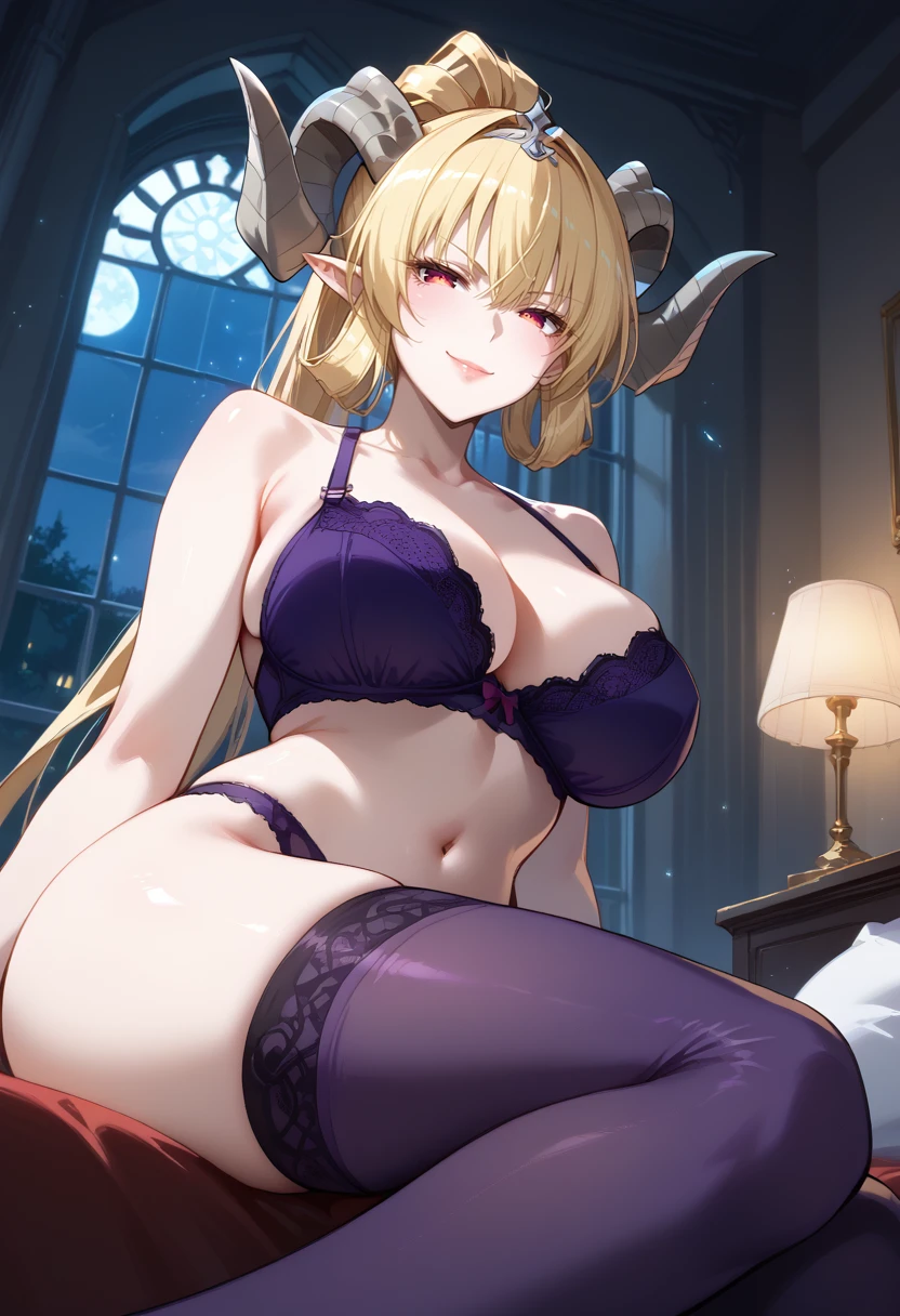 lucifer \(the seven deadly sins\), 1girl, demon girl, pointy ears, long hair, red eyes, blonde hair, curled horns, bangs, high ponytail,