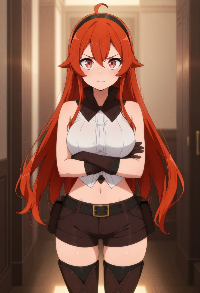 eris, red eyes, red hair, twintails, hair between eyes, black hairband, white shirt, brown shorts, brown thigh boots, brown gloves, // brown crop top, brown hairband, white panties,