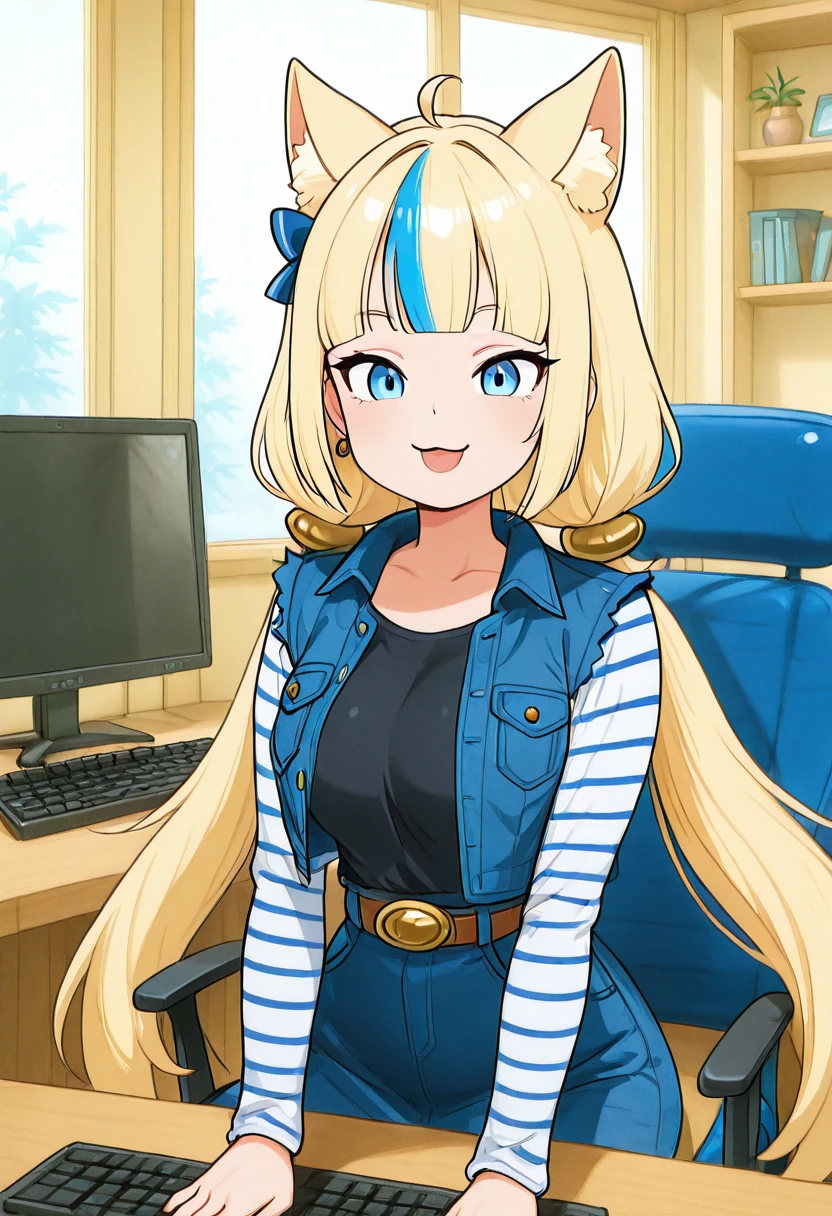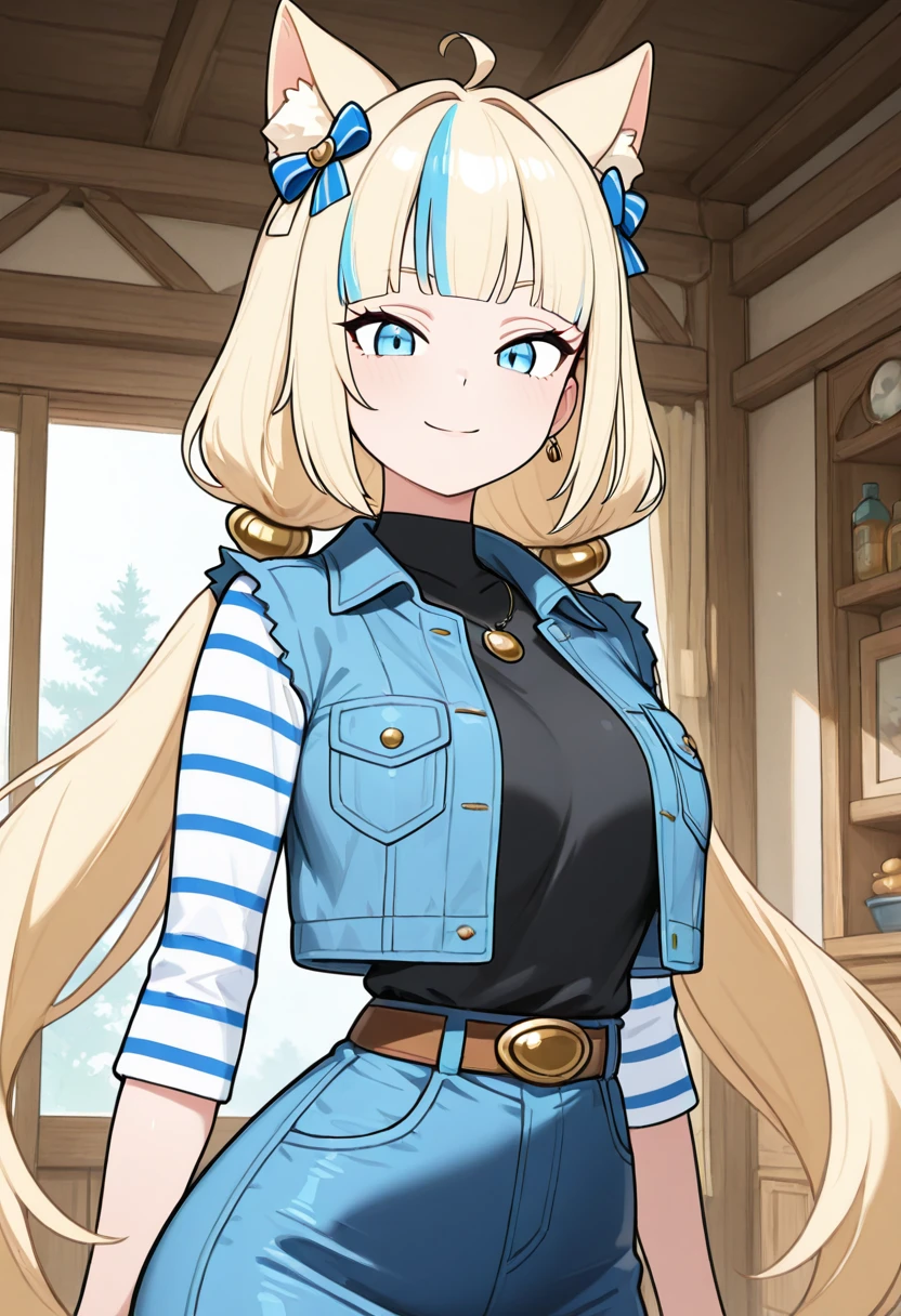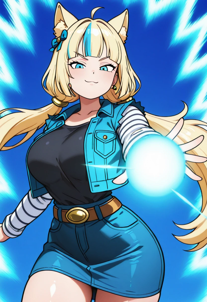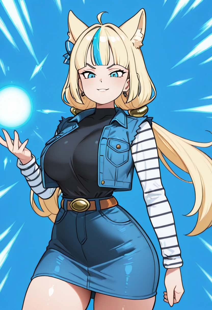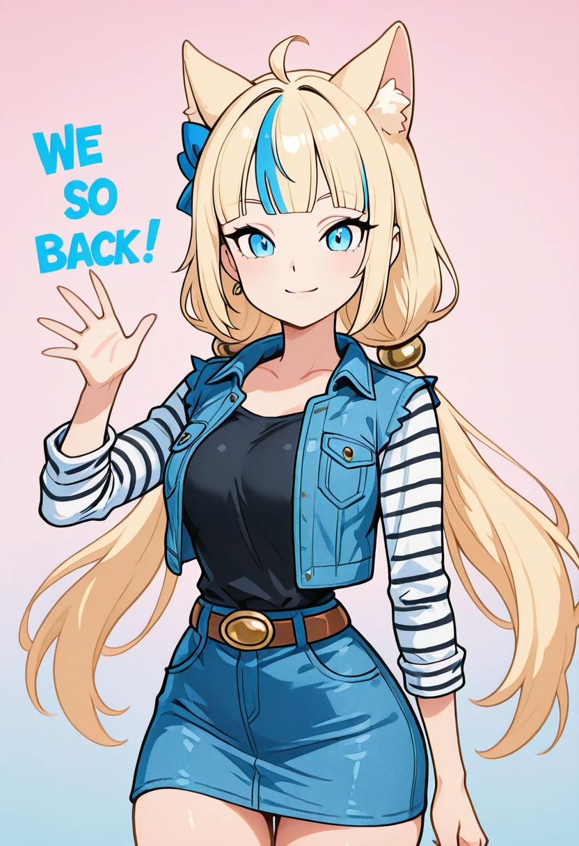 AndroidSAc1tr0n, blue eyes, ahoge, cat ears, blonde hair, blue hair, multicolored hair, streaked hair, long hair, hair bow, low twintails, blunt bangs, cropped jacket, high-waist skirt, striped shirt, shirt tucked in, black shirt, brown belt, open vest, denim skirt, striped sleeves, denim jacket,