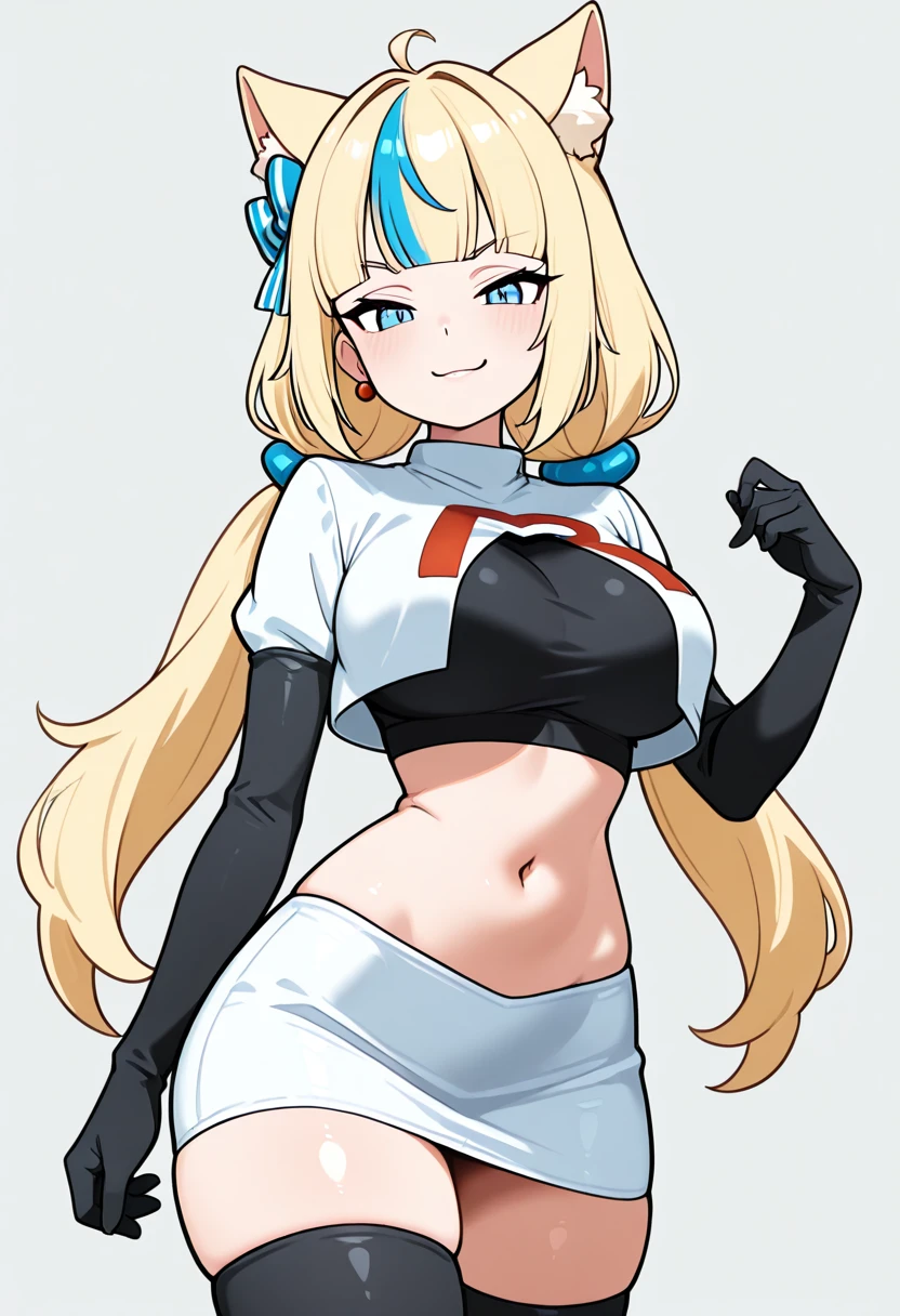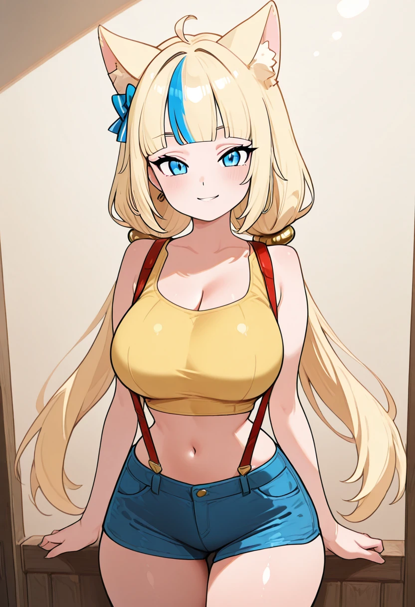 AndroidSAc1tr0n, blue eyes, ahoge, cat ears, blonde hair, blue hair, multicolored hair, streaked hair, long hair, hair bow, low twintails, blunt bangs,