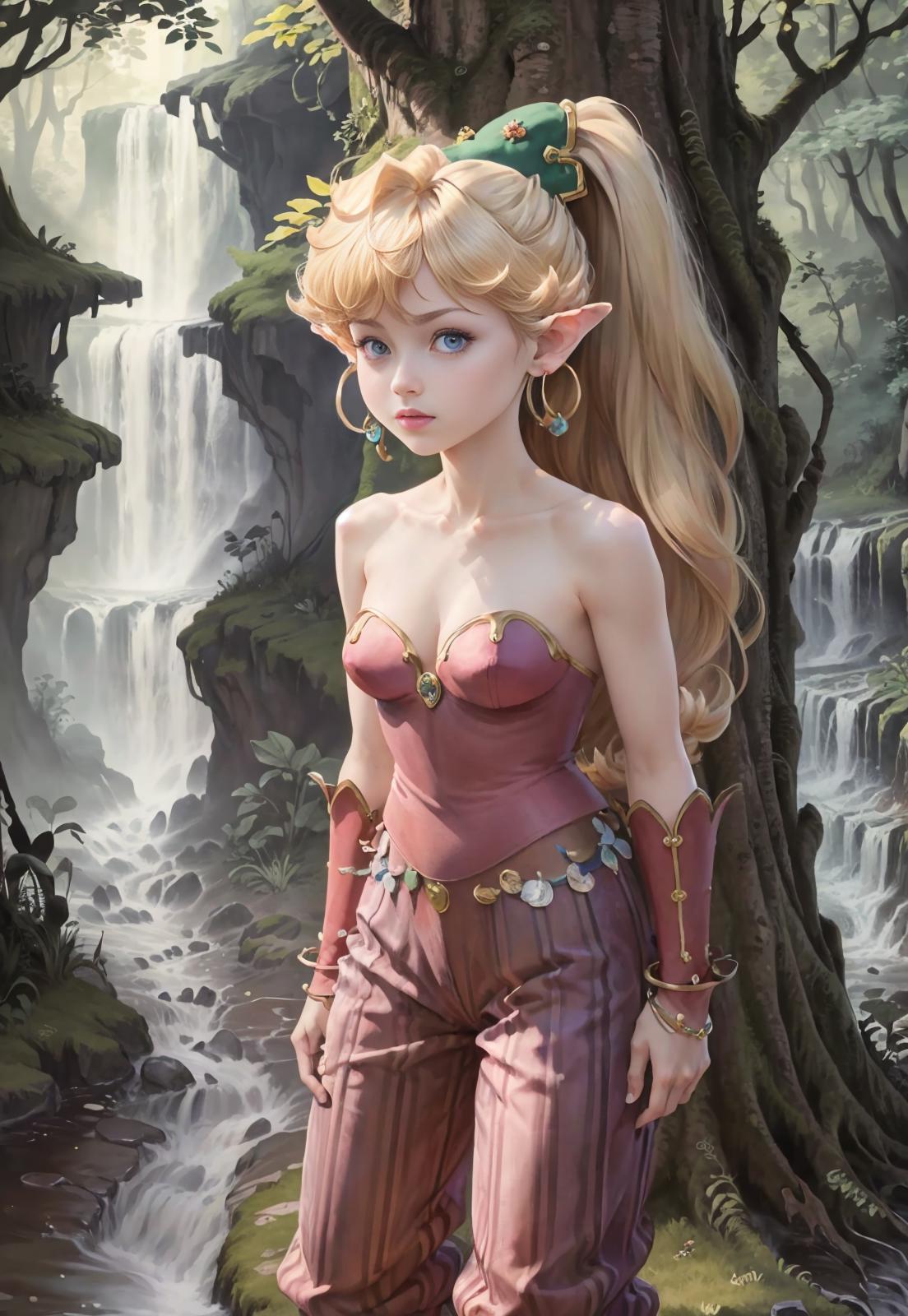 Default Outfit: pants, jewelry, earrings, bare shoulders, cleavage