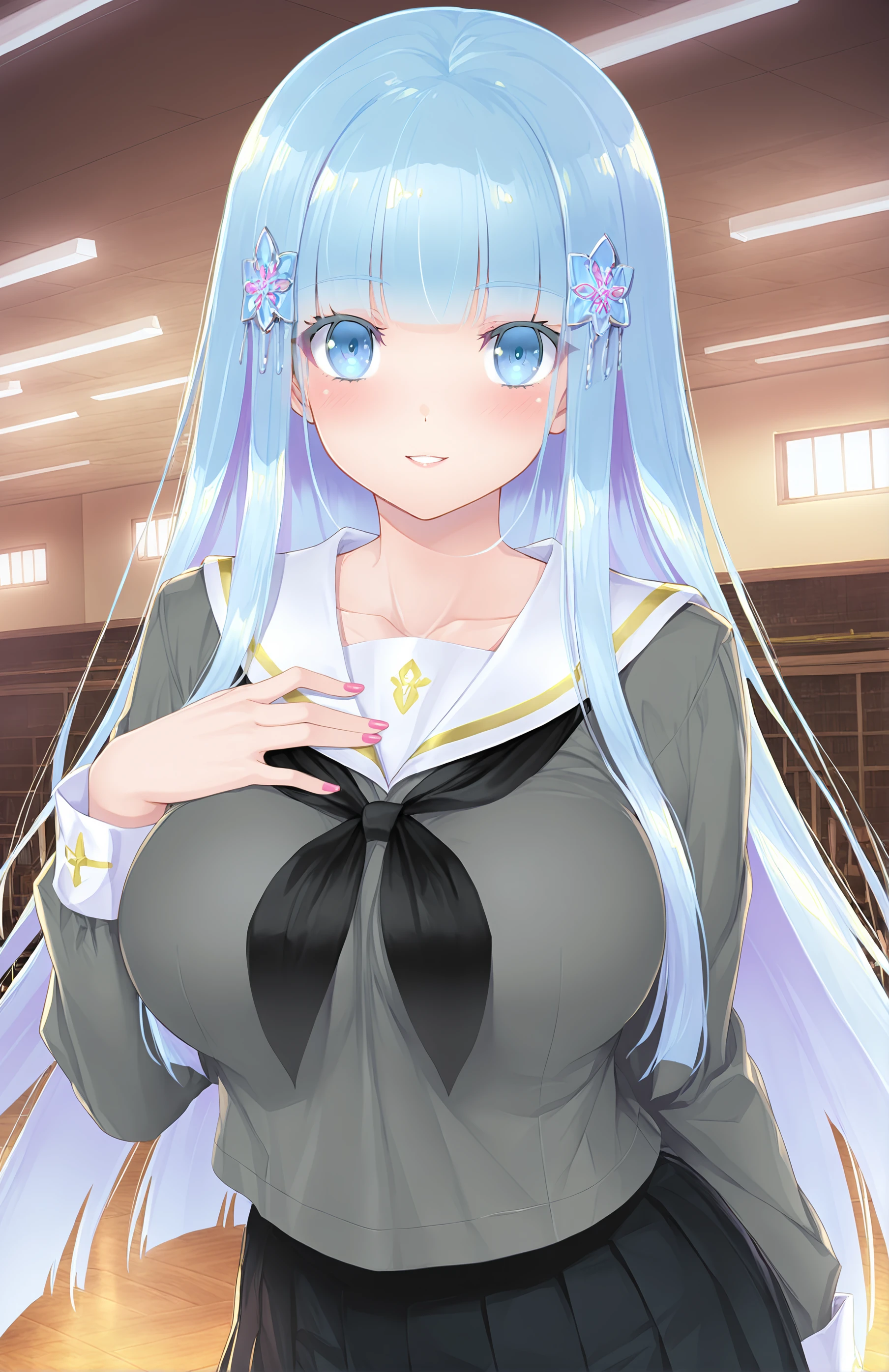 ShirayukiHime, long hair, breasts, bangs, blue eyes, skirt, large breasts, hair ornament, long sleeves, school uniform, blue hair, collarbone, pleated skirt, serafuku, blunt bangs, black skirt, sailor collar, nail polish, neckerchief, pink nails, grey shirt, white sailor collar, black neckerchief