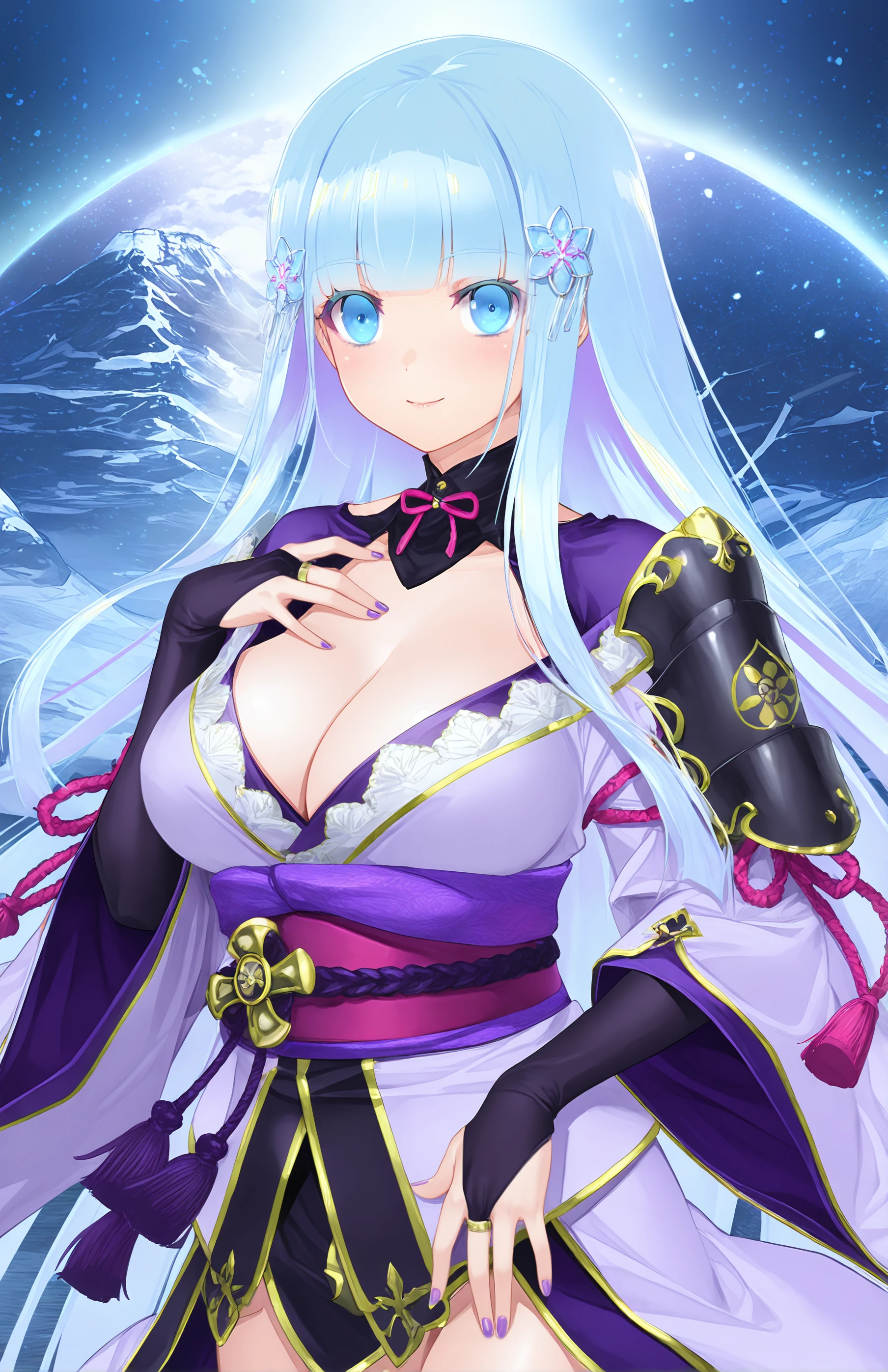 ShirayukiHime, long hair, breasts, bangs, blue eyes, large breasts, hair ornament, long sleeves, cleavage, blue hair, japanese clothes, wide sleeves, blunt bangs, kimono, nail polish, armor, sash, cosplay, obi, shoulder armor, bridal gauntlets, purple nails, purple kimono