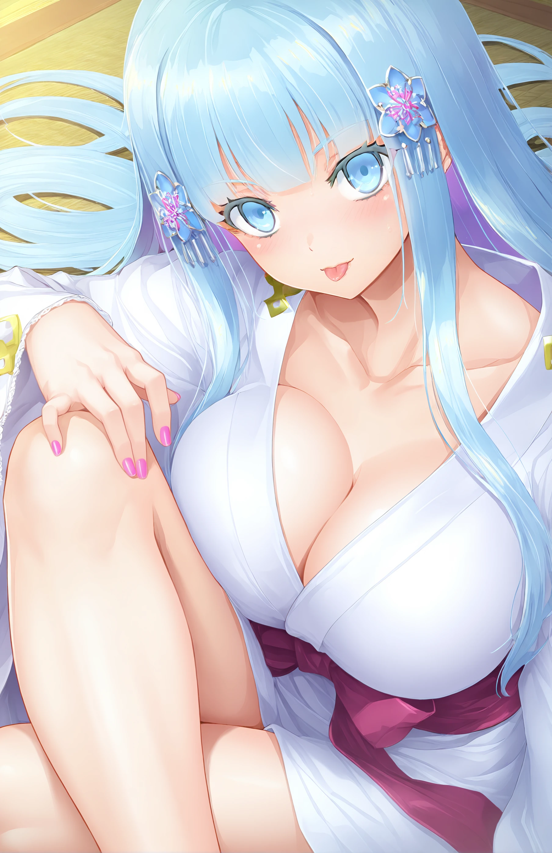 ShirayukiHime, long hair, breasts, bangs, blue eyes, large breasts, hair ornament, cleavage, blue hair, collarbone, japanese clothes, white kimono, nail polish, pink nails