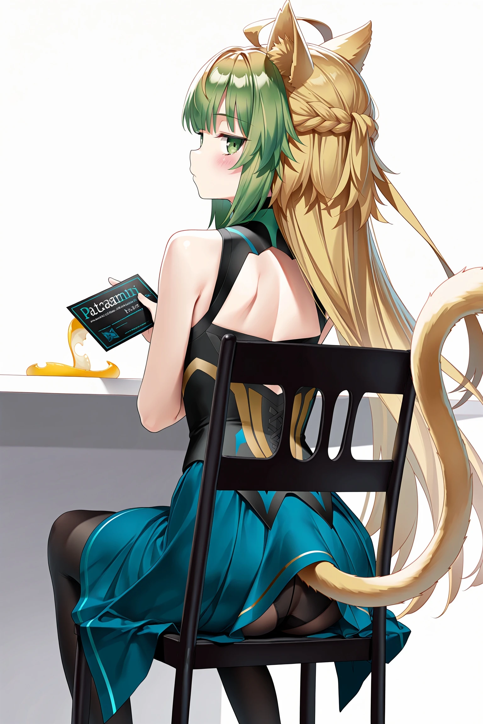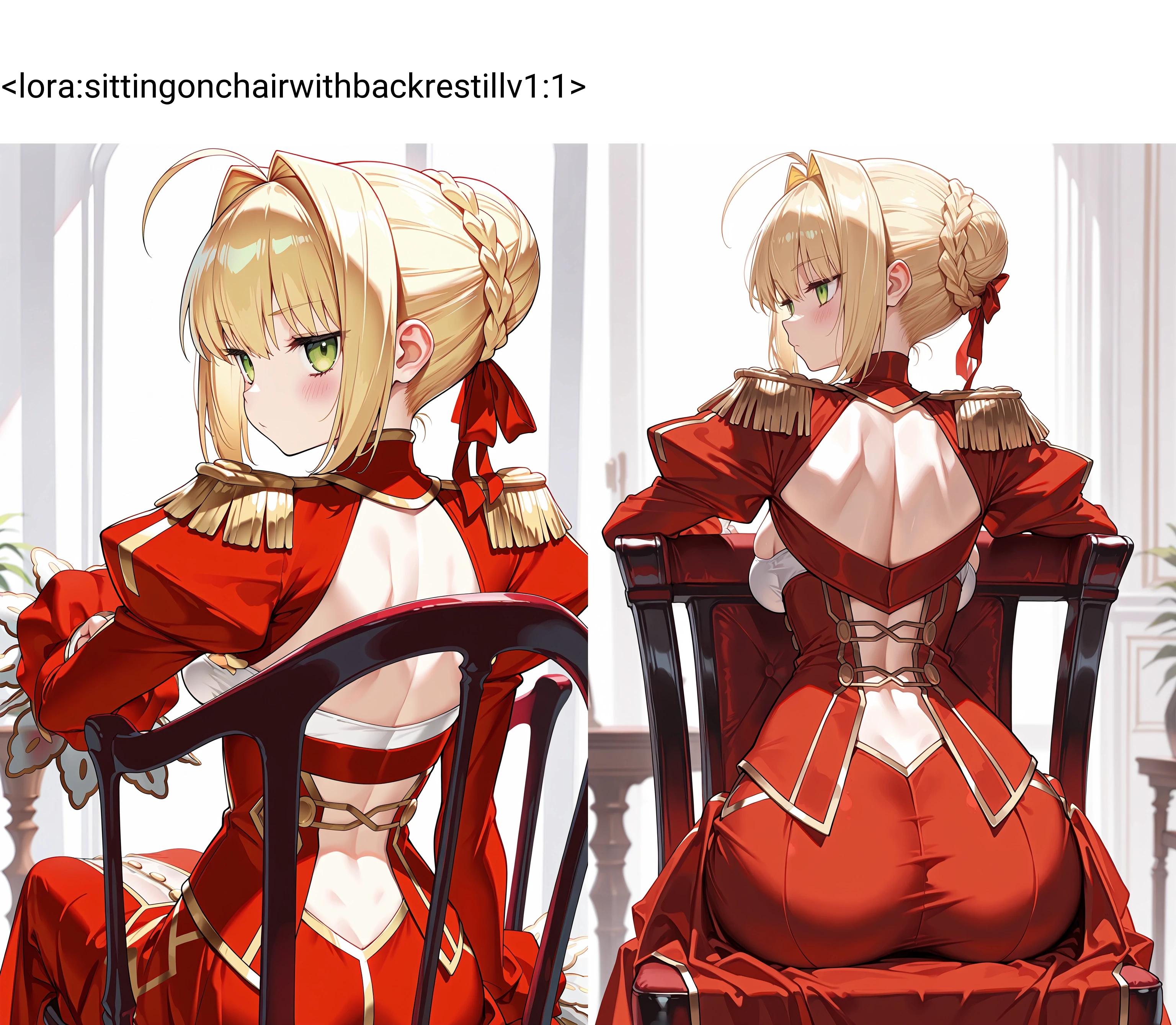 トリガーワードは設定してないので、sitting, from behind辺りのワードで背もたれをちゃんと出してくれるようになってるはずです