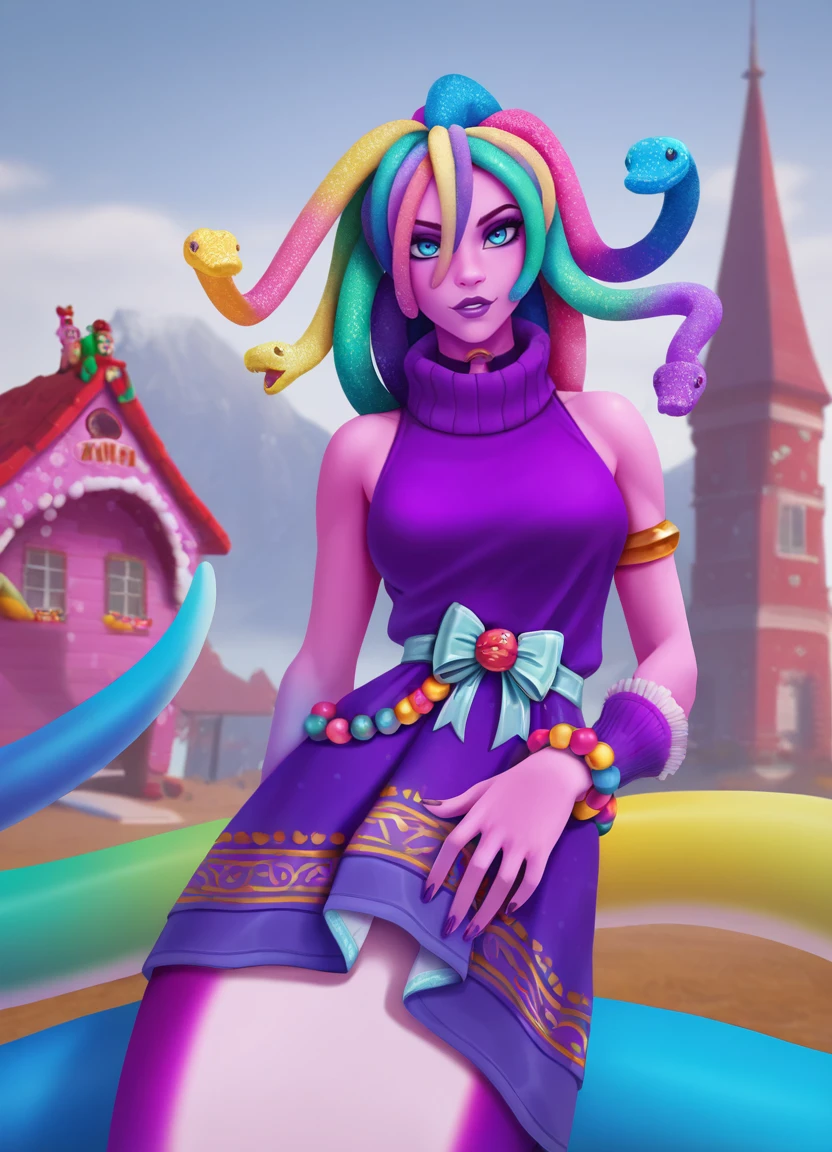 armlet, blue eyes, multicolored hair, strapless, waist ribbon