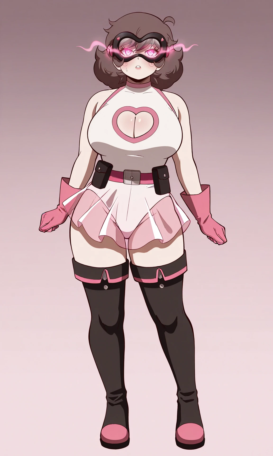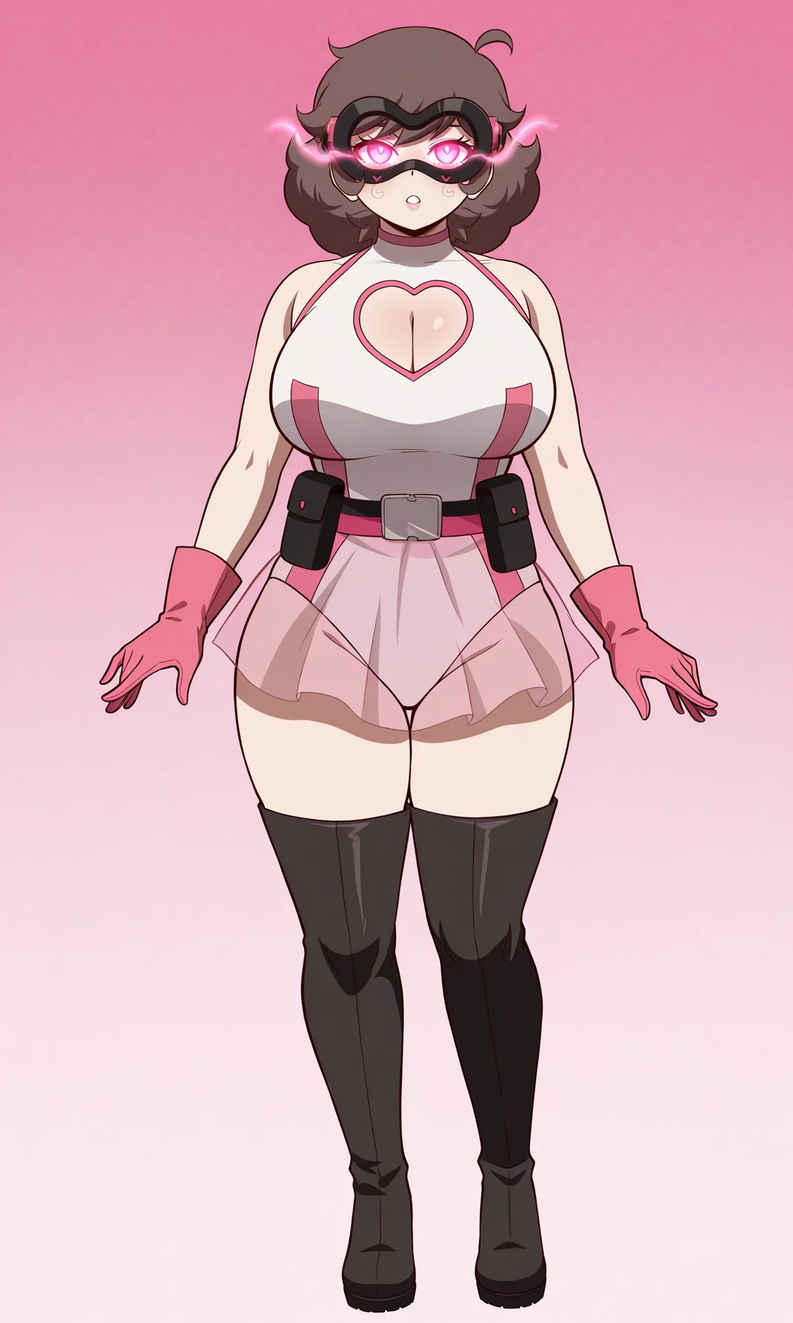 Outfit Heroe: skirt, gloves, thighhighs, cleavage, bare shoulders, ahoge, boots, belt, black thighhighs, pink eyes, black footwear, leotard, clothing cutout, mask, thigh boots, cleavage cutout, glowing eyes, white leotard, pink gloves, heart cutout, domino mask, eye mask, see-through skirt, pink belt, see-through, goggles