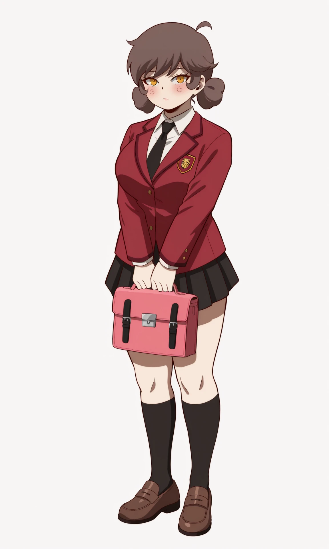 Young outfit: shirt, skirt, long sleeves, holding, jacket, school uniform, white shirt, ahoge, pleated skirt, necktie, shoes, collared shirt, socks, black skirt, miniskirt, bag, kneehighs, brown footwear, black socks, blazer, loafers, black necktie, red jacket, shoulder bag, emblem, holding bag, pink bag, red bag