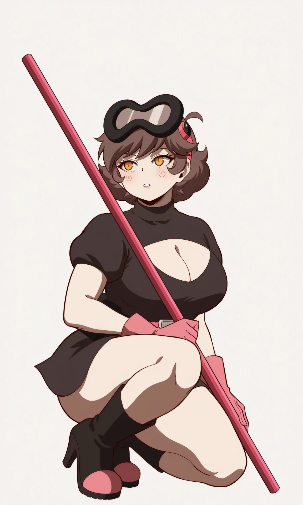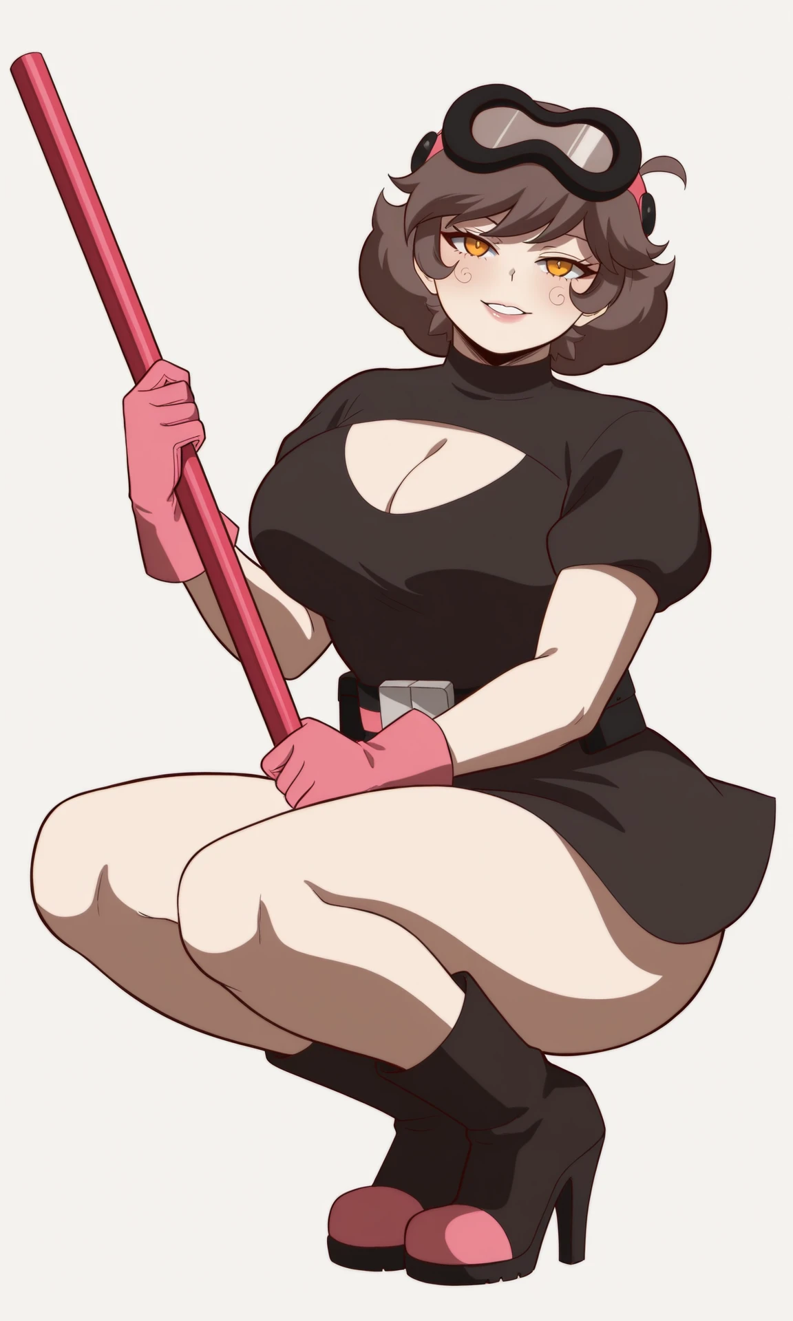 Outfit villain: gloves, dress, cleavage, short sleeves, boots, belt, black dress, high heels, clothing cutout, short dress, cleavage cutout, goggles, high heel boots, goggles on head, pink footwear, pink gloves, pink belt, hair ornament, black footwear, mask, mask on head