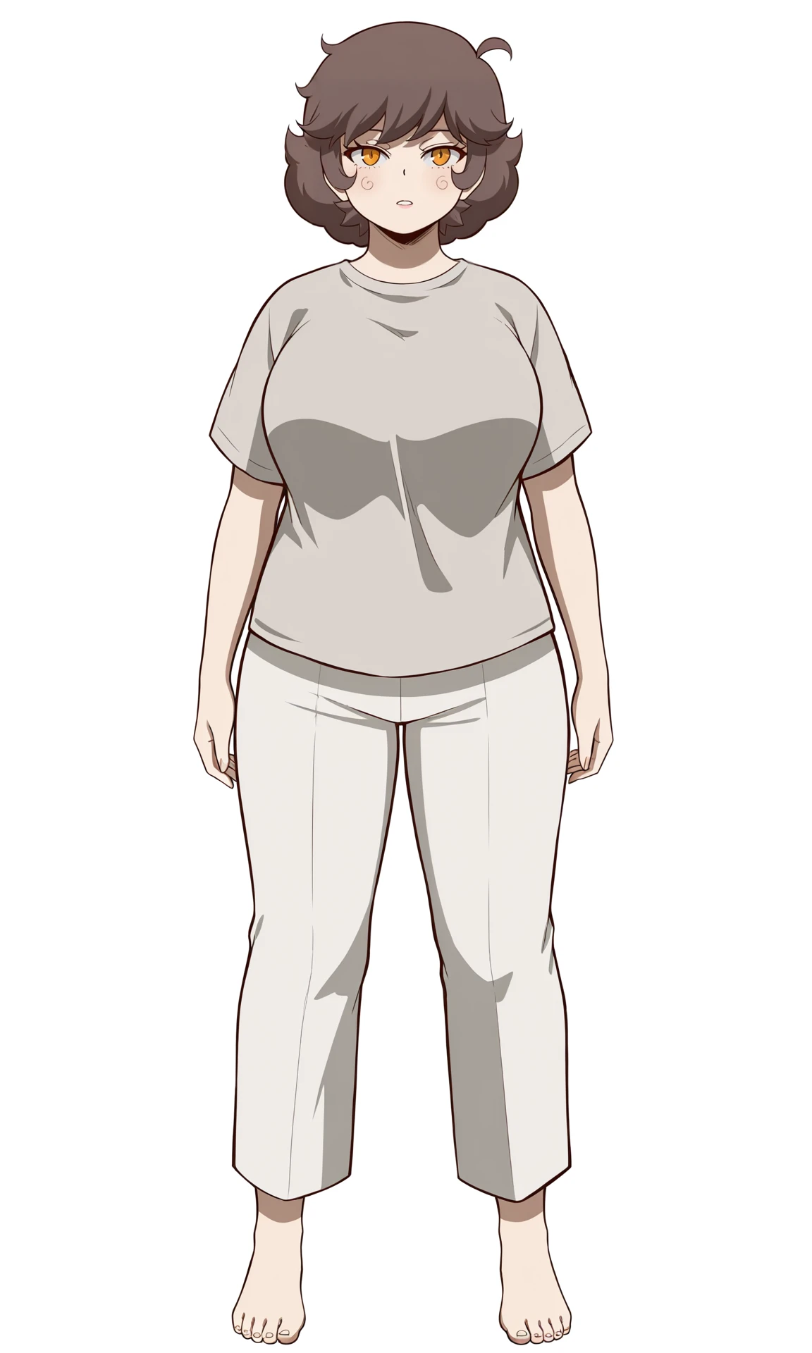 Young-Adult: R1asM, breasts, medium hair, messy hair, large breasts, brown hair, thighs, parted lips, yellow eyes, orange eyes,