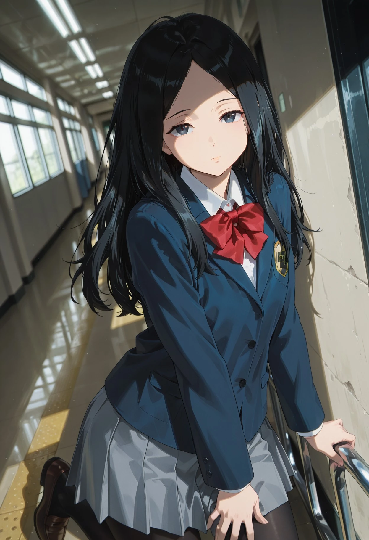 school uniform, blue blazer, white collared shirt, long sleeves, red bow, grey skirt, pleated skirt, black pantyhose, brown footwear,
