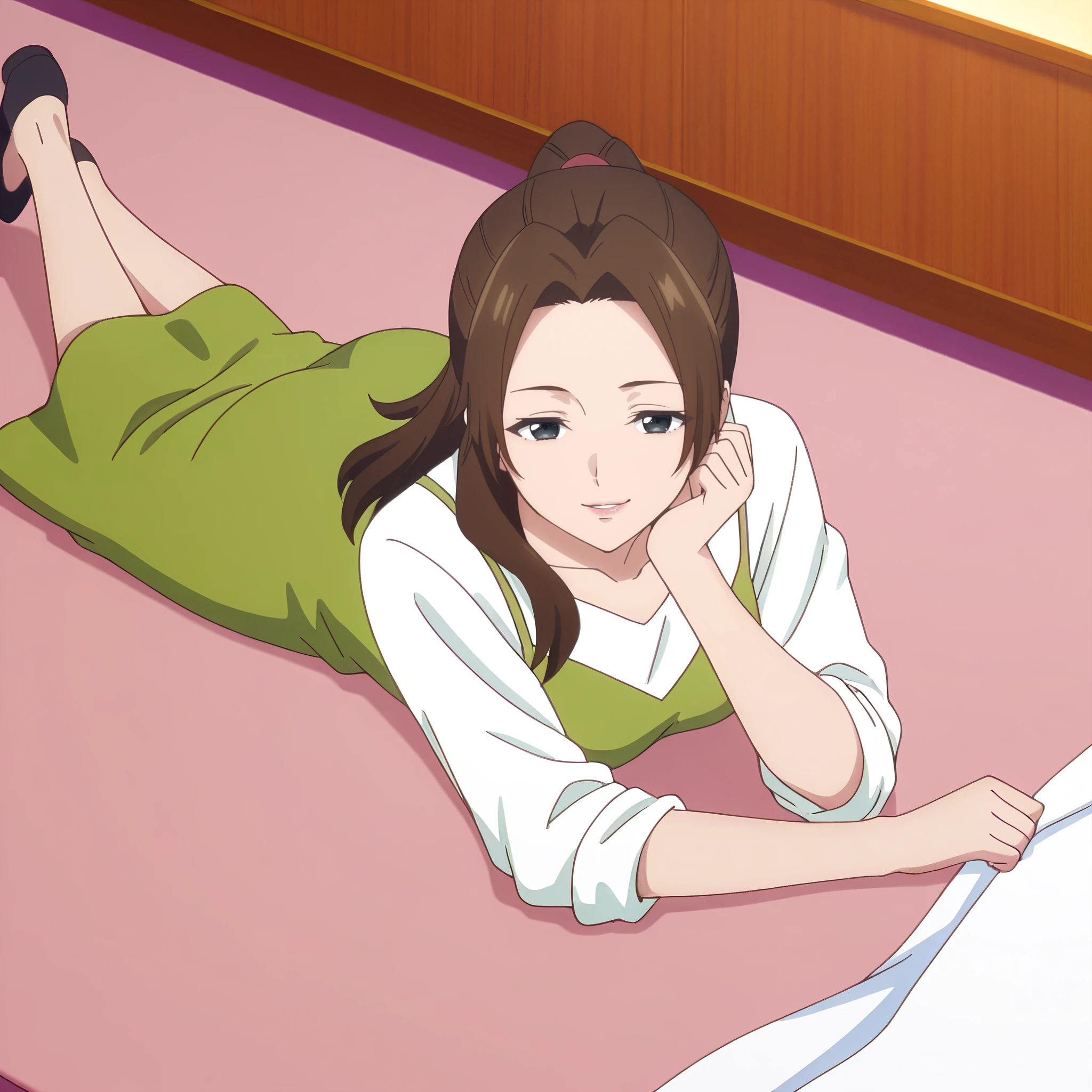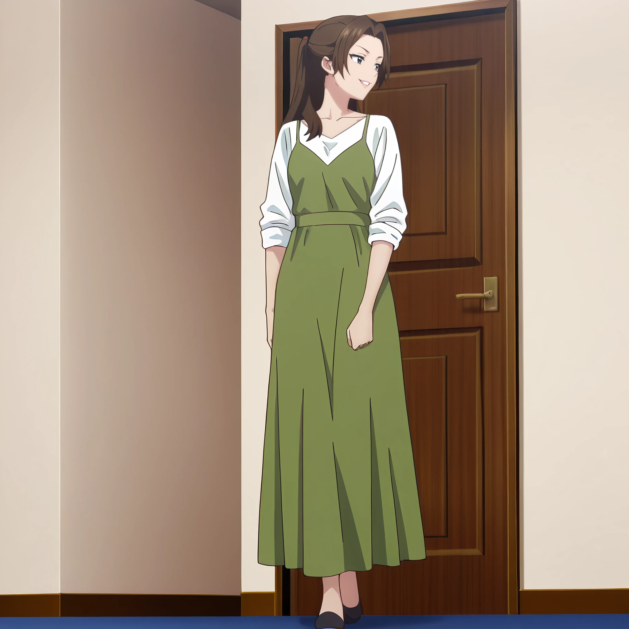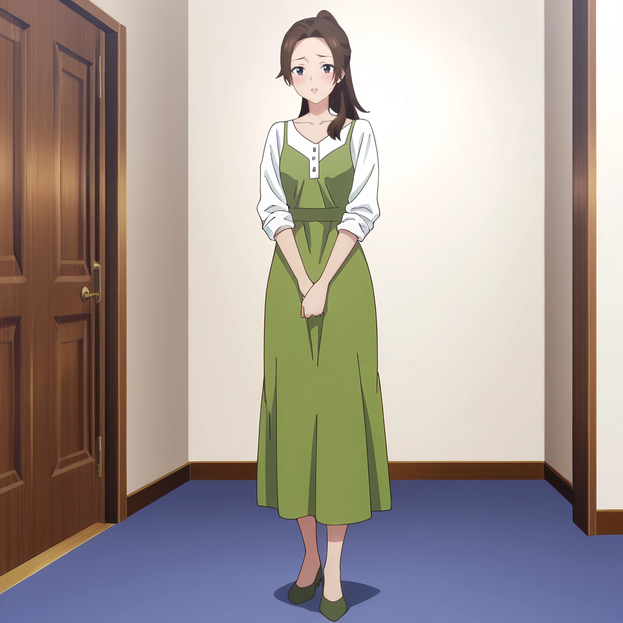 MomokaDress, shirt, white shirt, sleeves rolled up, long sleeves, collarbone, green dress,