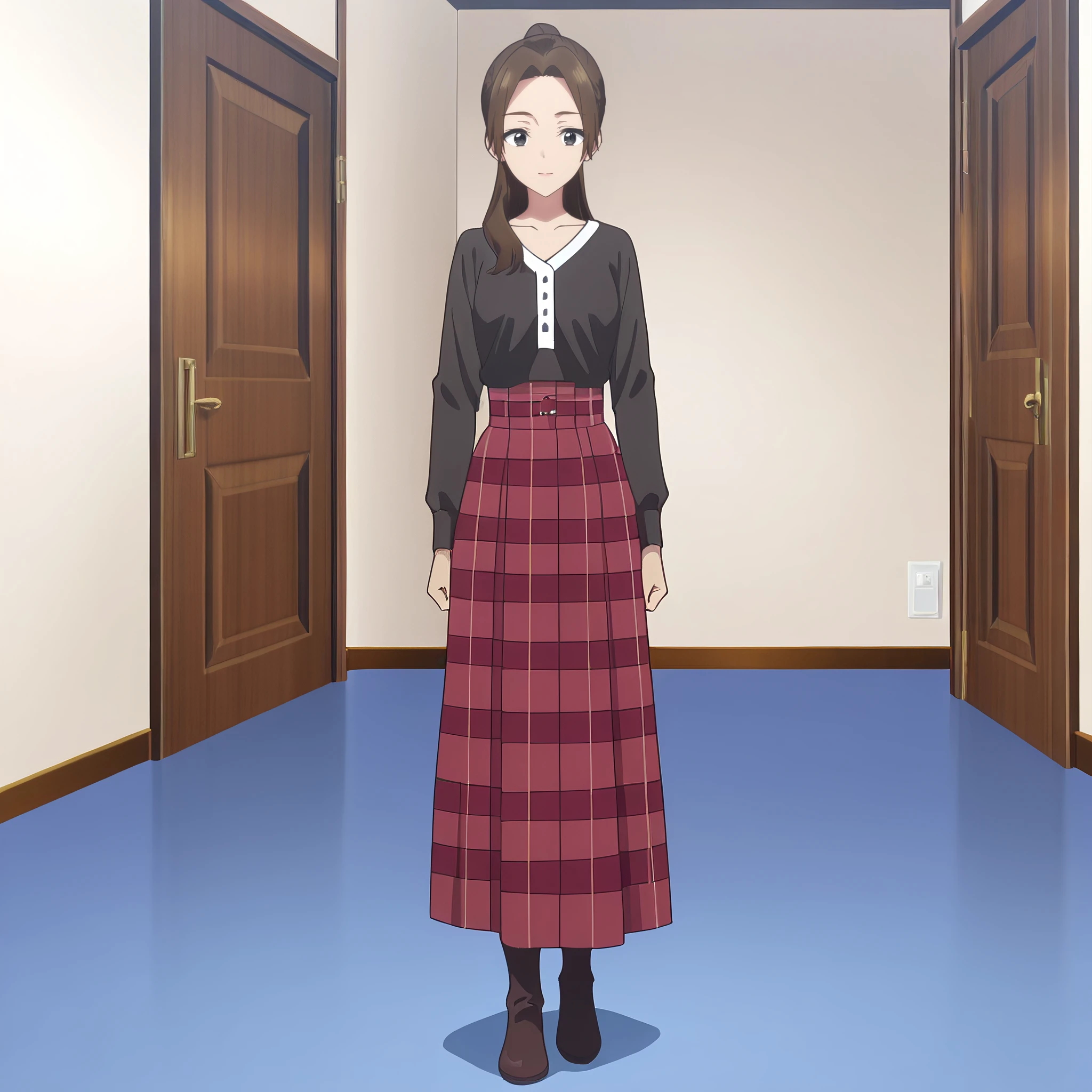 MomokaShirt, shirt, collarbone, long sleeves, black shirt, skirt, red skirt, checkered, plaid, dress shirt,