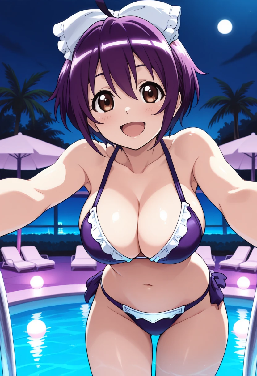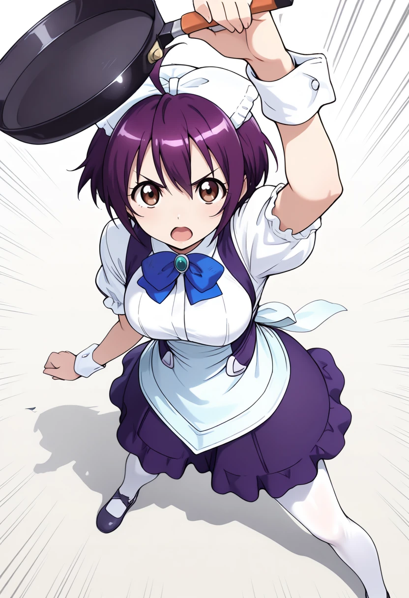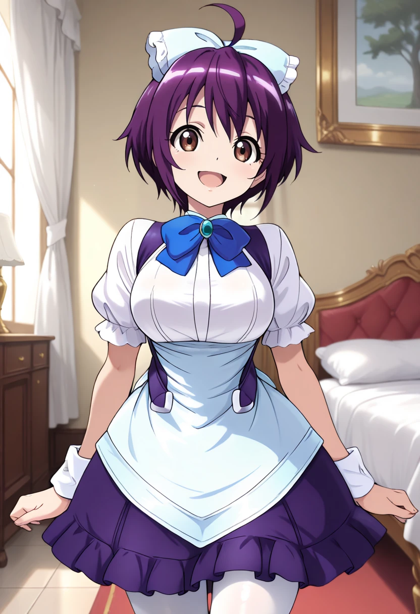maid, hair ribbon, apron, blue bow tie, purple skirt, puffy short sleeves, wrist cuffs, white pantyhose, purple hair, short hair, ahoge, brown eyes