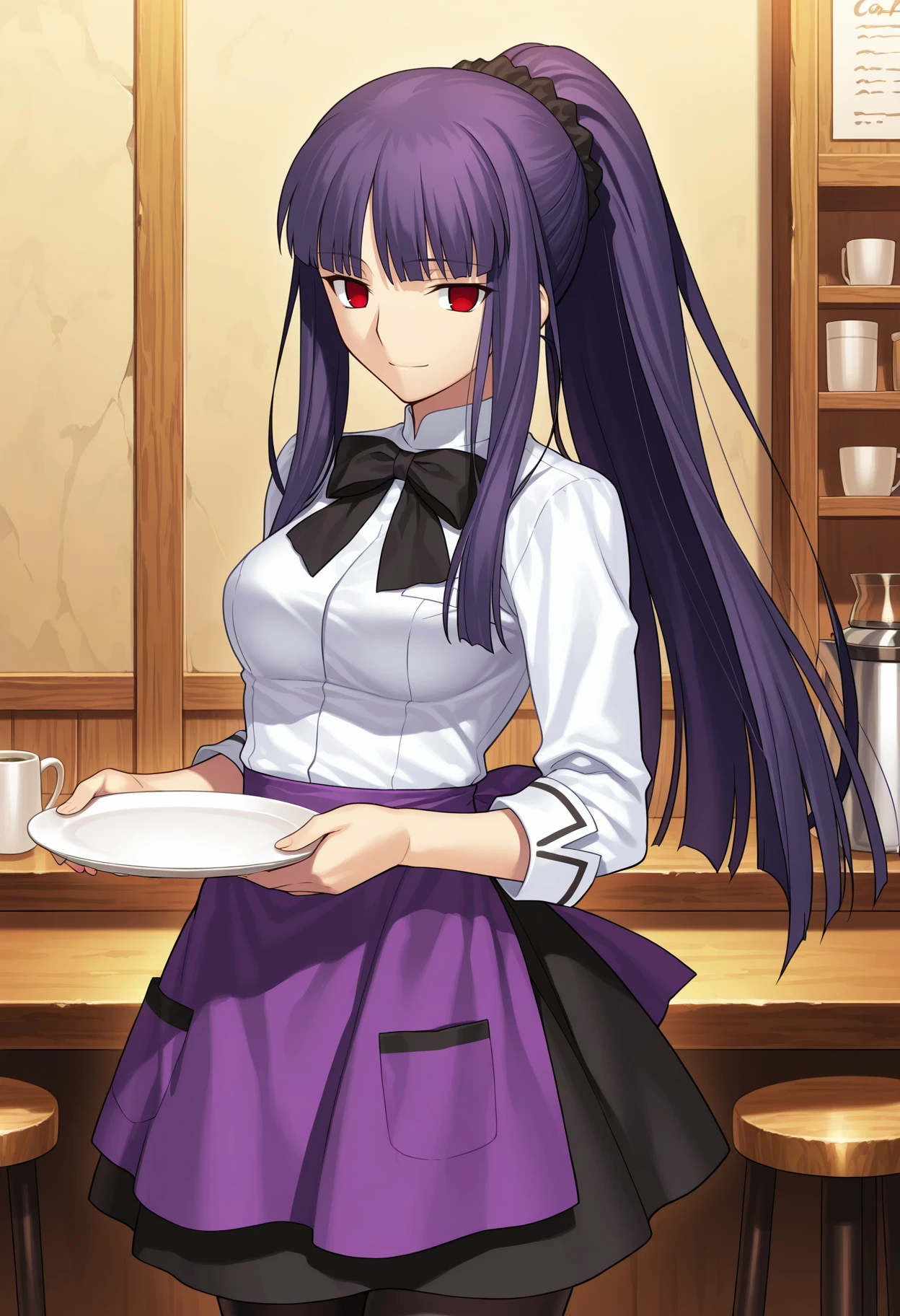 Waitress: a_fujino, 1girl, retro artstyle, long hair, ponytail, purple hair, hime cut, hair scrunchie, red eyes, empty eyes, fujino waitress, white shirt, black bow, fujino purple high-waist apron, black skirt, black pantyhose, long sleeves, black bowtie, medium breasts,