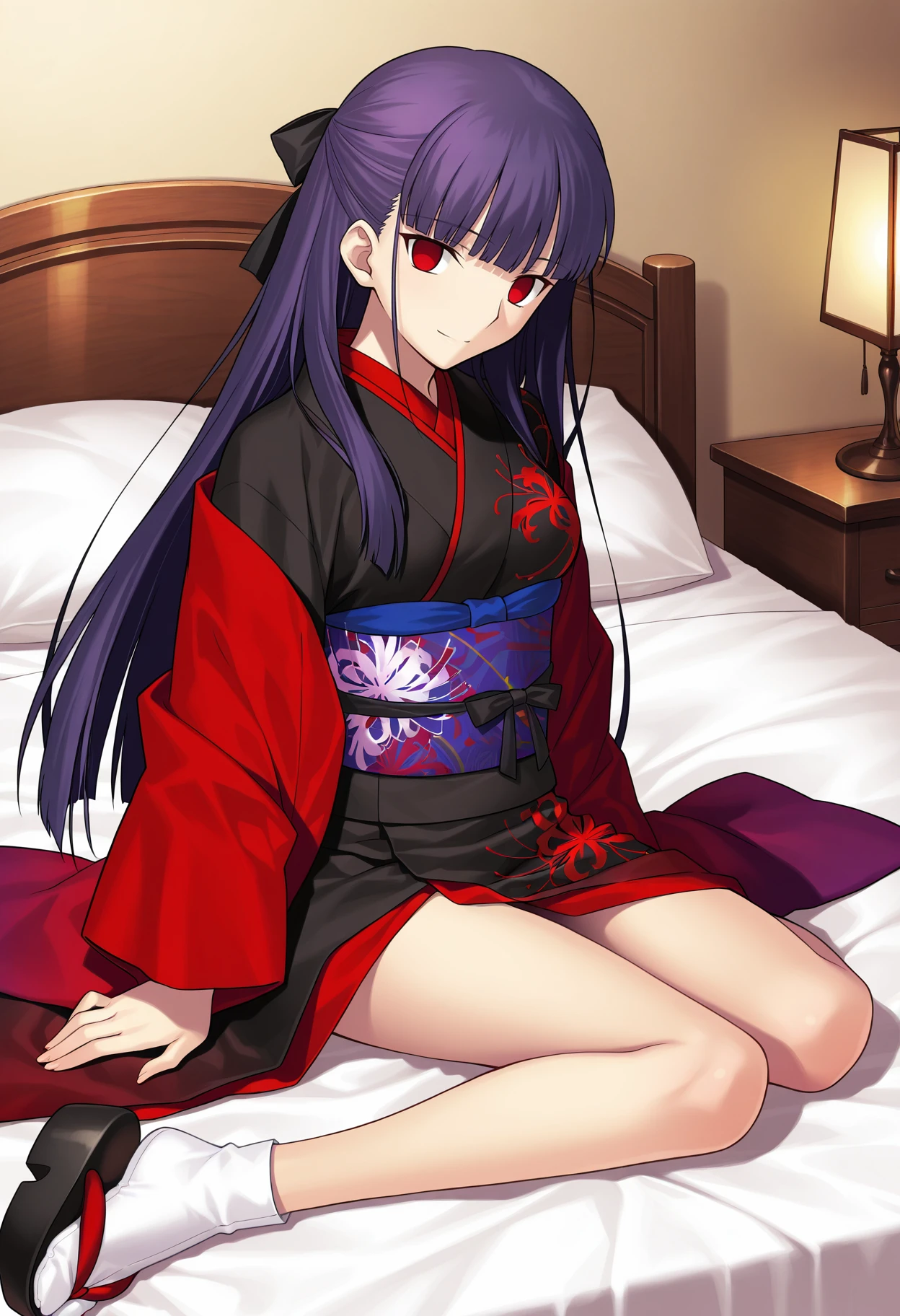 Kimono: a_fujino, 1girl, retro artstyle, solo, long hair, purple hair, blunt bangs, half updo, hair bow, long sidelocks, black bow, red eyes, empty eyes, fujino black red kimono, japanese clothes, spider lily print kimono, two-tone kimono, fujino red purple shawl, fujino sash, black ribbon, medium breasts,
